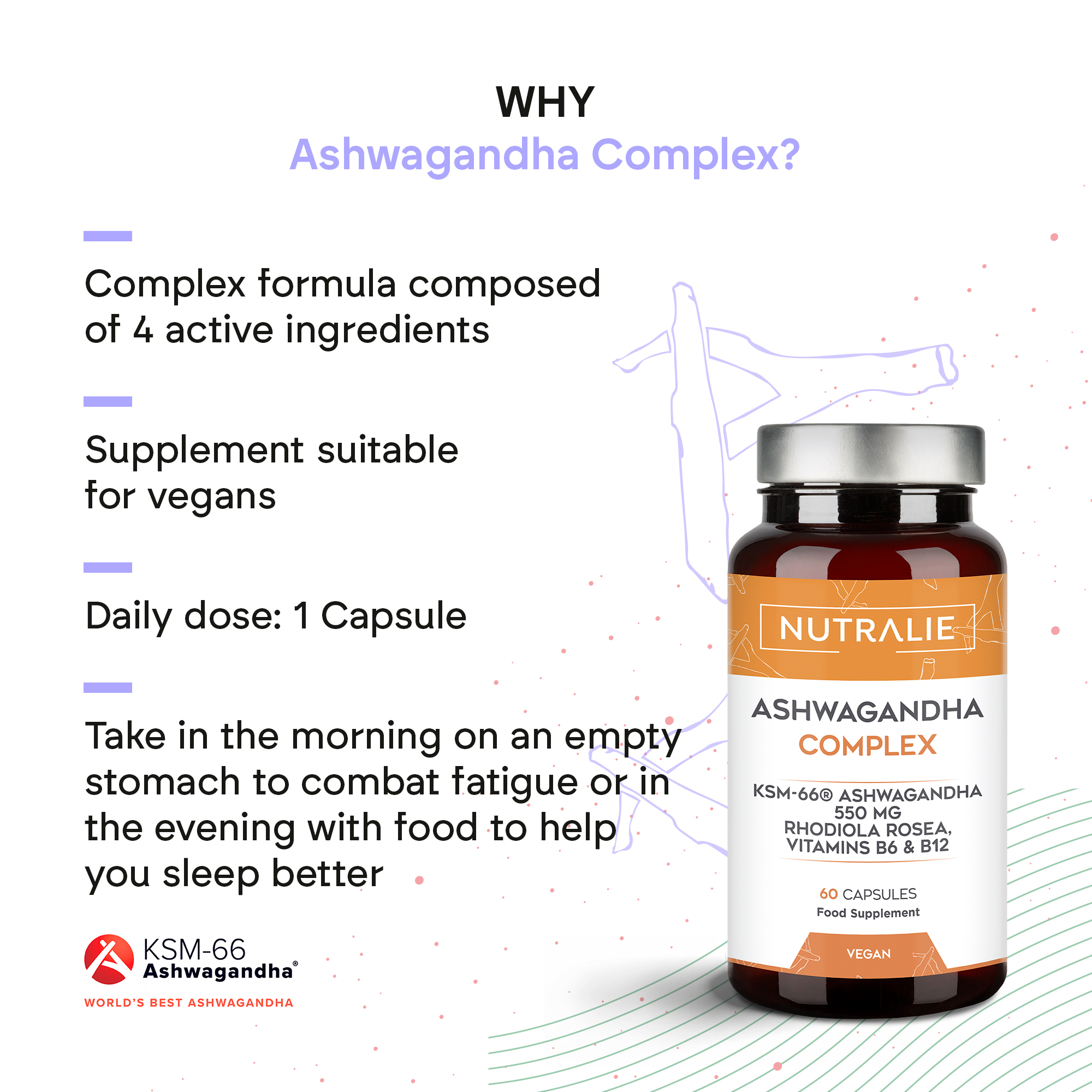 Nutralie’s Ashwagandha Complex contains 550 mg of Ashwagandha KSM-66®, a registered ingredient that offers a unique Ashwagandha root extract with the highest concentration of bioactive compounds and more than 40 quality certifications. Ashwagandha is a traditional Indian herb, also known as Withania Somnifera, widely used in Ayurvedic medicine. This formula also contains vitamins B6 and B12.