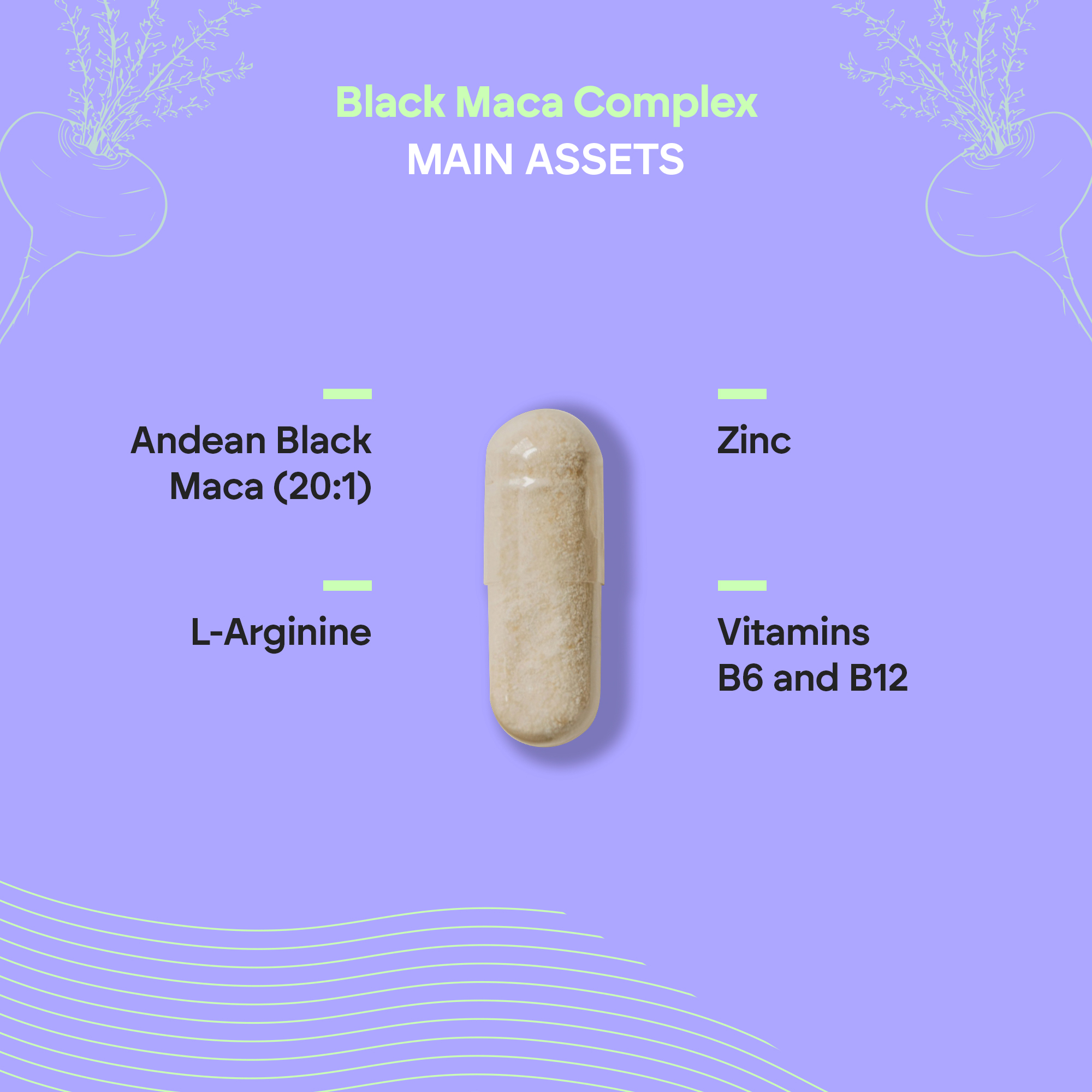 Our Black Maca Complex capsules contain Andean black maca, L-arginine, zinc and vitamins. Zinc contributes to the maintenance of normal testosterone levels, as well as normal fertility and reproduction.