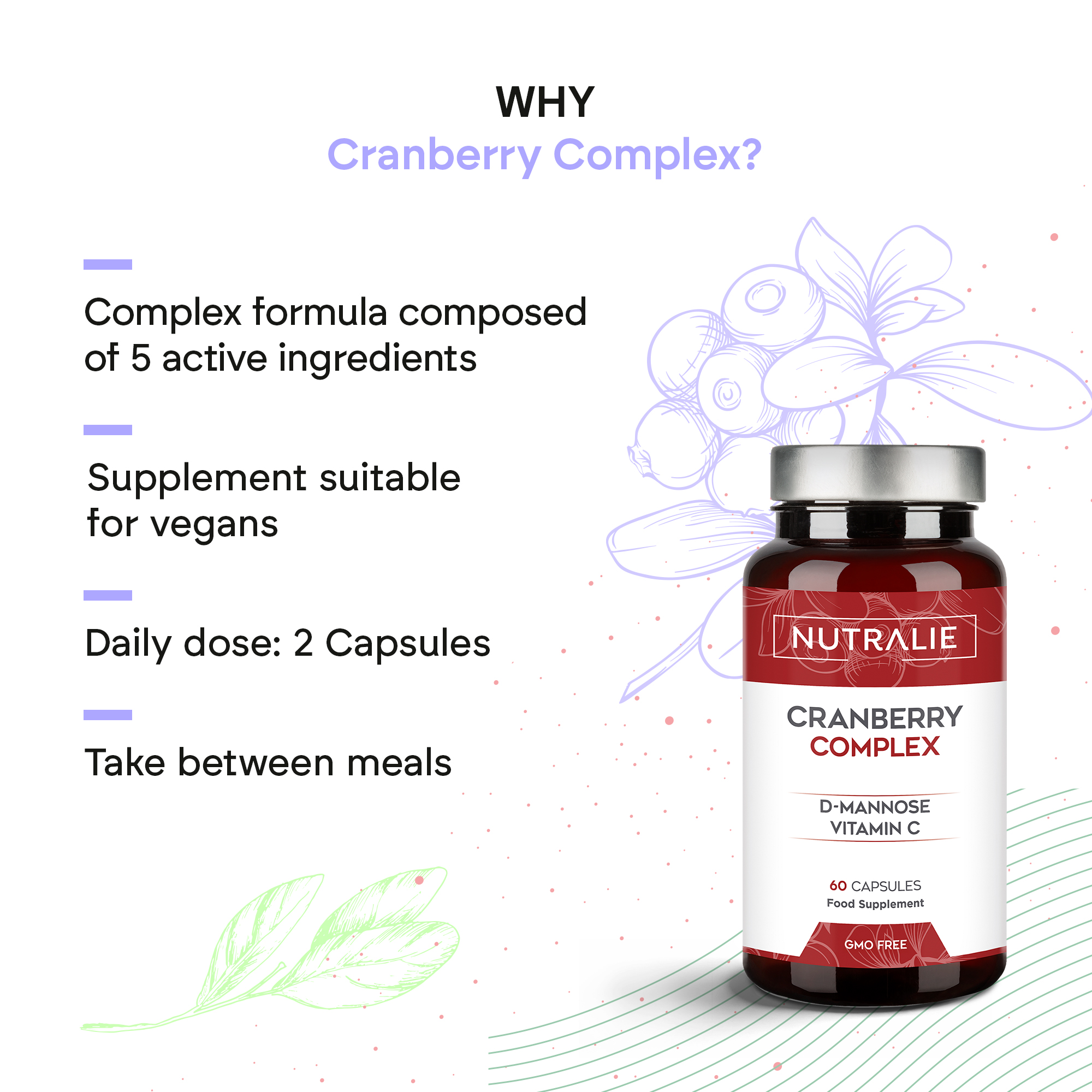 Nutralie Cranberry Complex features 350 mg of North American cranberry, of which 140 mg are proanthocyanidins.