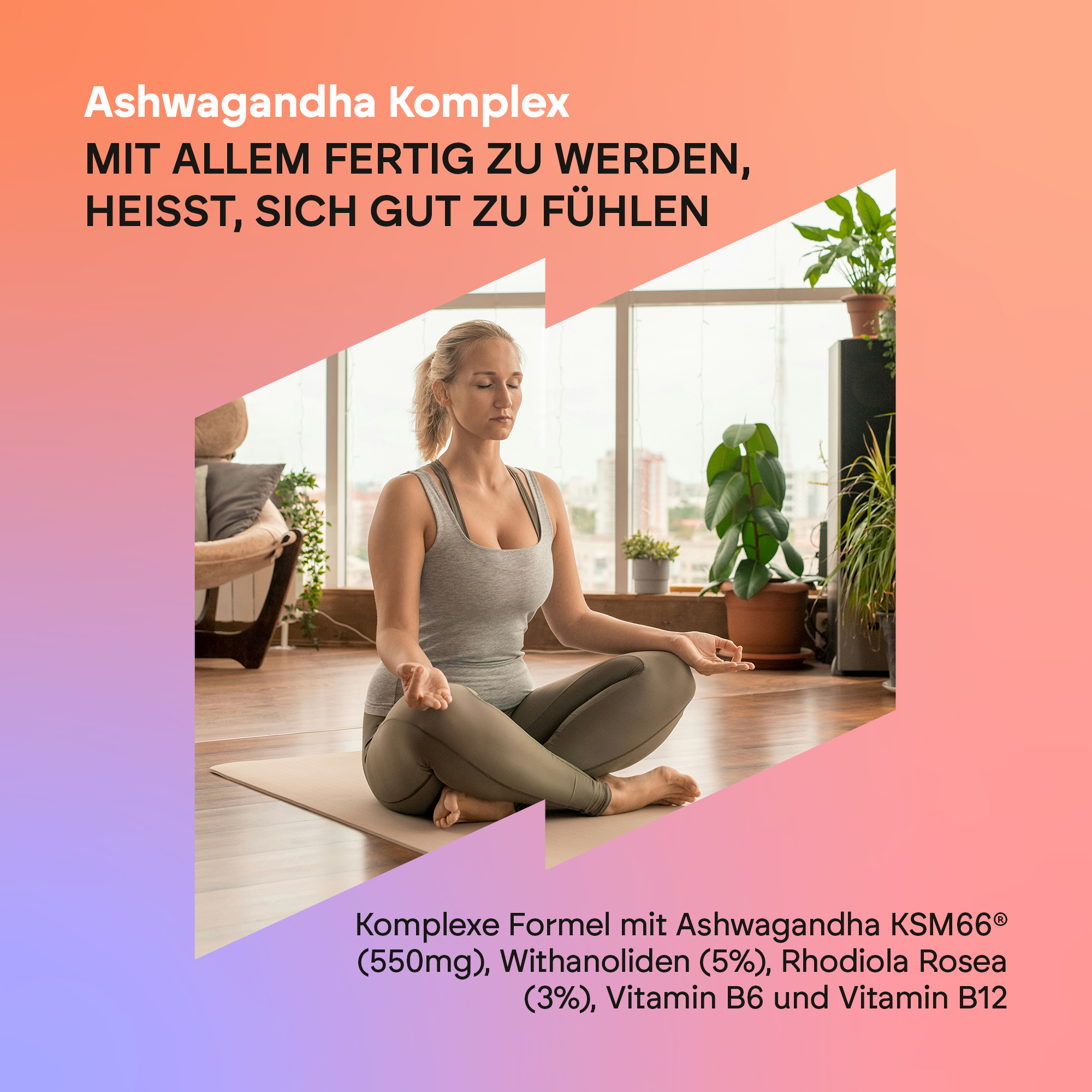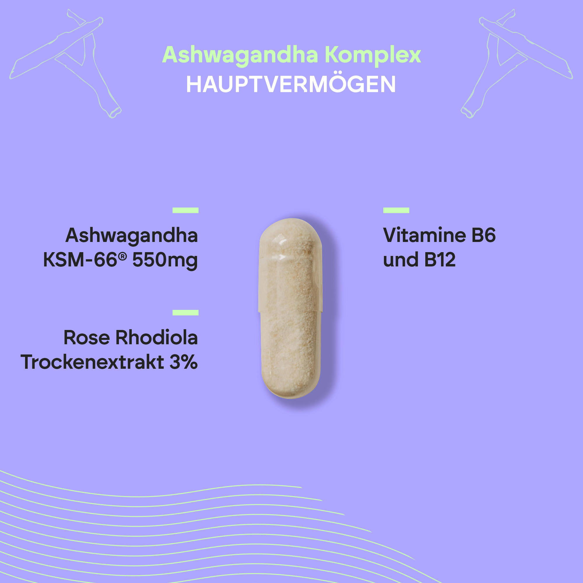 Ashwagandha Complex von Nutralie zeichnet sich durch einen Gehalt von 550 mg Ashwagandha KSM-66® aus, einem registrierten Inhaltsstoff, der den einzigartigen Extrakt aus der Ashwagandha-Wurzel mit der höchsten Konzentration an bioaktiven Substanzen enthält und über mehr als 40 Qualitätszertifikate verfügt. Ashwaganda ist ein traditionelles indisches Kraut, auch bekannt als Withania Somnifera, das in der ayurvedischen Medizin häufig verwendet wird. Diese Formel enthält außerdem Vitamin B6 und B12.