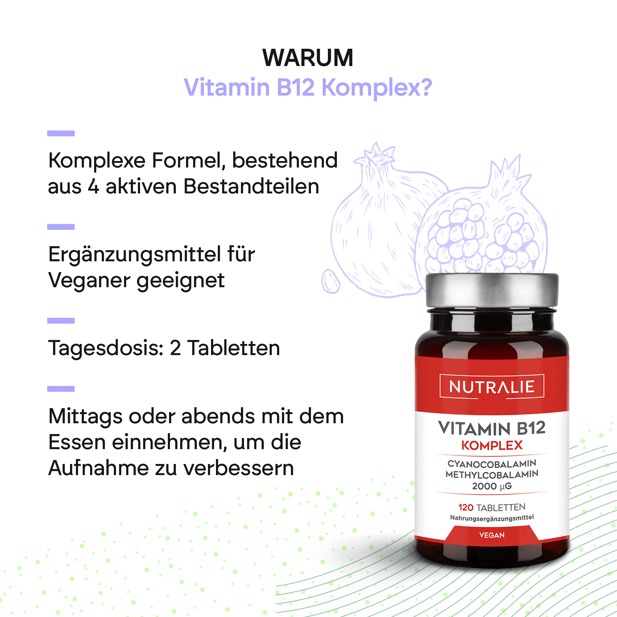 Vitamin B12 Complex von Nutralie enthält Vitamin B12 und Vitamin B6, die zur normalen Bildung roter Blutkörperchen beitragen.