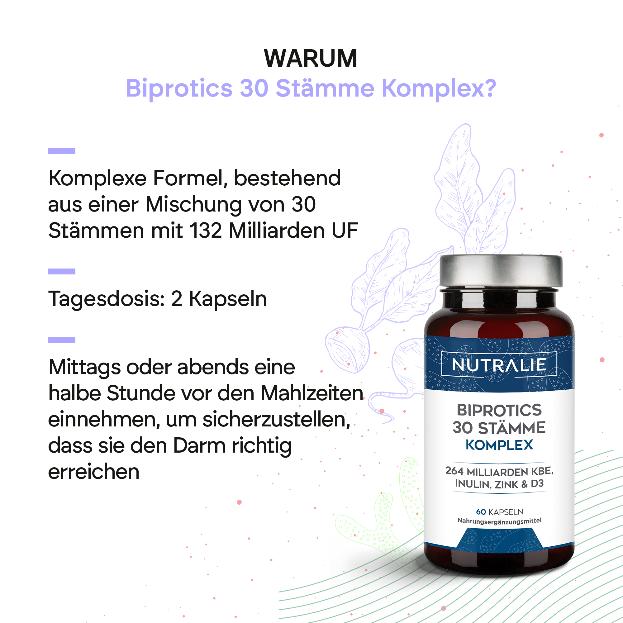 Biprotics 30 Cepas Complex von Nutralie zeichnet sich durch eine Kombination aus 30 Stämmen aus. Jede Dosis, bestehend aus zwei Kapseln, enthält 132 Milliarden KBE (koloniebildende Einheiten).