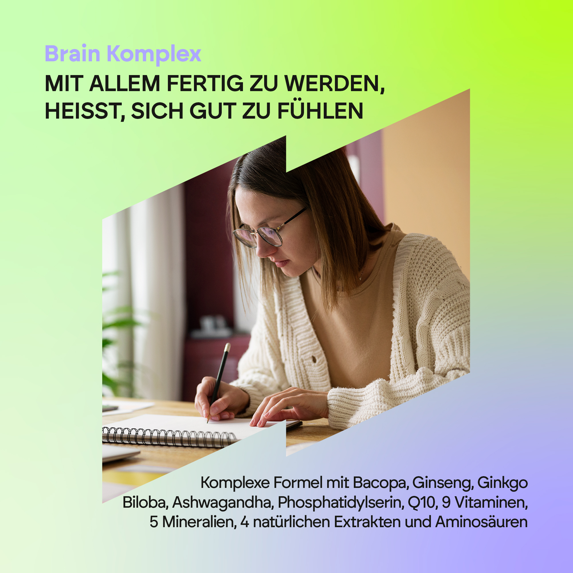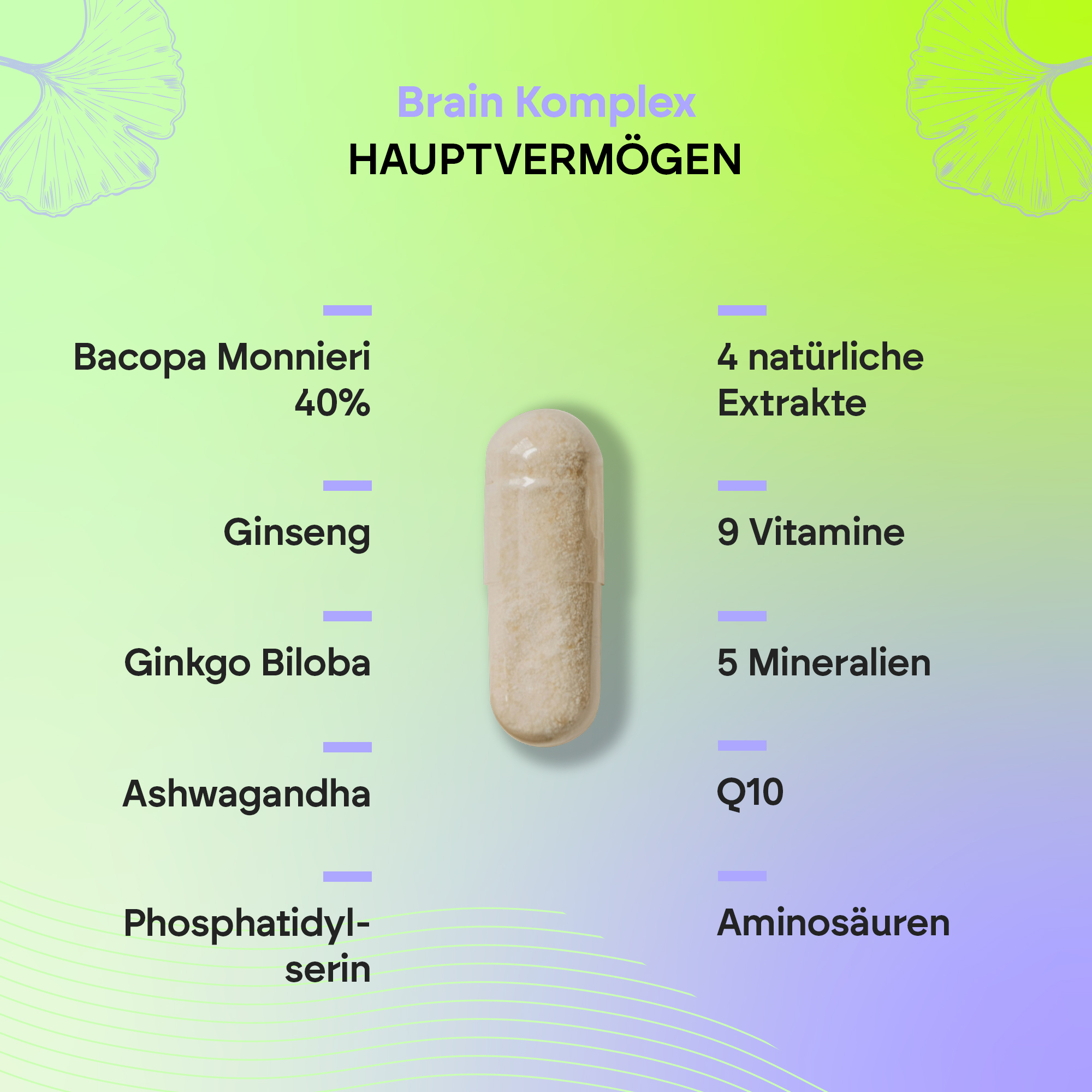 Brain Complex von Nutralie wurde mit 24 Wirkstoffen entwickelt, darunter Extrakte aus Bacopa Monnieri, Ginseng, Ginkgo Biloba, Ashwagandha, Phosphatidylserin, Coenzym Q10, 9 Vitaminen, 5 Mineralien und Aminosäuren.