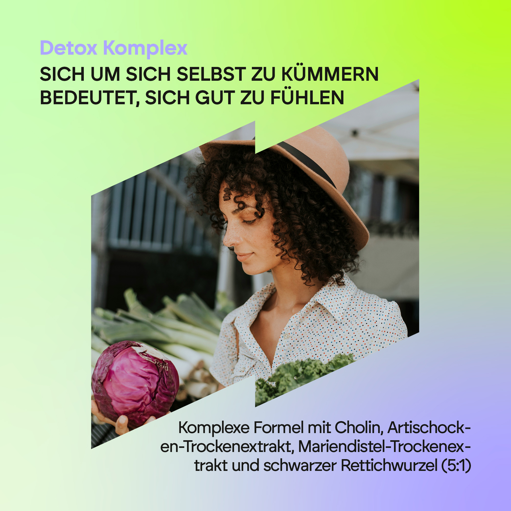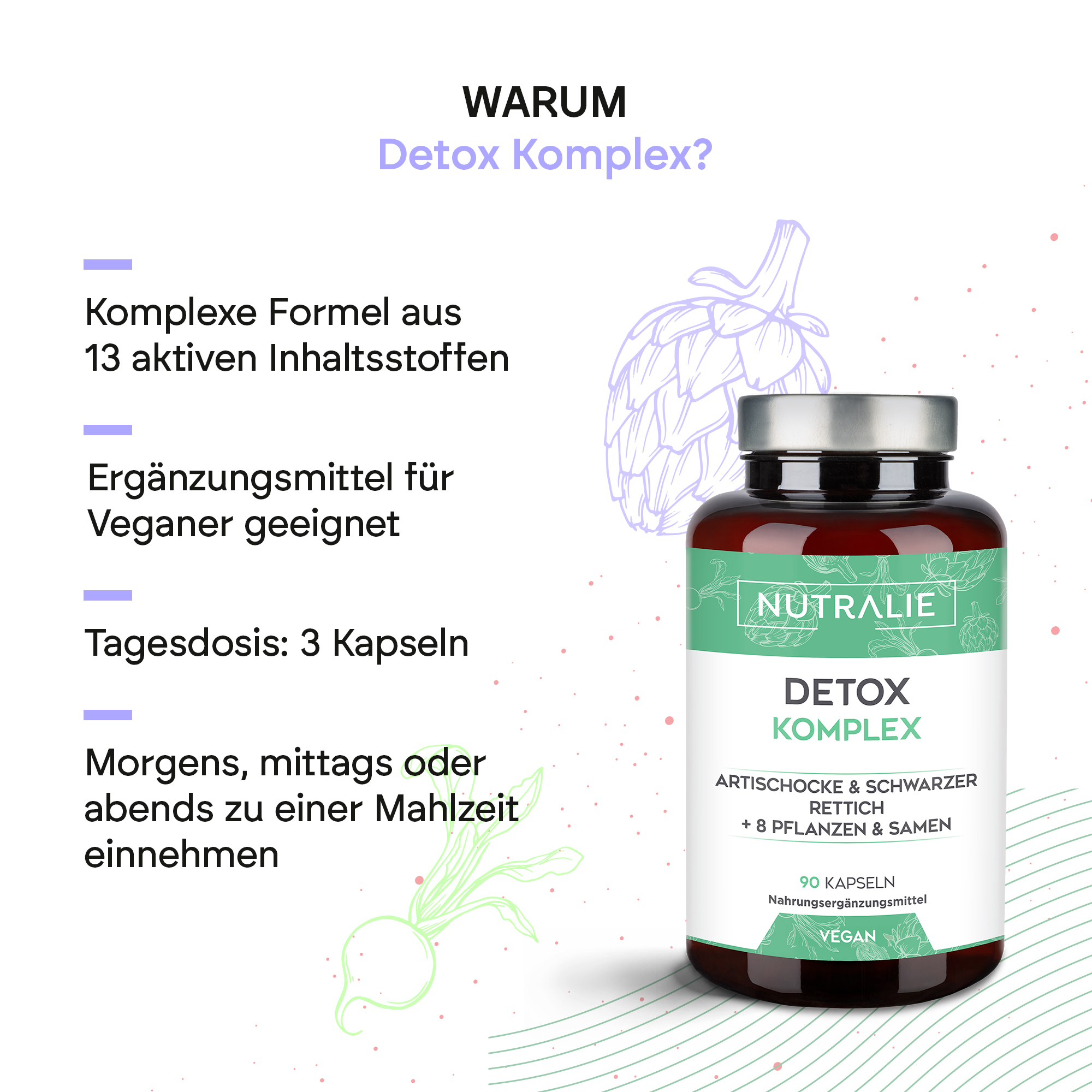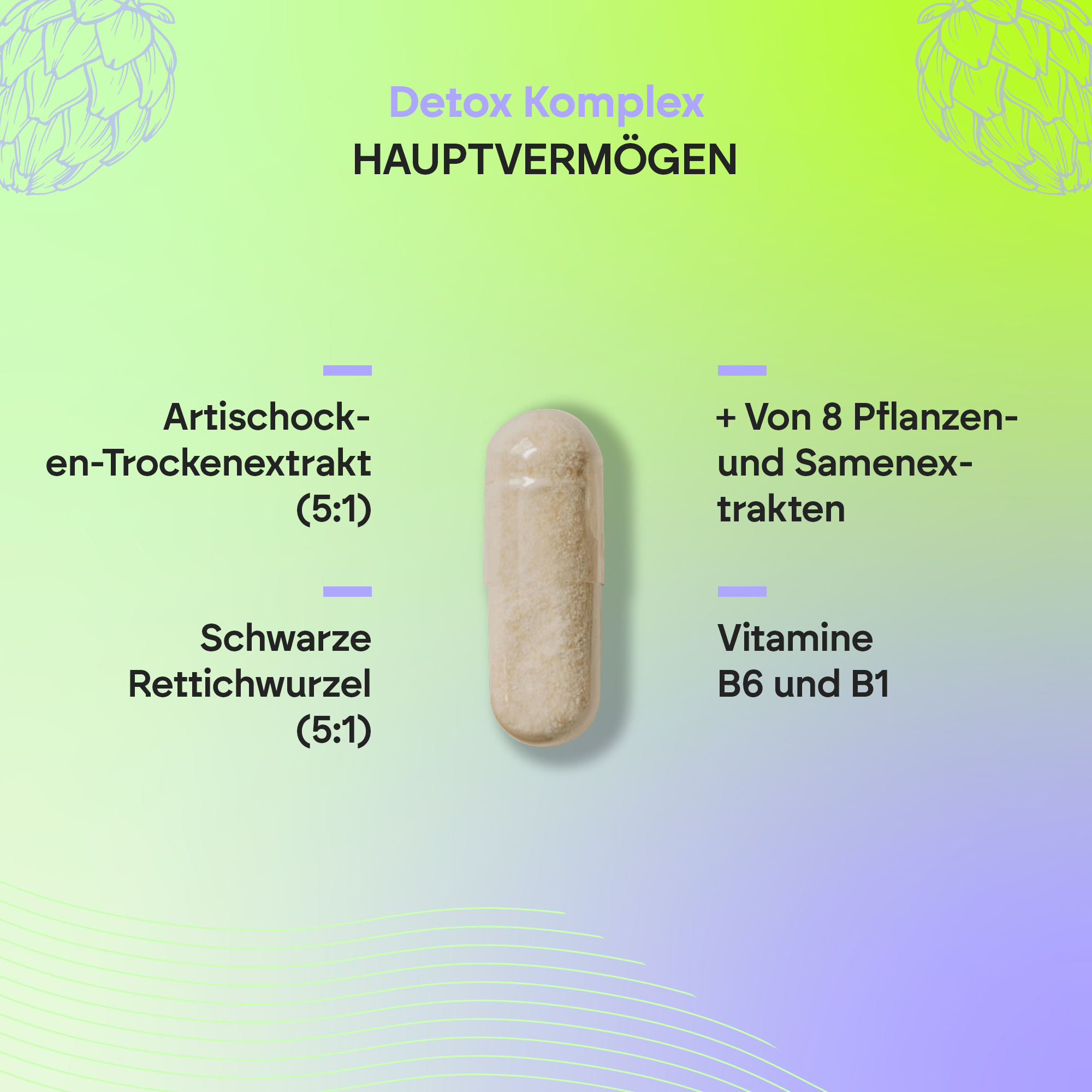 Unser Detox Complex besteht aus verschiedenen Pflanzen und Samen, darunter Artischocke und Schwarzer Rettich. Die natürliche Formel enthält außerdem Cholin sowie die Vitamine B1 (Thiamin) und B6. Letzteres trägt zu einem normalen Energiestoffwechsel bei.