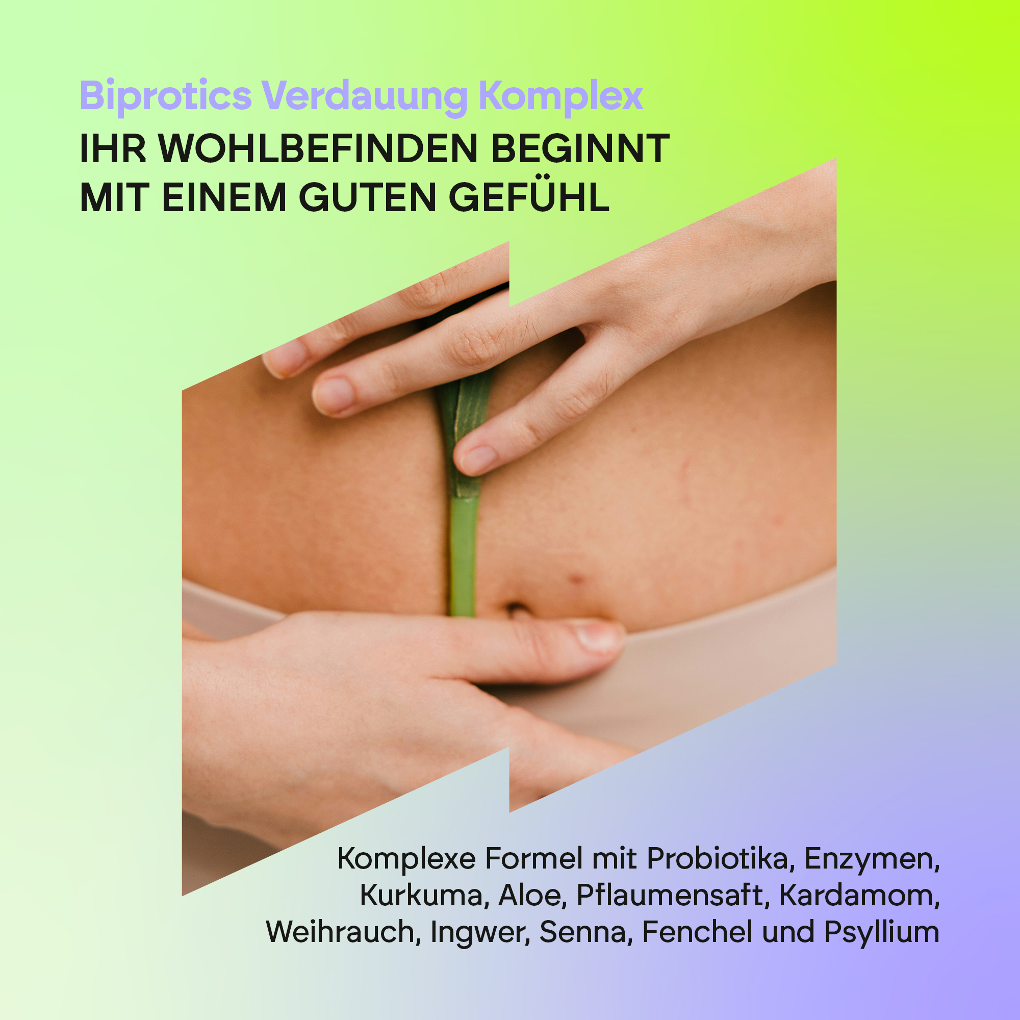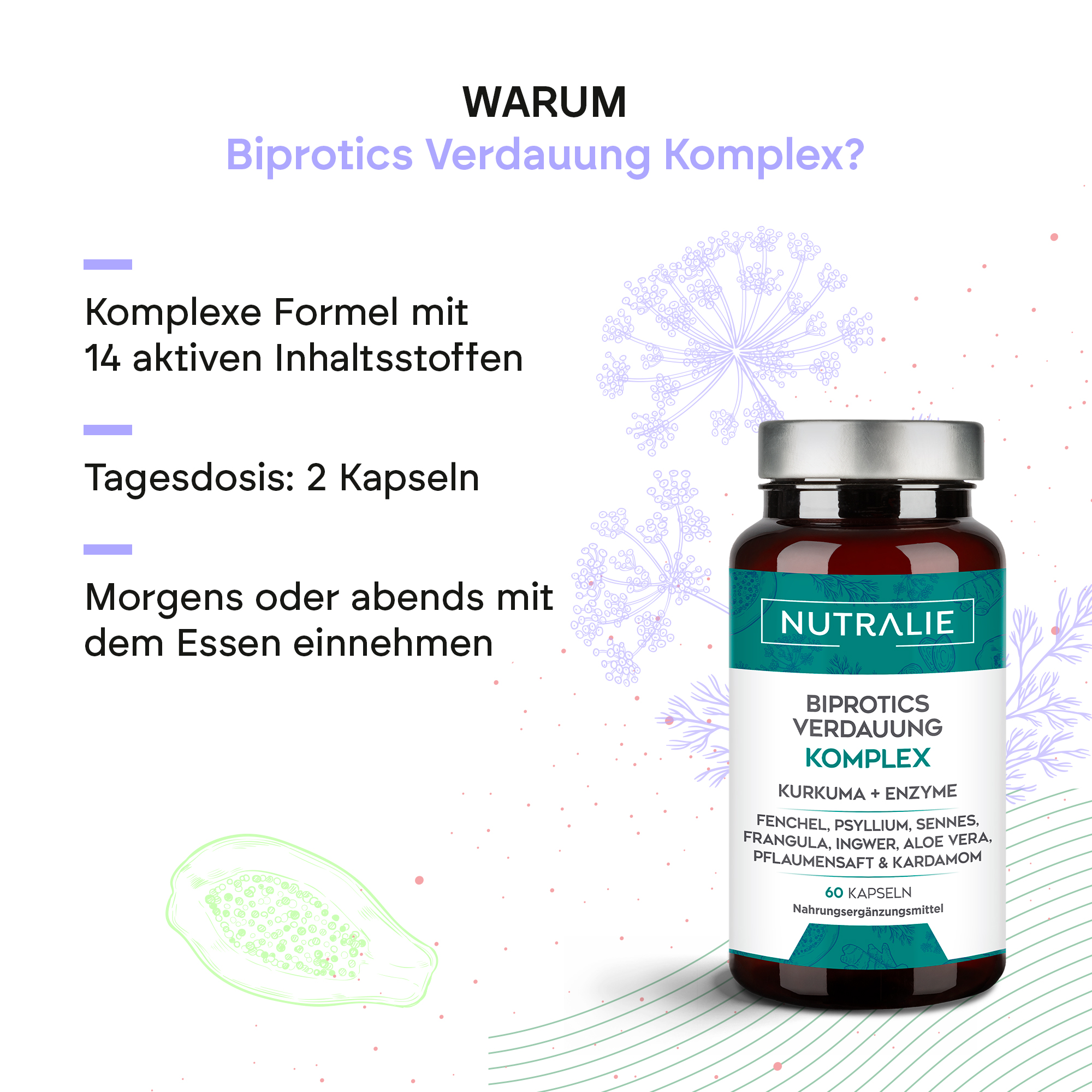 Der Digestive* Biprotics Complex von Nutralie wurde mit Bakterienstämmen und Enzymen sowie weiteren Inhaltsstoffen wie Kurkuma, Fenchel, Flohsamen, Sennesblättern, Sanddorn, Ingwer, Aloe Vera, Pflaumensaft und Kardamom entwickelt.