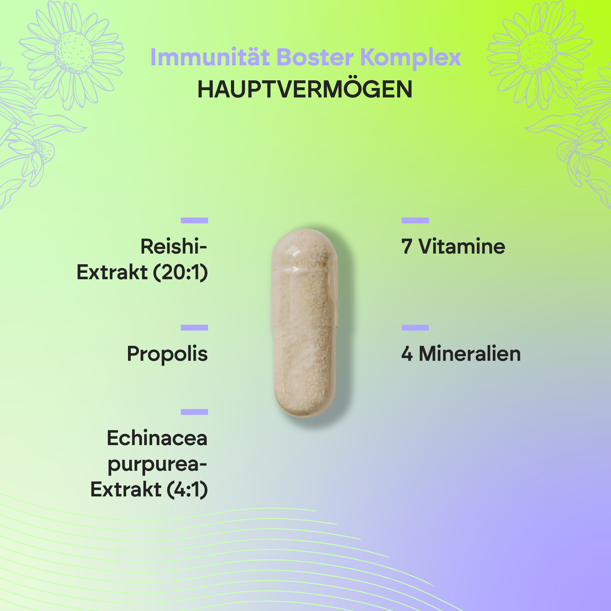 Der Immunitäts-Booster-Komplex von Nutralie ist ein Nahrungsergänzungsmittel mit Reishi-Extrakt, Propolis, Echinacea purpurea-Extrakt, den Vitaminen A bis D und Mineralstoffen.