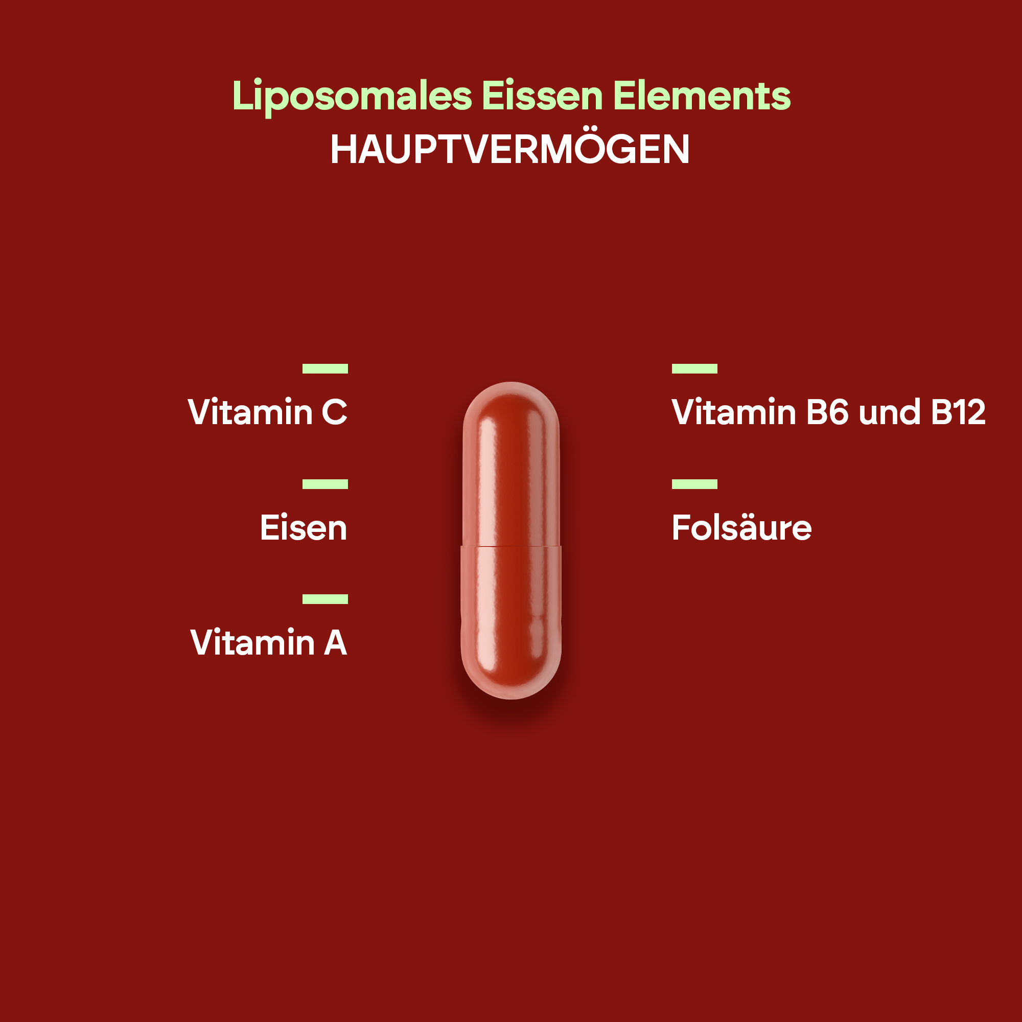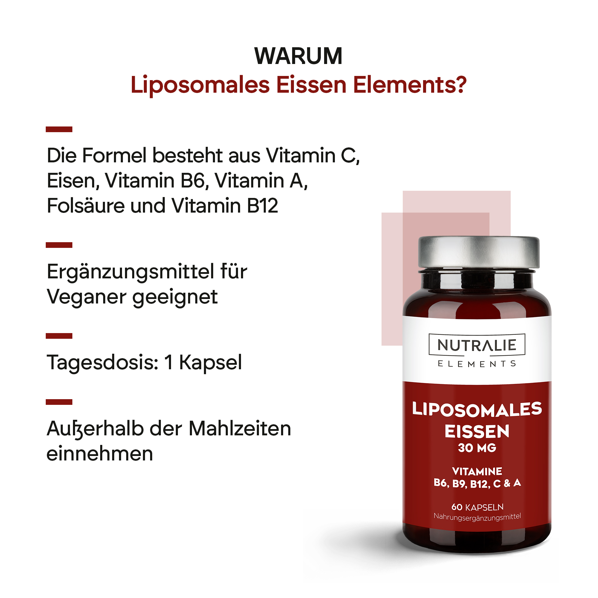 Nutralies liposomale Eisenelemente tragen dank liposomalem Eisen zur normalen Bildung roter Blutkörperchen und Hämoglobin bei. Darüber hinaus tragen die enthaltenen Vitamine B6 und B12 ebenfalls zur normalen Bildung roter Blutkörperchen bei.