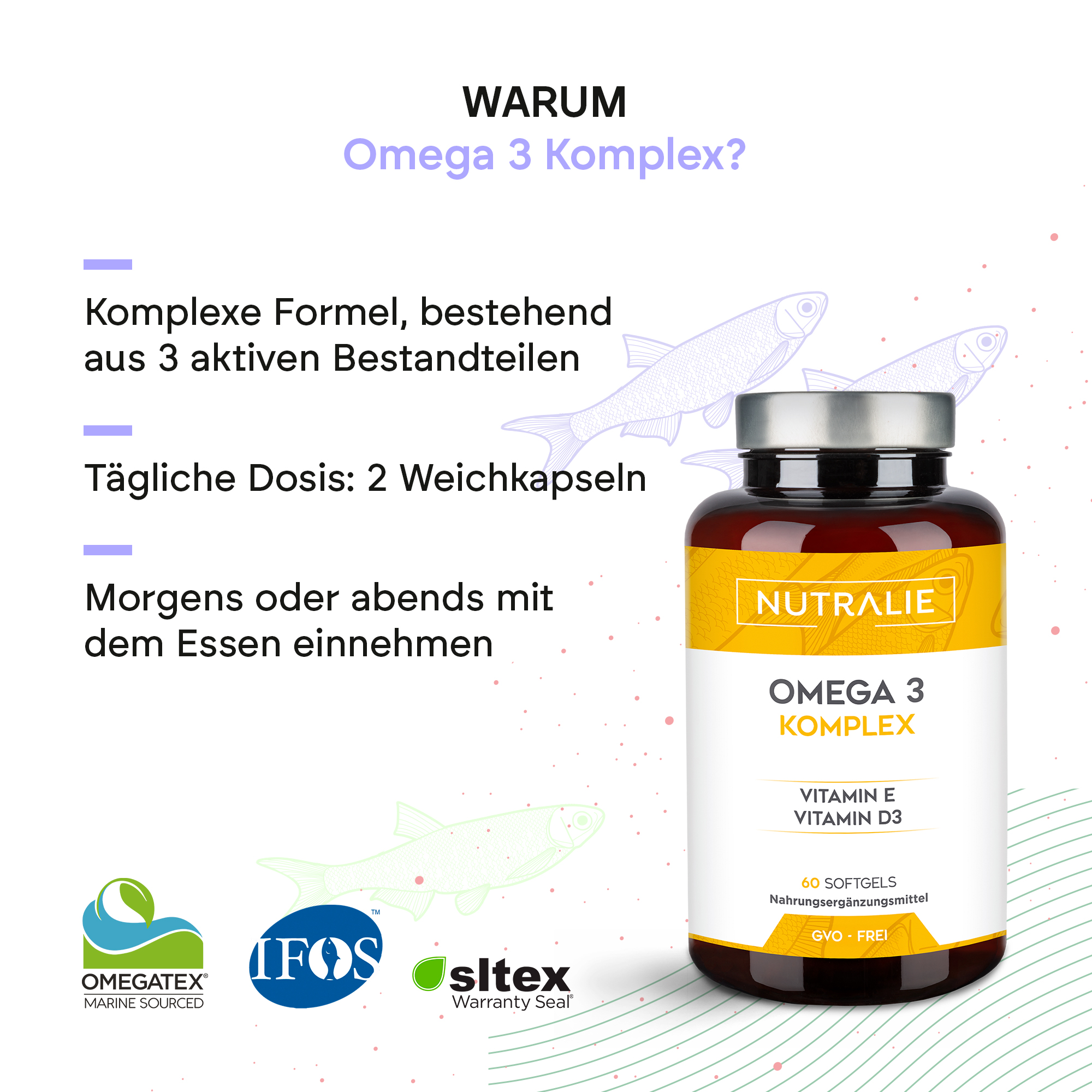 Der Omega-3-Komplex von Nutralie enthält Eicosapentaensäure und Docosahexaensäure, die zu einer normalen Herzfunktion beitragen. Die positive Wirkung wird bei einer täglichen Einnahme von 250 mg EPA und DHA erzielt.