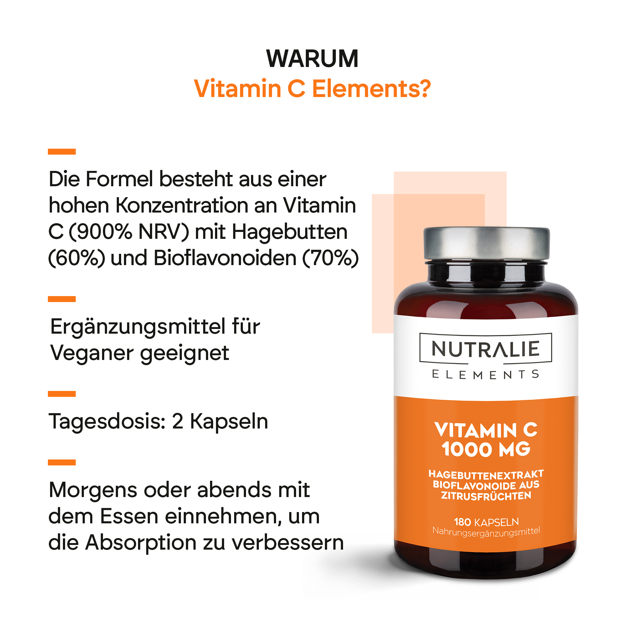 L-Ascorbinsäure (Vitamin C), Rosa canina L. (Frucht- Trockenextrakt), Kapseln (Überzugsmittel: Hydroxypropylmethylcellulose), Füllstoff (mikrokristalline Cellulose), Citrus sinensis (L.) Osbeck, (Frucht- Trockenextrakt), Trennmittel (Magnesiumsalze von Fettsäuren und Siliciumdioxid).