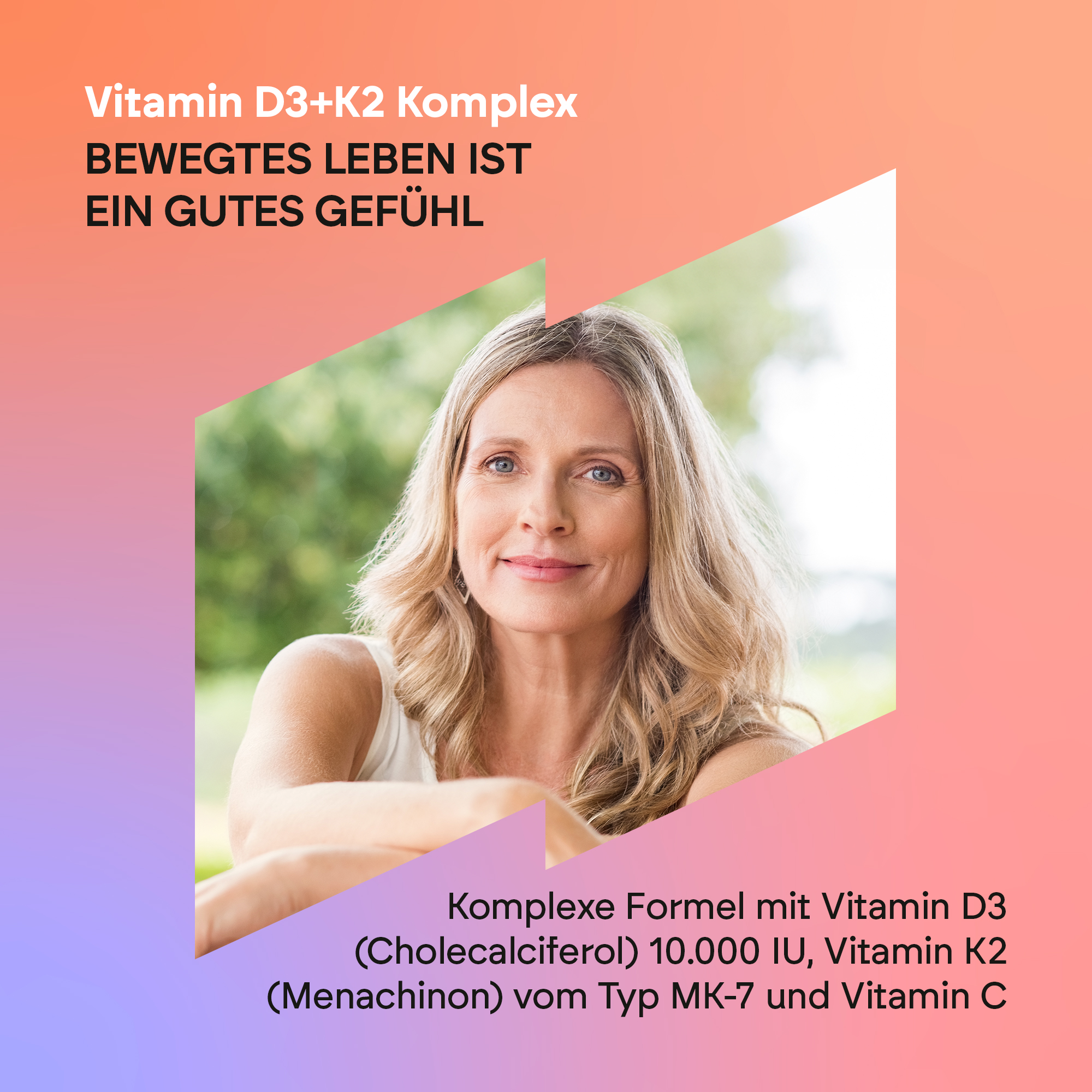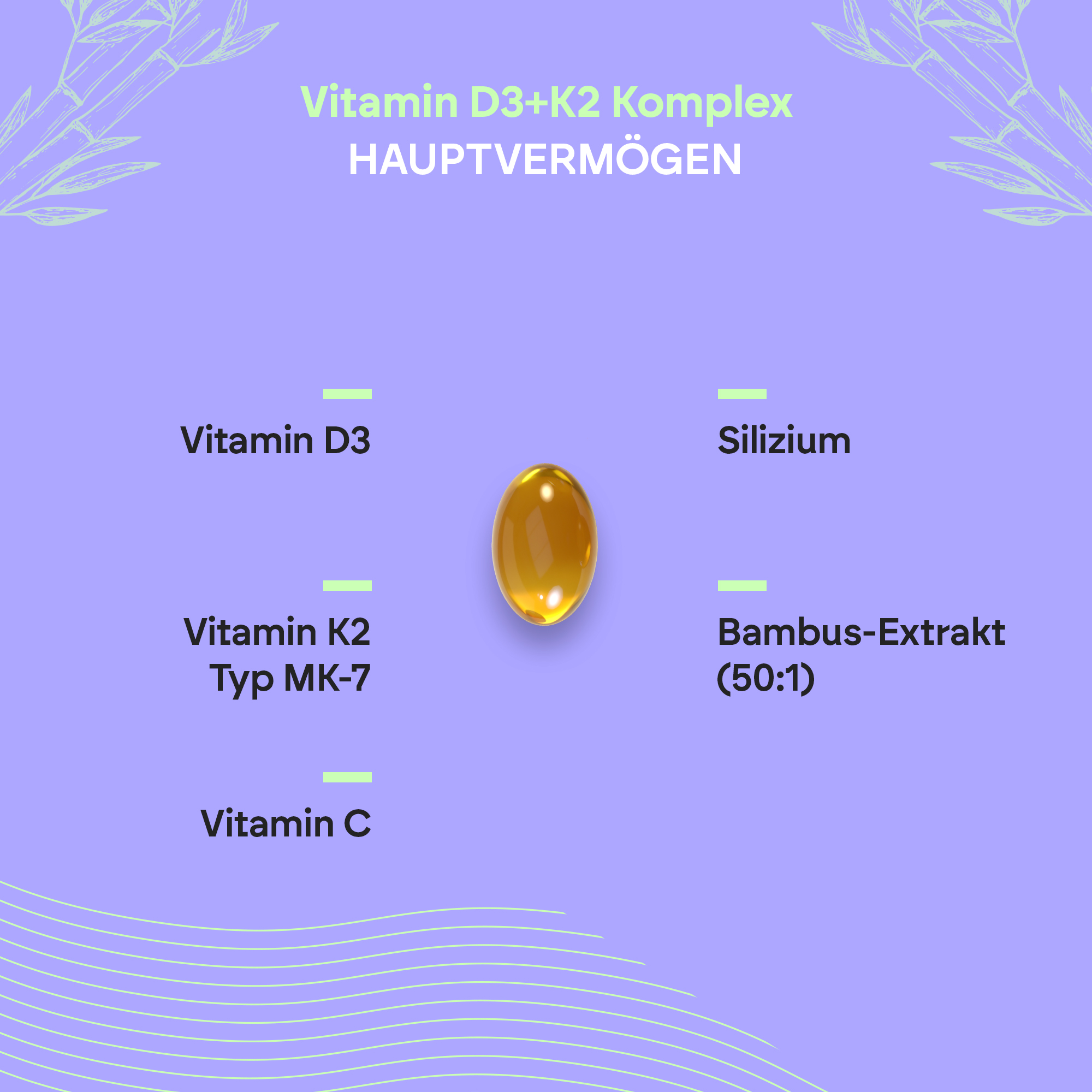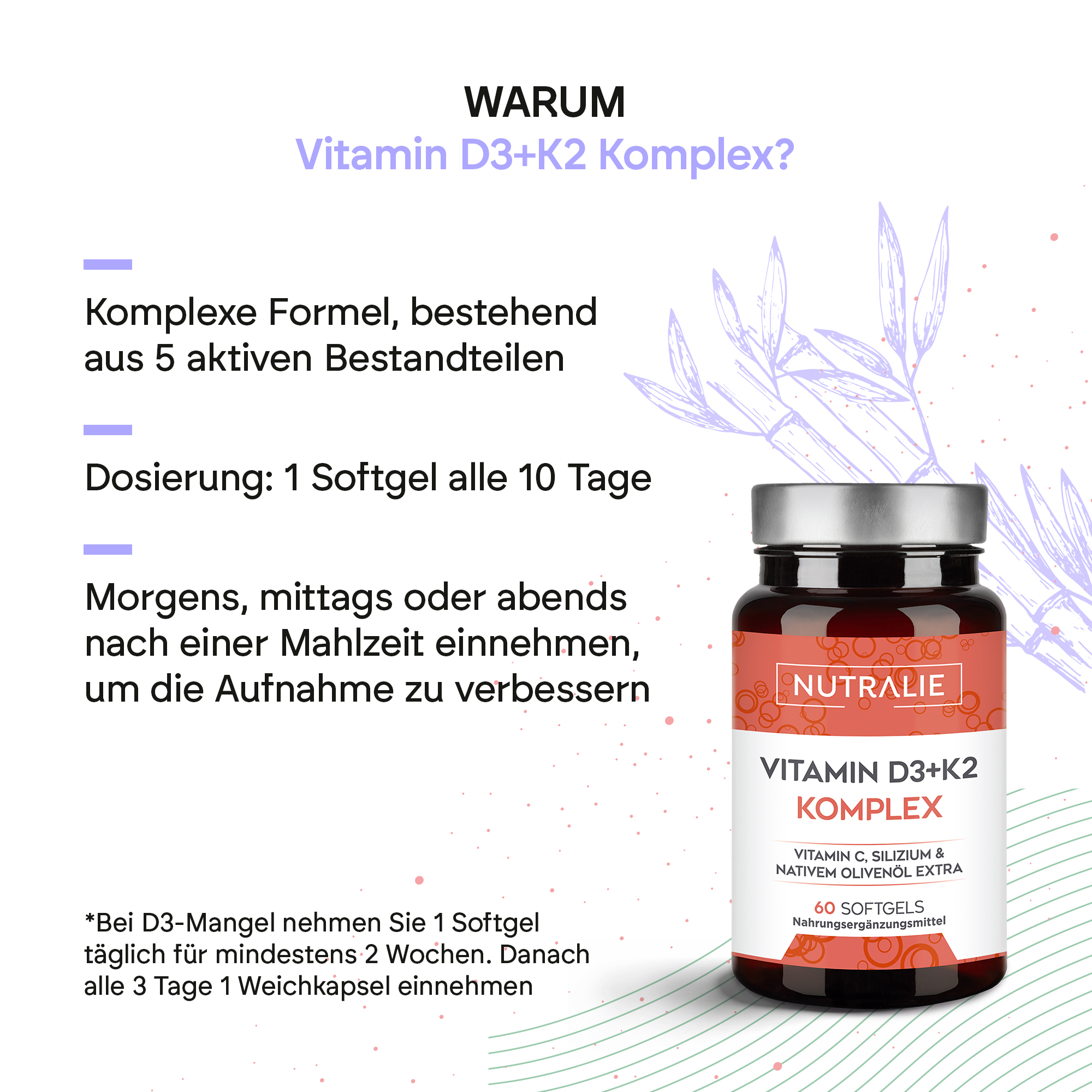 Vitamin D3 + K2 Complex ist ein Nahrungsergänzungsmittel mit Vitamin D3 (Cholecalciferol) 10.000 IE, Vitamin K2 (Menachinon) vom Typ MK-7 und Vitamin C.