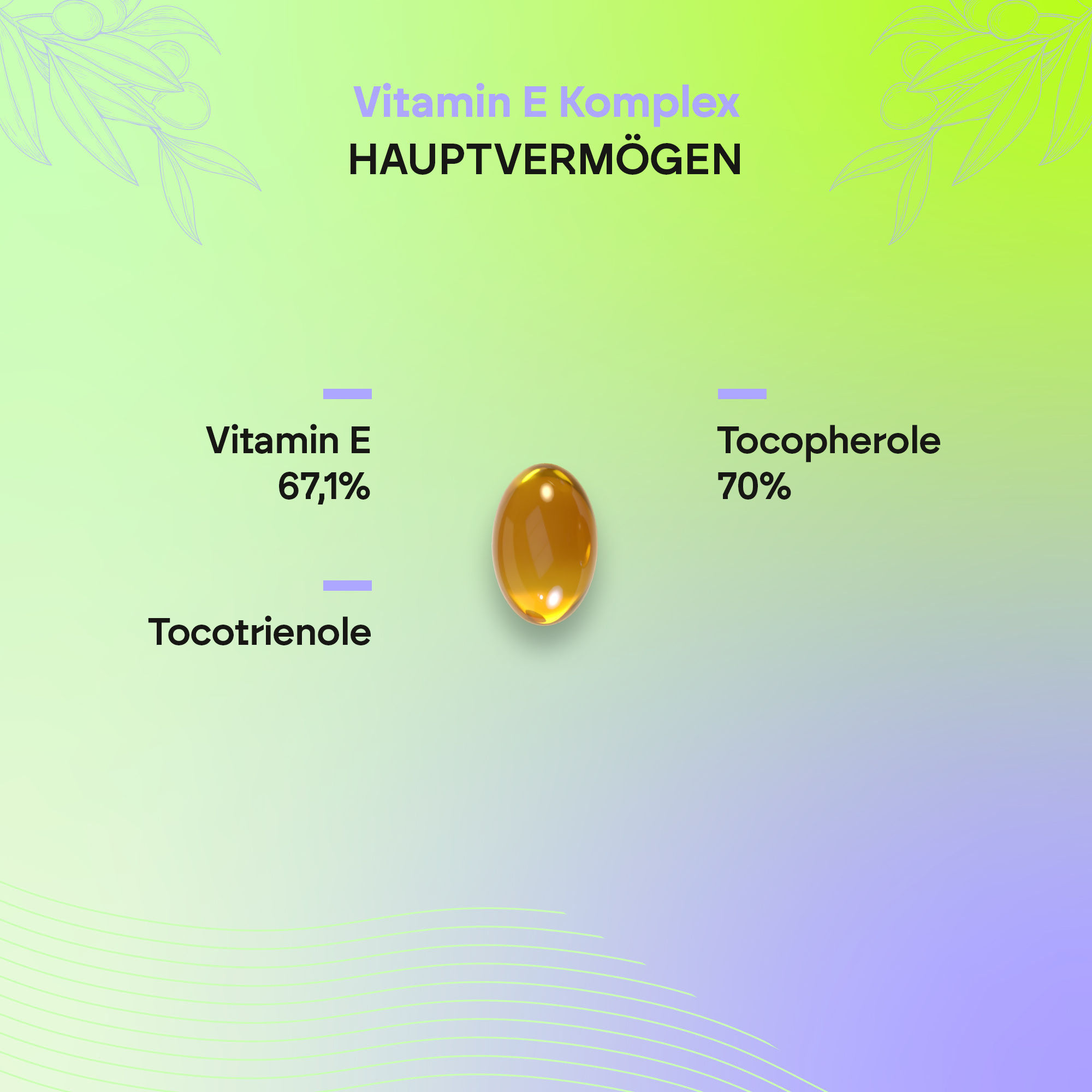 Vitamin E Complex ist ein Nahrungsergänzungsmittel, das D-alpha-Tocopherol (Vitamin E), Tocotrienole und eine Mischung aus Tocopherolen enthält.