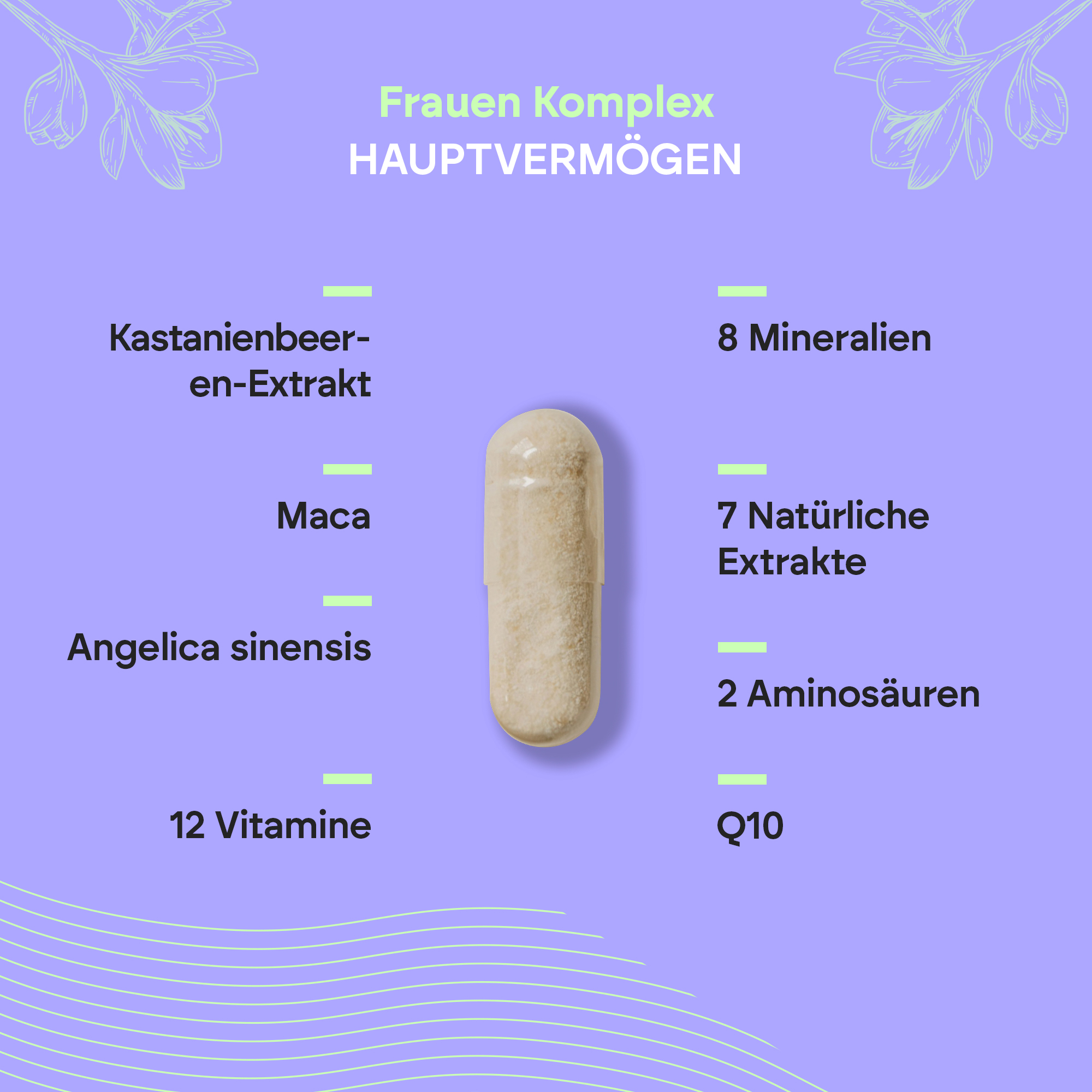 Women Complex ist ein Nahrungsergänzungsmittel mit Extrakten aus Mönchspfeffer, Maca, Angelica sinensis, 12 Vitaminen, 8 Mineralien, 7 natürlichen Extrakten, 2 Aminosäuren und Q10.