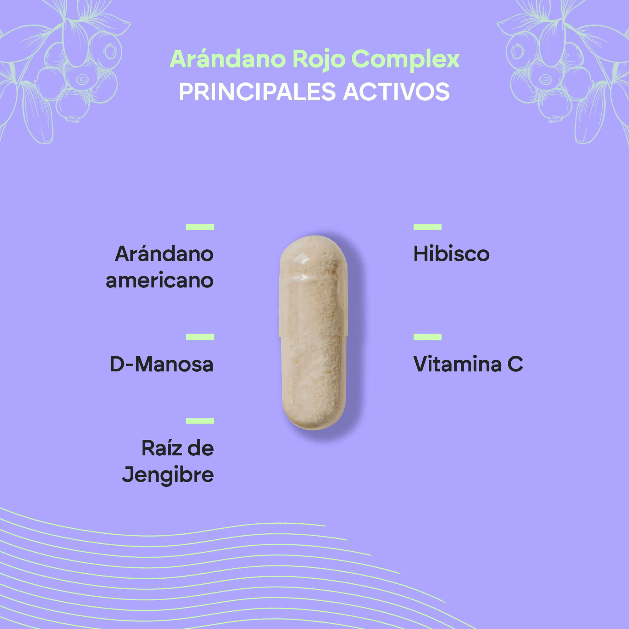 D-manosa, extracto seco de arándano rojo americano (Vaccinium macrocarpon Aiton., fruto), cápsula (agente de recubrimiento: hidroxipropilmetilcelulosa), agente de carga (celulosa microcristalina), extracto seco de hibisco (Hibiscus sabdariffa L., flor), ácido L-ascórbico (vitamina C), extracto seco de jengibre (Zingiber officinale Rosc., rizoma), antiaglomerantes (sales magnésicas de ácidos grasos, dióxido de silicio).