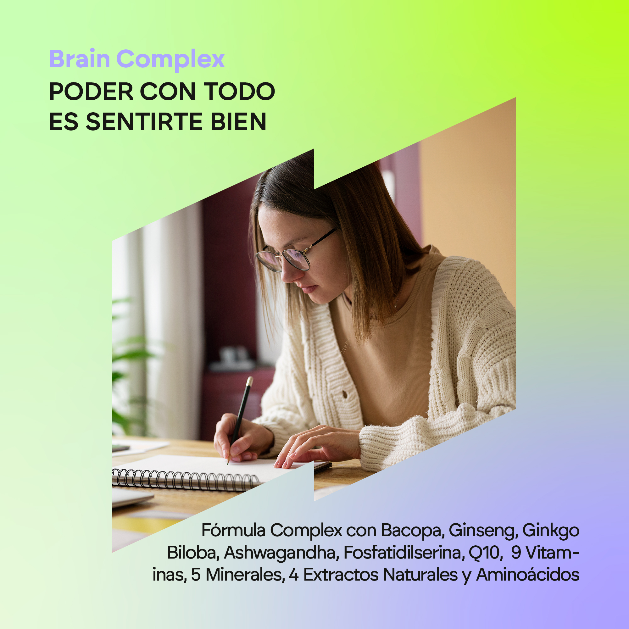 Brain Complex de Nutralie ha sido desarrollado con 24 activos, que incluyen extratos de Bacopa Monnieri, Ginseng, Ginkgo Biloba, Ashwagandha, Fosfatidilserina, Coenzima Q10, 9 vitaminas, 5 minerales y aminoácidos.