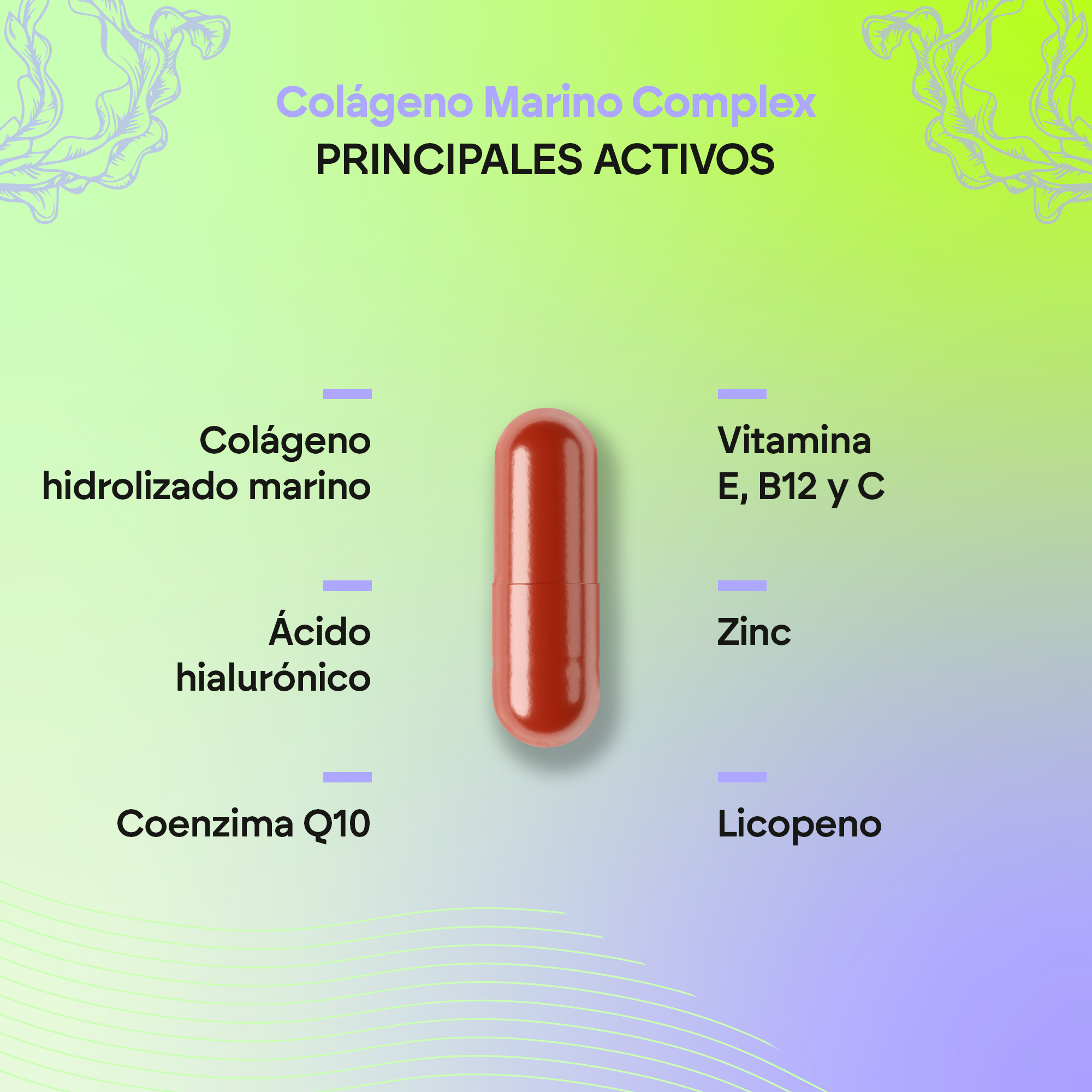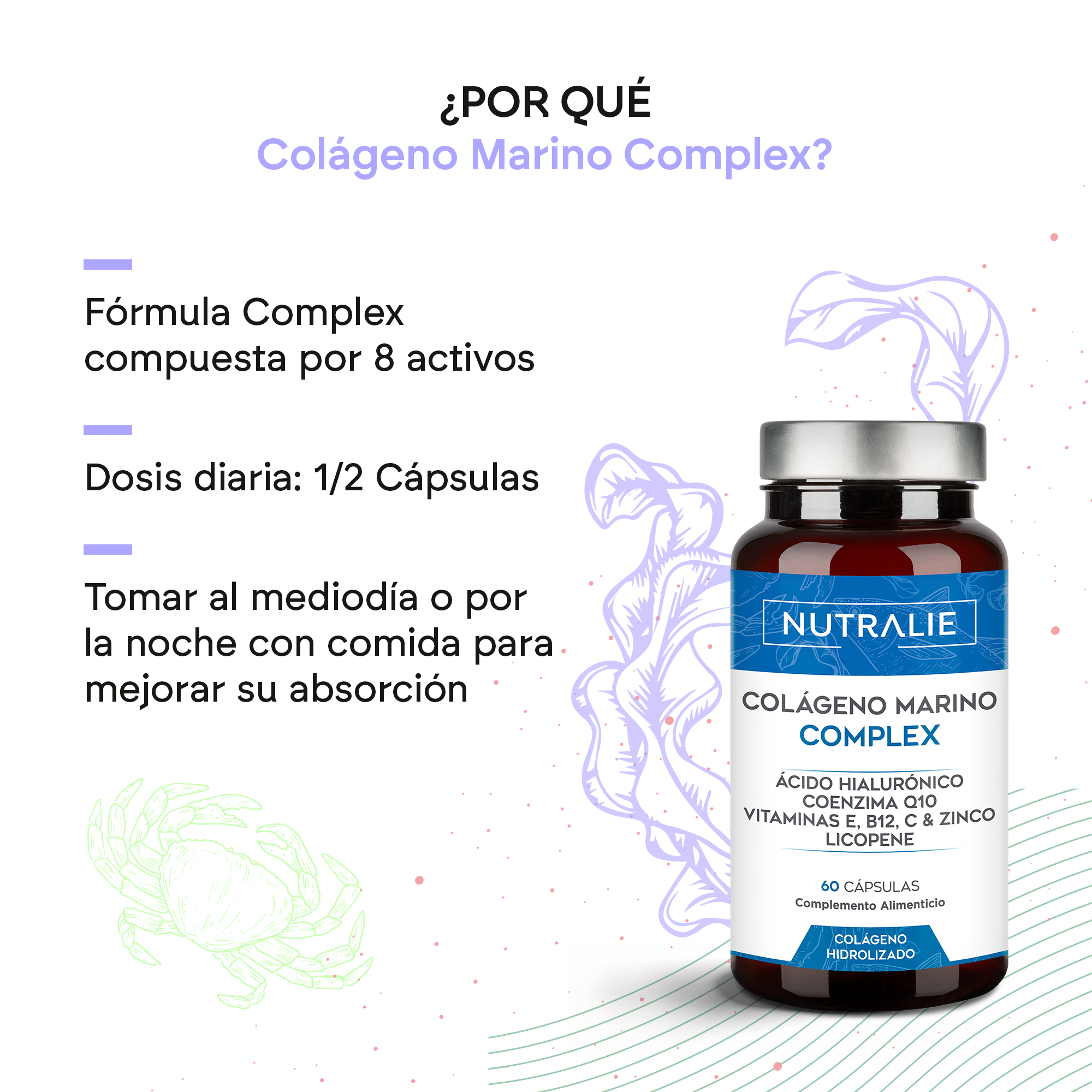 Colágeno Marino Complex de Nutralie contiene 1000 mg de colágeno hidrolizado marino. Además, presenta 45mg de Ácido Hialurónico, 15mg de Q10 , 25mg de vitamina C, 9,1mg de Vitamina E, 2,5 µg de Vitamina B12 y 7,5 mg de Licopeno.