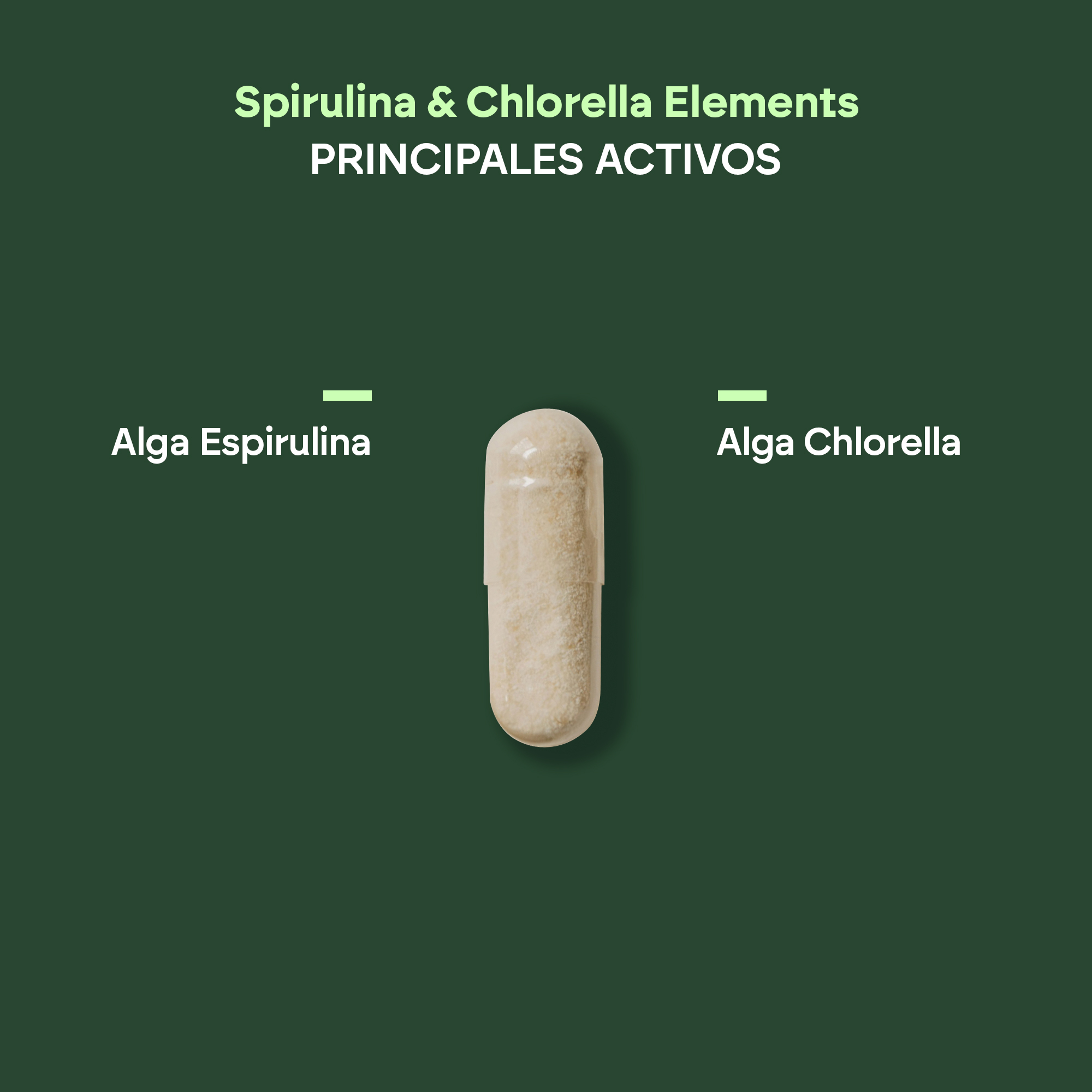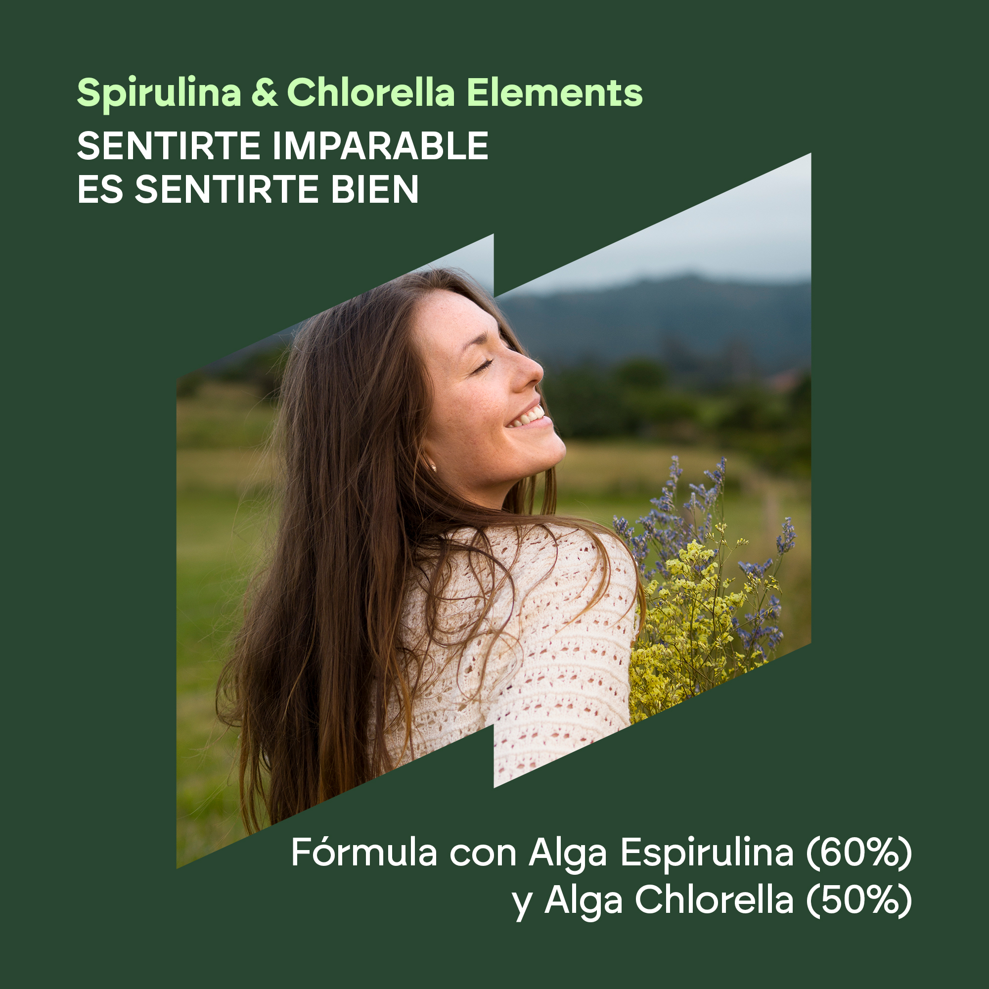 Spirulina & Chlorella Elements de Nutralie, es un suplemento formulado con Alga espirulina (60%) y Alga Chlorella (50%)