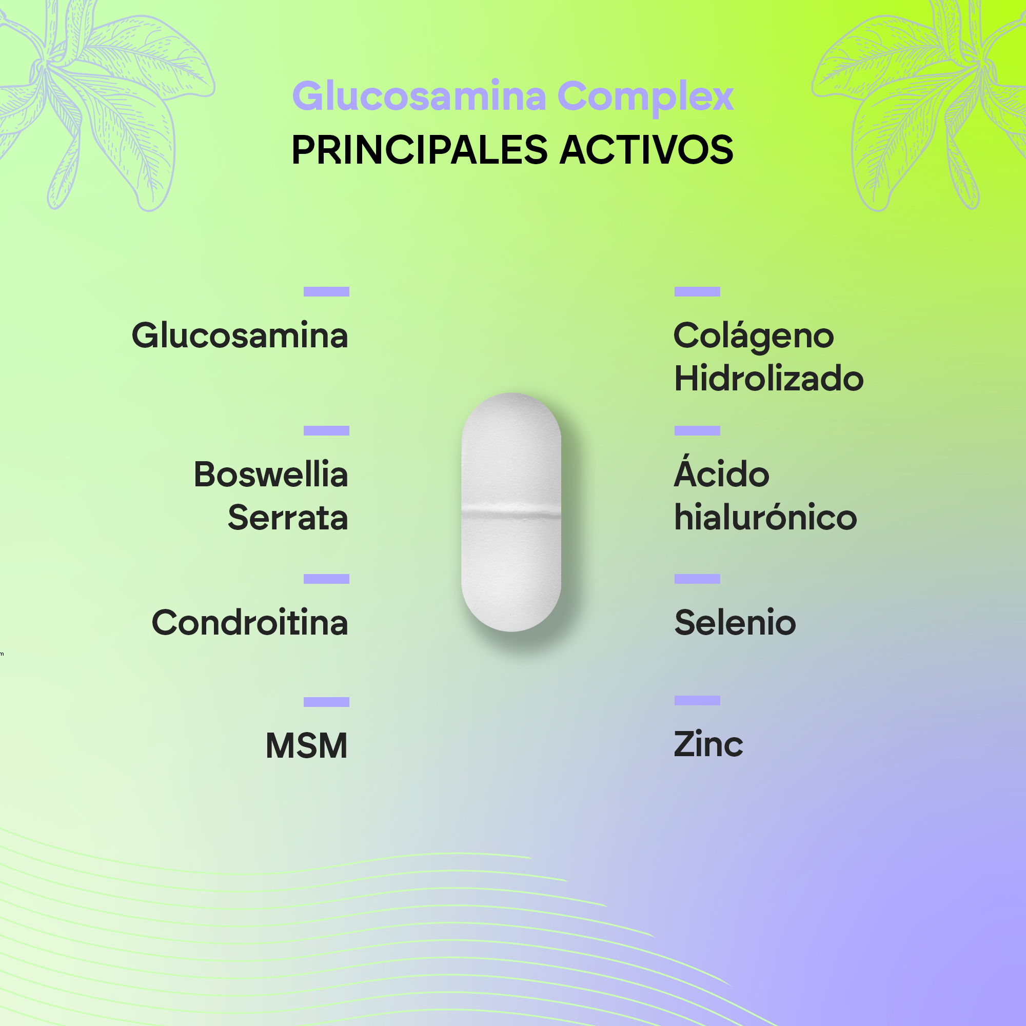 La Glucosamina Complex de Nutralie contiene glucosamina y condroitina, dos ingredientes presentes en el cartílago. Además, en esta fórmula, se incluyen también MSM (metilsulfonilmetano), ácidos boswélicos, colágeno, ácido hialurónico, selenio y zinc.