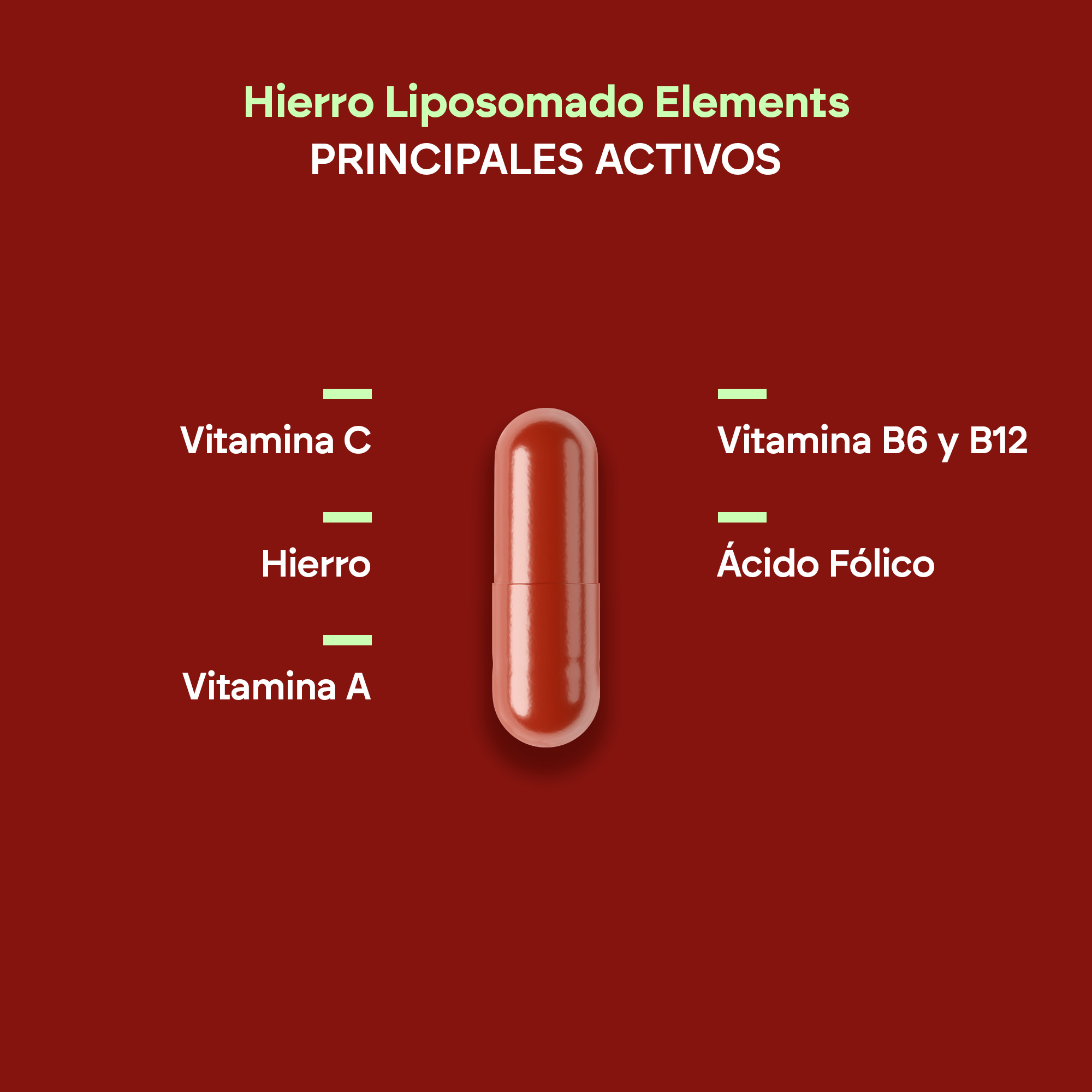 Liposomal Iron Elements de Nutralie es un suplemento formulado con Vitamina C, Hierro, Vitamina B6, Vitamina A, Ácido Fólico y Vitamina B12.