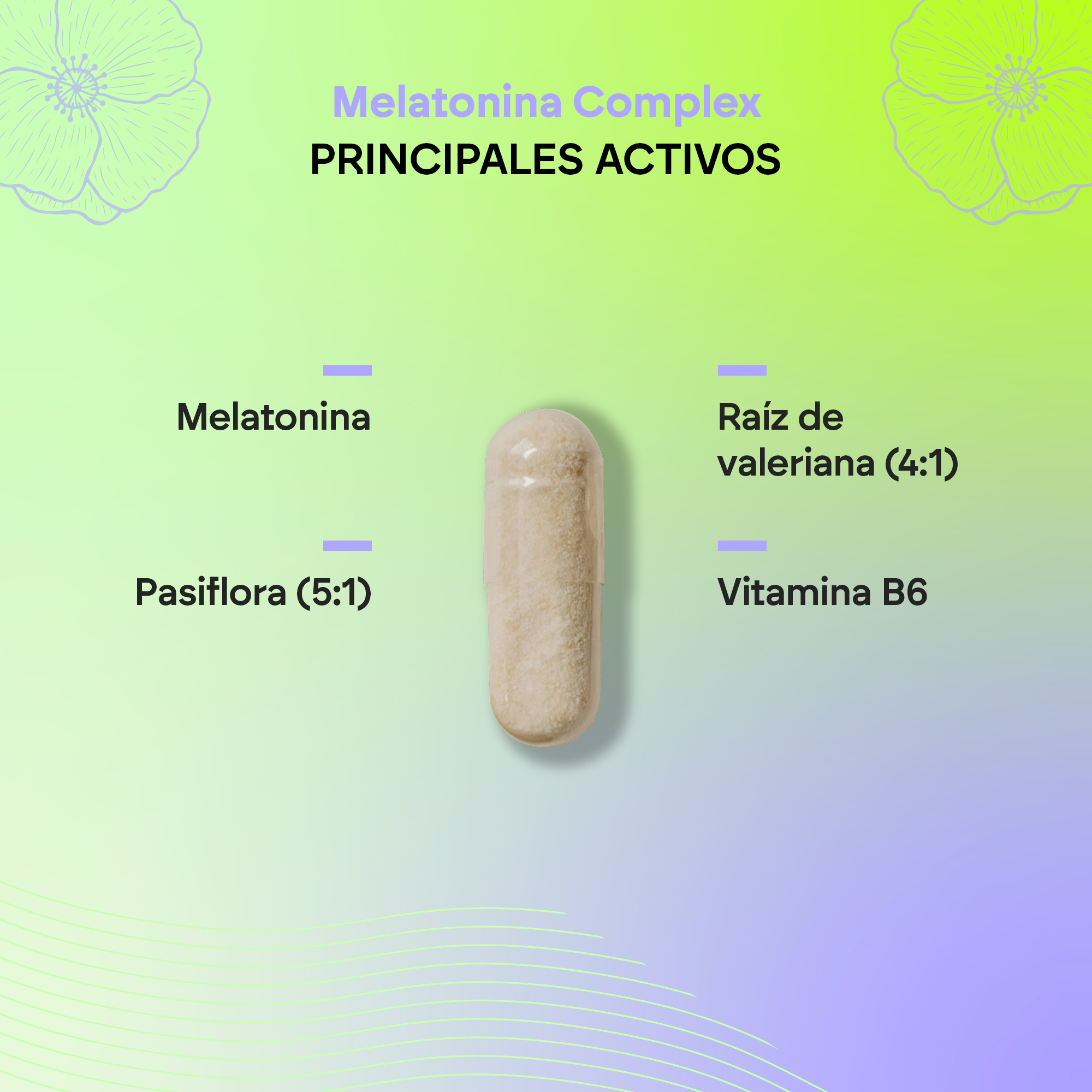 Extracto seco Amapola de california (Eschscholtzia californica Cham., parte aérea), extracto seco Pasiflora (Passiflora Incarnata L. parte aérea), extracto seco Melisa (Melissa officinalis L. hoja), cápsula: agente de recubrimiento (Hidroxipropilmetilcelulosa), extracto seco Tilo (Tilia platyphyllos Scop., flor), extracto seco Valeriana (Valeriana officinalis L., raiz), agente de carga (celulosa microcristalina), antiaglomerantes (sales magnésicas de ácidos grasos y dióxido de silicio), Melatonina, clorhidrato de piridoxina (Vitamina B6).
