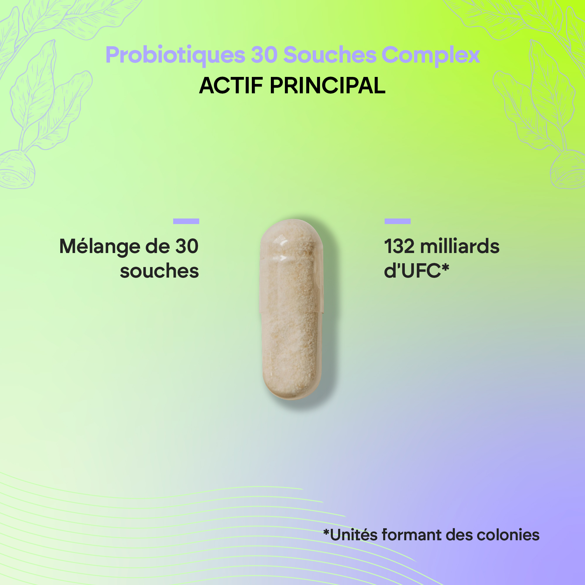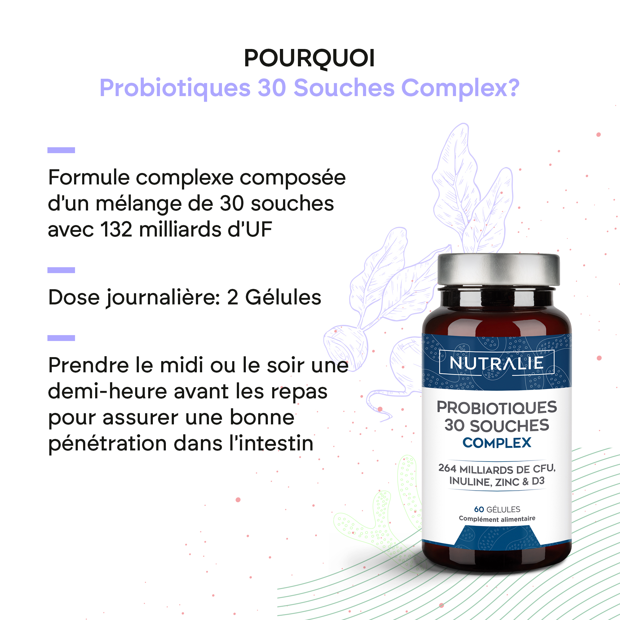 Biprotics 30 Cepas Complex de Nutralie se caractérise par une combinaison de 30 souches. Chaque dose, composée de deux gélules, contient 132 milliards d’UFC (unités formant colonie).