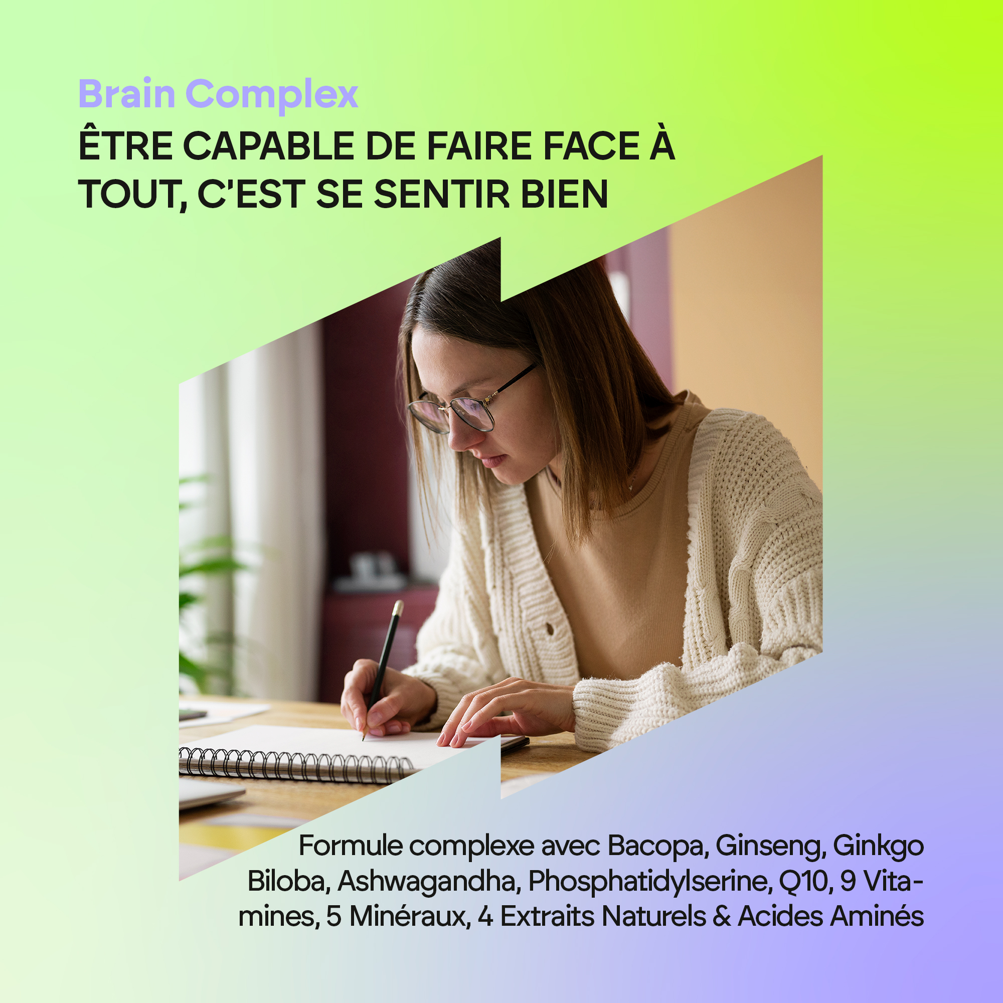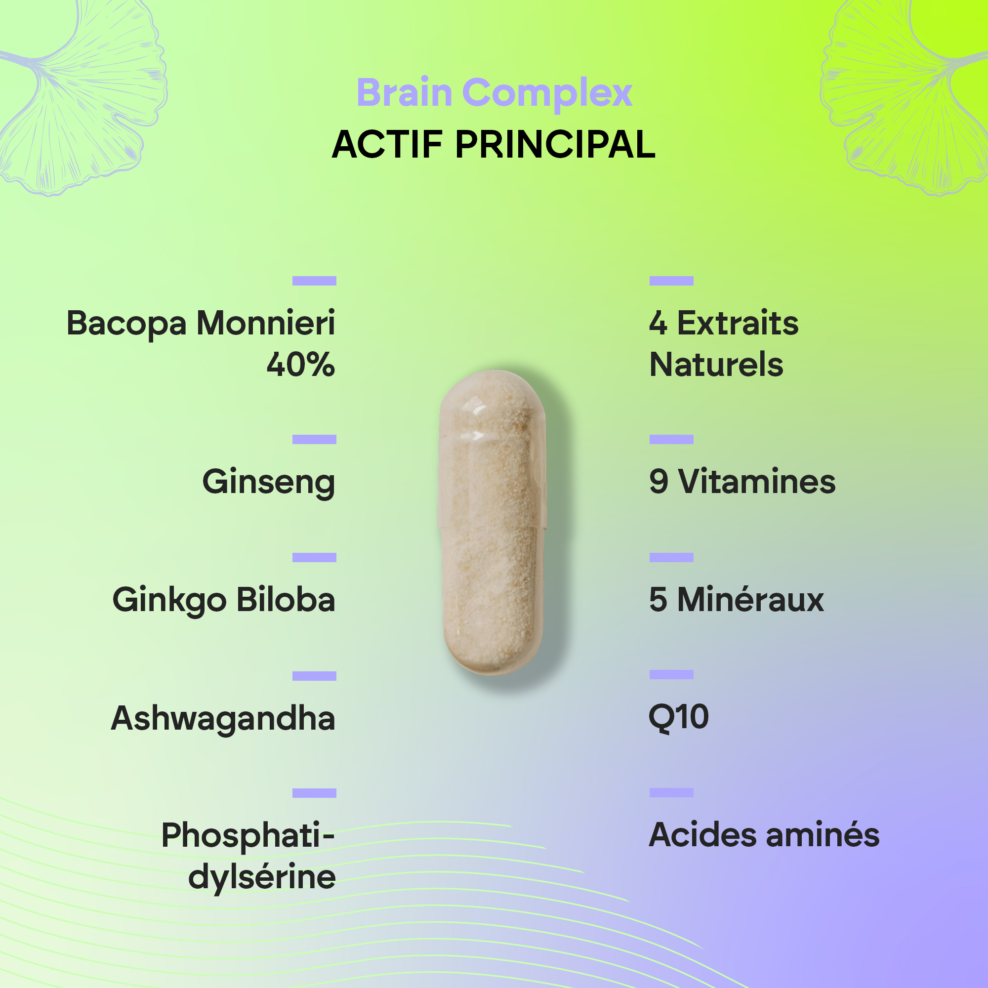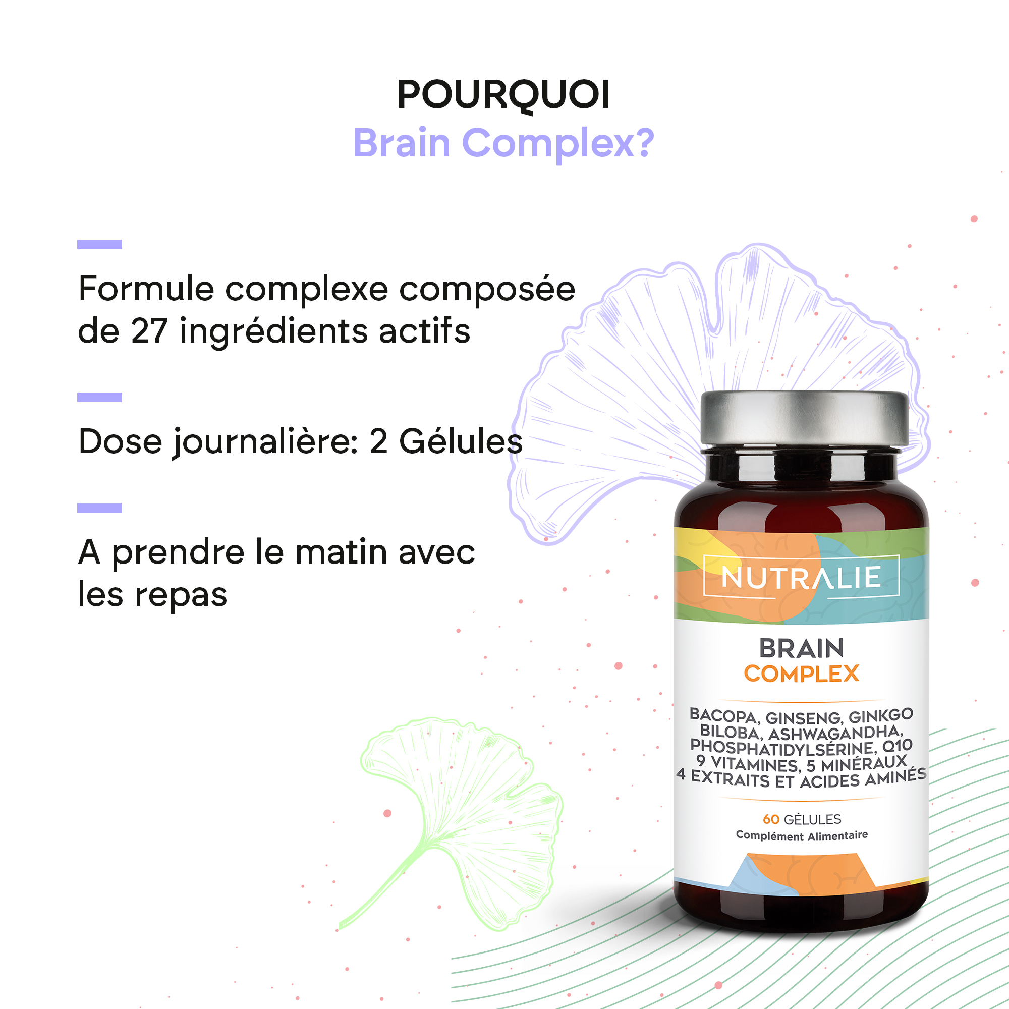 Brain Complex de Nutralie a été développé à partir de 24 actifs, dont des extraits de Bacopa Monnieri, Ginseng, Ginkgo Biloba, Ashwagandha, Phosphatidylsérine, Coenzyme Q10, 9 vitamines, 5 minéraux et acides aminés.