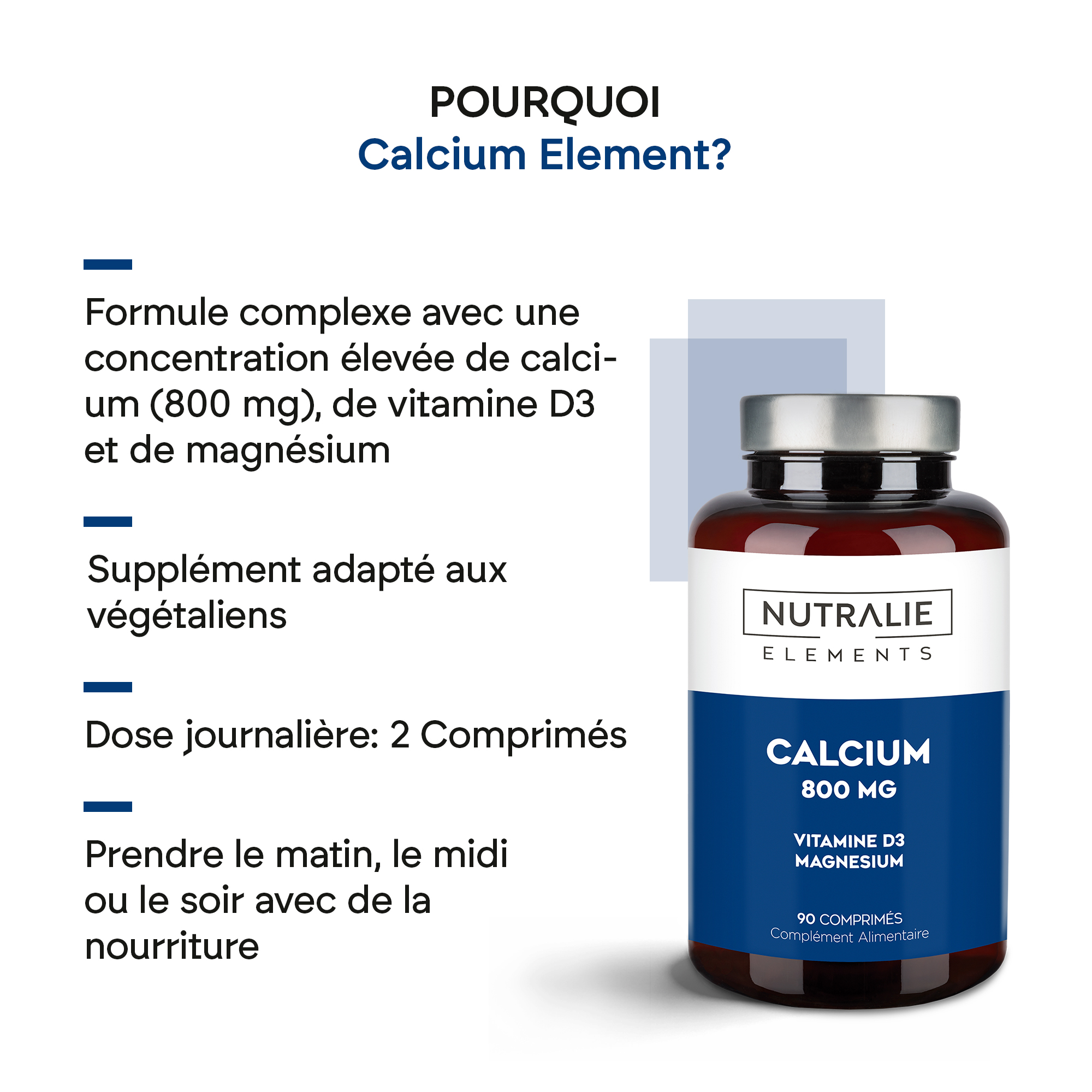 Nutralie Calcium Elements est présenté dans un emballage contenant 90 comprimés.