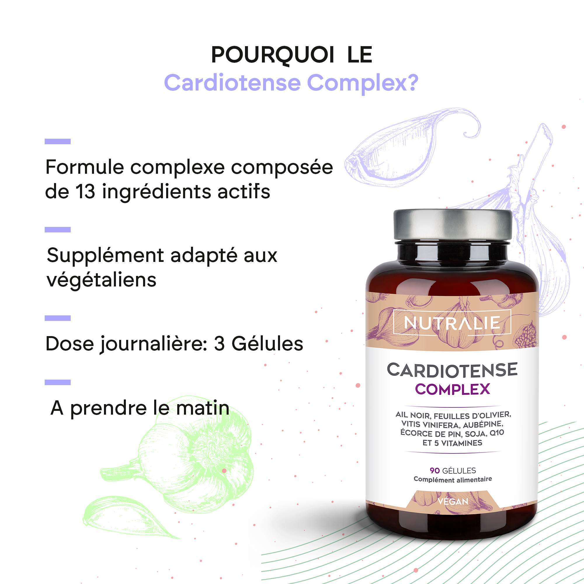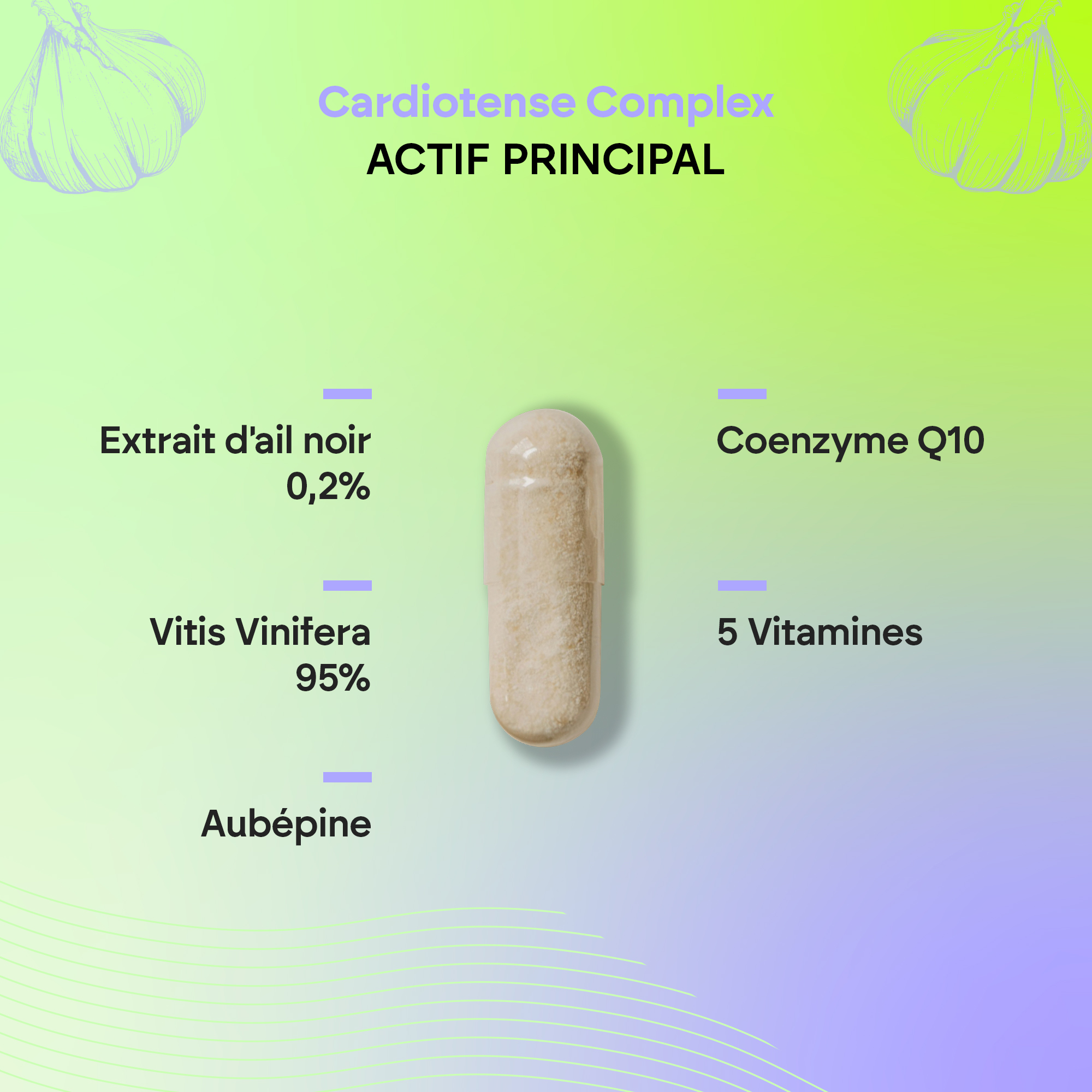 Cette formule complexe contient de l’extrait d’ail noir, de l’aubépine, de l’écorce de pin, de la S-allylcystéine et des vitamines B.