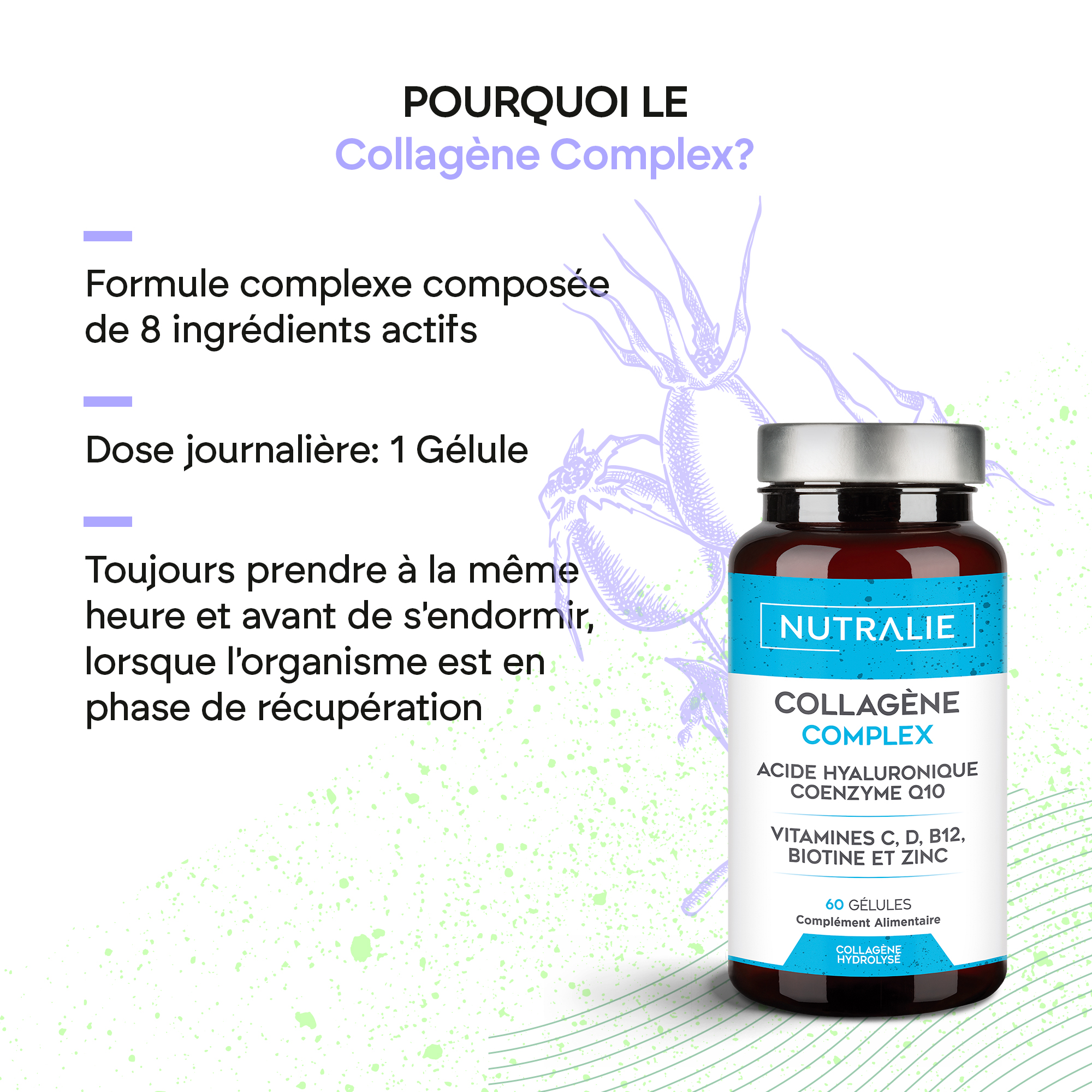 Le Complexe Collagène Nutralie contient 370 mg de collagène hydrolysé par capsule. Il contient également des vitamines C, D et B12, de la biotine, du zinc, de la coenzyme Q10 et de l’acide hyaluronique.