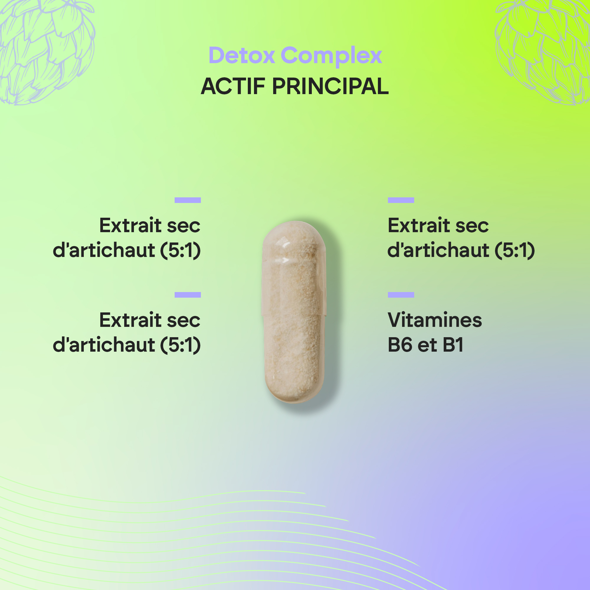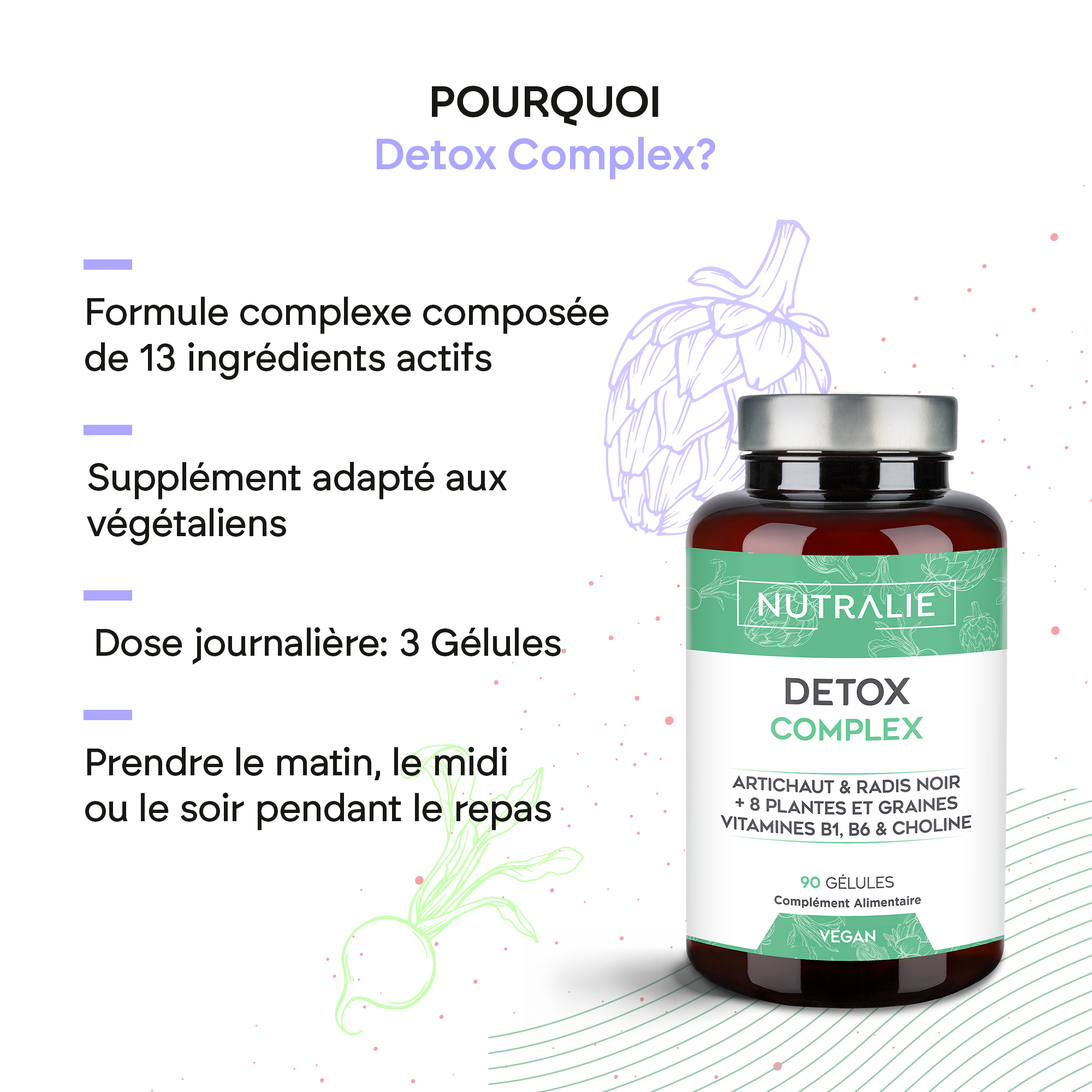 Notre complément Détox Complex est composé de diverses plantes et graines, dont l’artichaut et le radis noir. Cette formule naturelle contient également de la choline et des vitamines B1 (thiamine) et B6, cette dernière contribuant à un métabolisme énergétique normal.