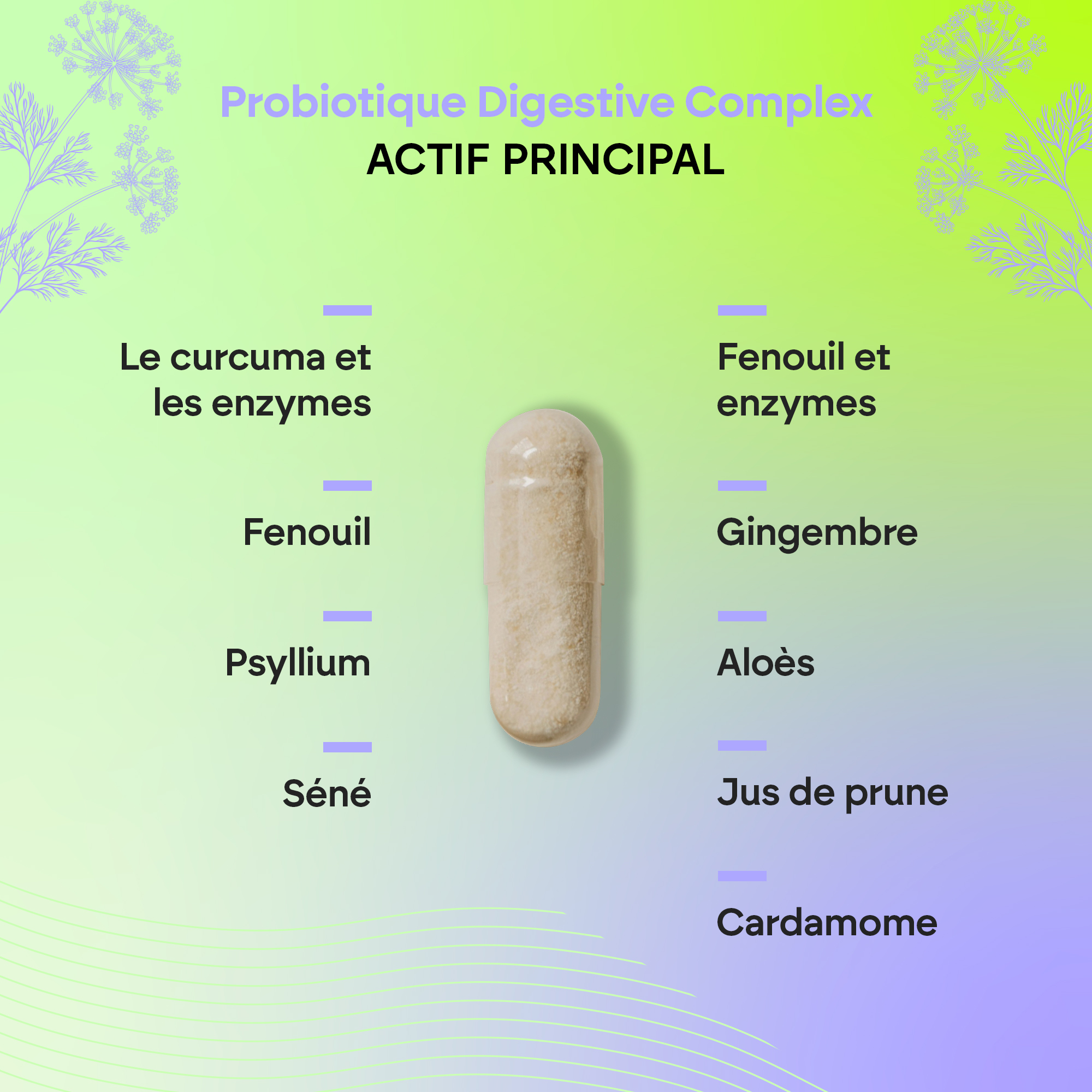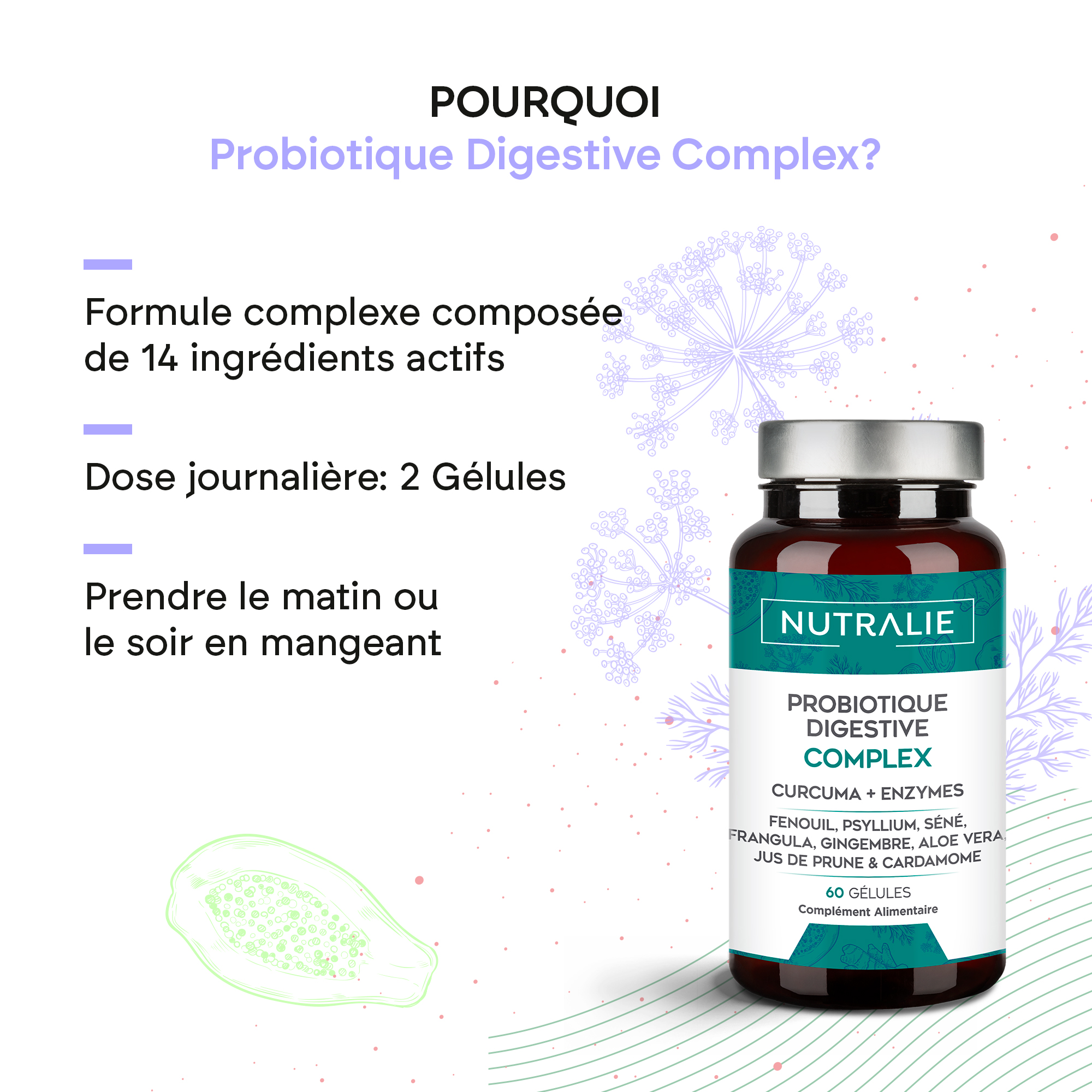 Le Complexe Biprotiques Digestif* de Nutralie est élaboré à partir de souches bactériennes et d’enzymes, ainsi que d’autres ingrédients tels que le curcuma, le fenouil, le psyllium, le séné, le nerprun, le gingembre, l’aloe vera, le jus de pruneau et la cardamome.