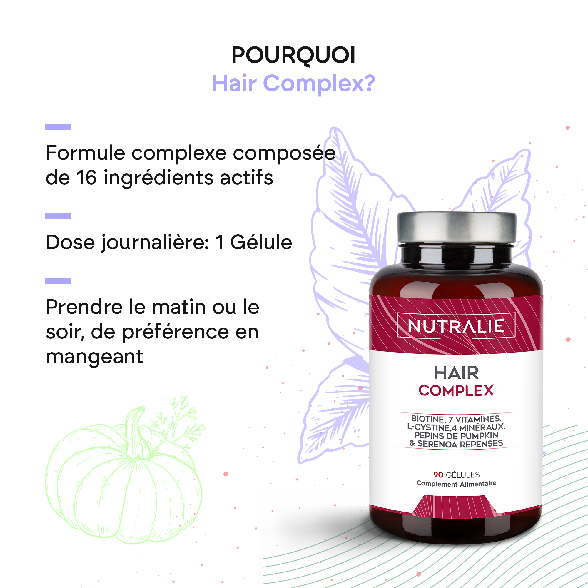 Nutralie Hair Complex contient de la biotine, qui contribue également au maintien d'une peau et de cheveux normaux.