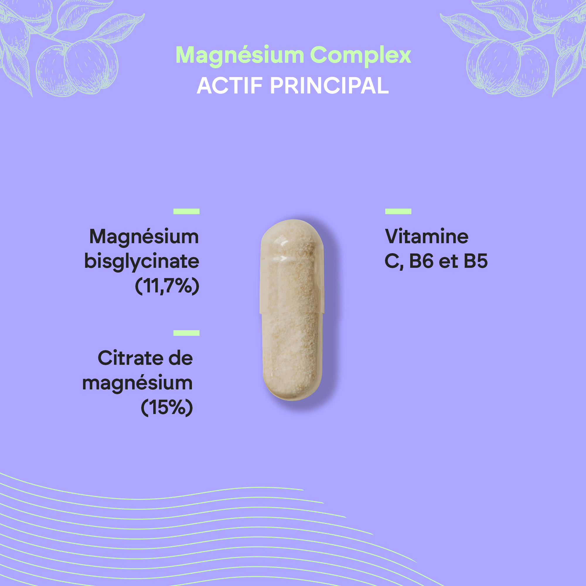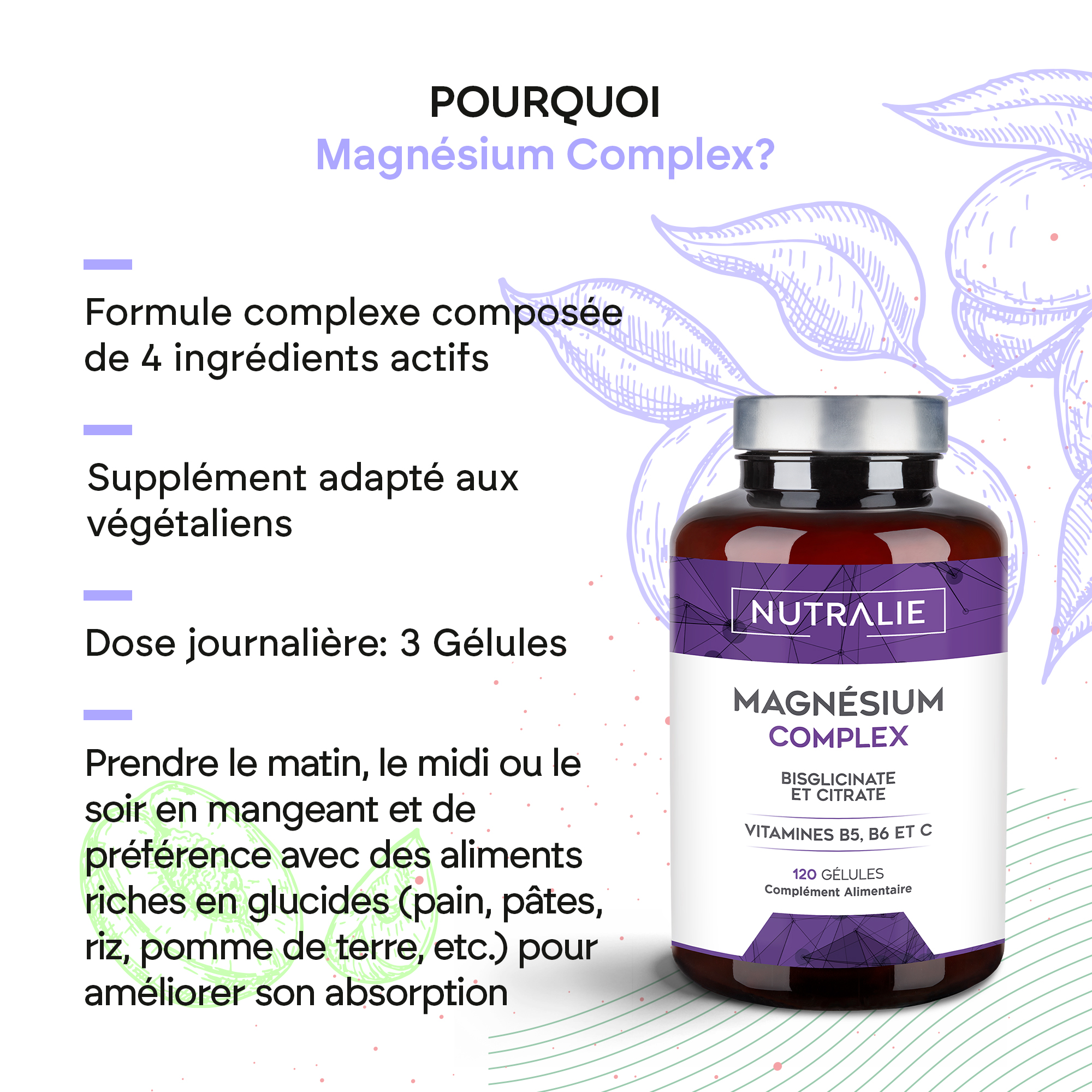 Le Magnesium Complex de Nutralie se présente sous forme de bisglycinate et de citrate, associé aux vitamines B5, B6 et C. Le magnésium présent dans la formule contribue au métabolisme énergétique normal.
