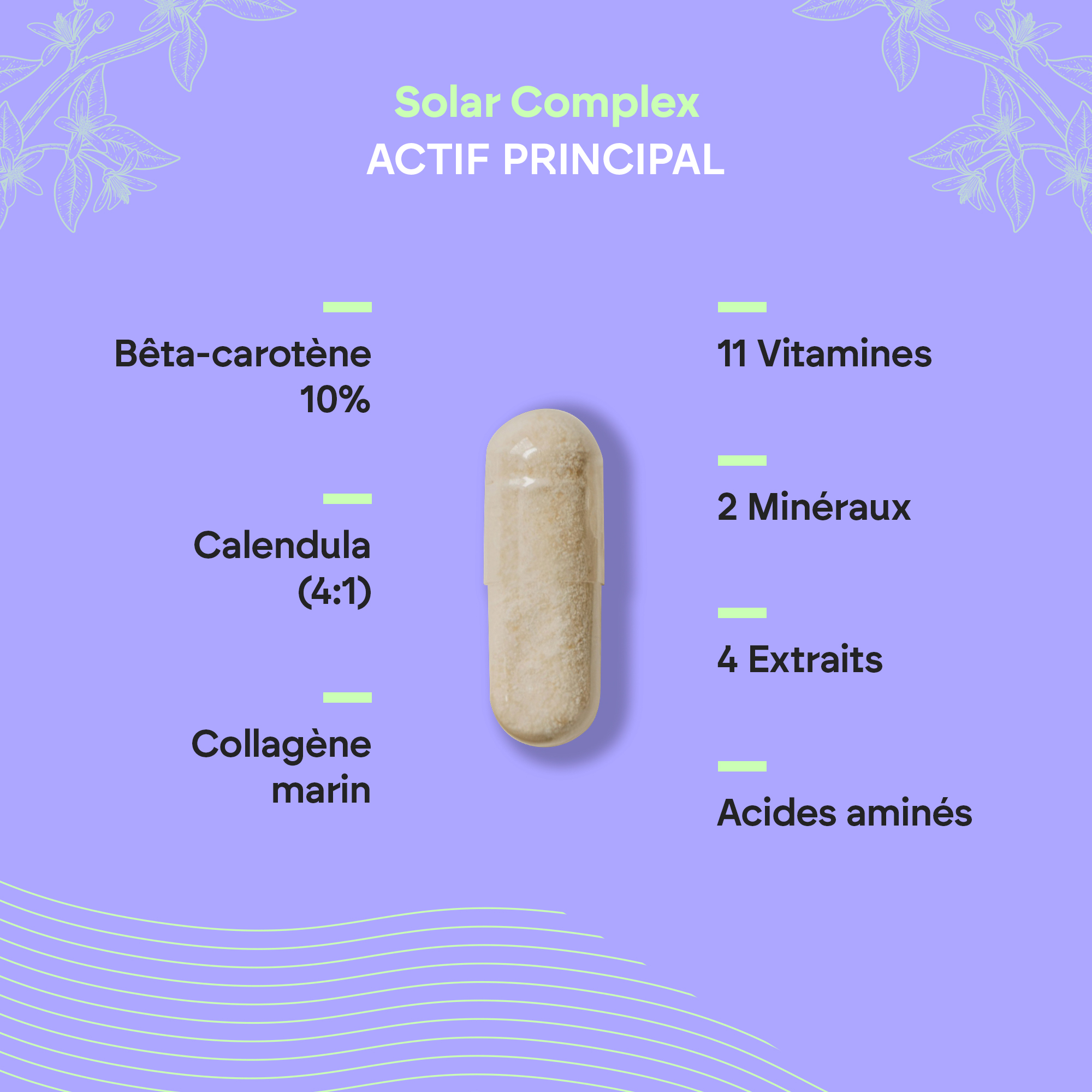 Extrait sec de racine de bardane (Arctium lappa L.),gélule [agent d'enrobage (hydroxypropylméthylcellulose)], collagène de poisson hydrolysé, vitamine C (acide L-ascorbique), L-cystéine, extrait sec de rhizome de curcuma (Curcuma longa L.), extrait sec d'écorce de pin de Masson (Pinus massoniana Lamb.), L-tyrosine, extrait sec de fleur de caléndula (Calendula officinalis L.), niacine (nicotinamide), L-sélénométhionine, acide pantothénique (D-pantothénate de calcium), lycopène, gluconate cuivrique, vitamine A (bêta-carotène), vitamine D (cholécalciférol), anti-agglomérants (sels de magnésium d'acides gras, silicium dioxyde) , agent de charge (cellulose microcristalline), vitamine A (acétate de rétinyle), vitamine B6 (chlorhydrate de pyridoxine), thiamine (chlorhydrate de thiamine), riboflavine (riboflavine), vitamine B12 (méthylcobalamine), folate (acide ptéroylmonoglutamique), D-biotine.