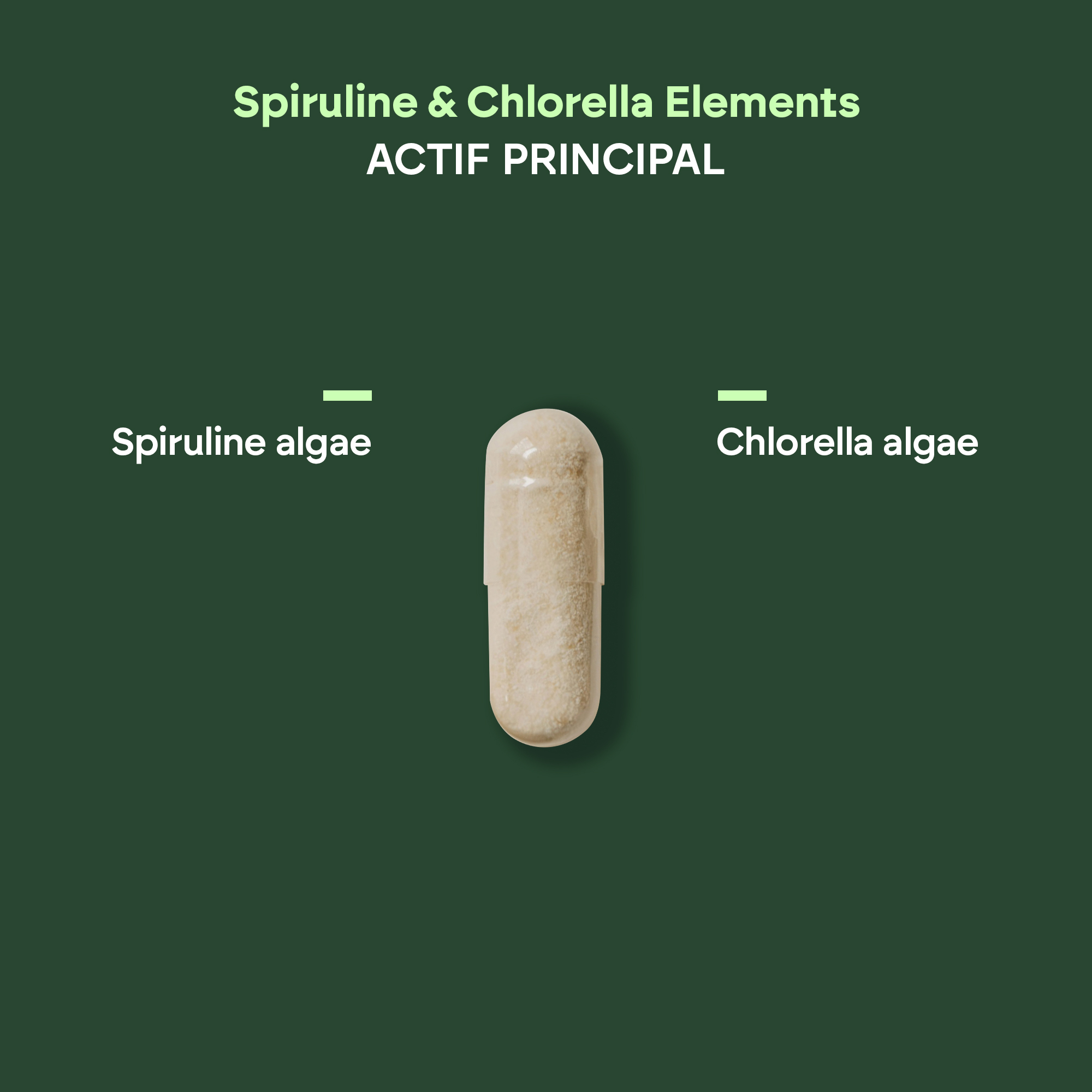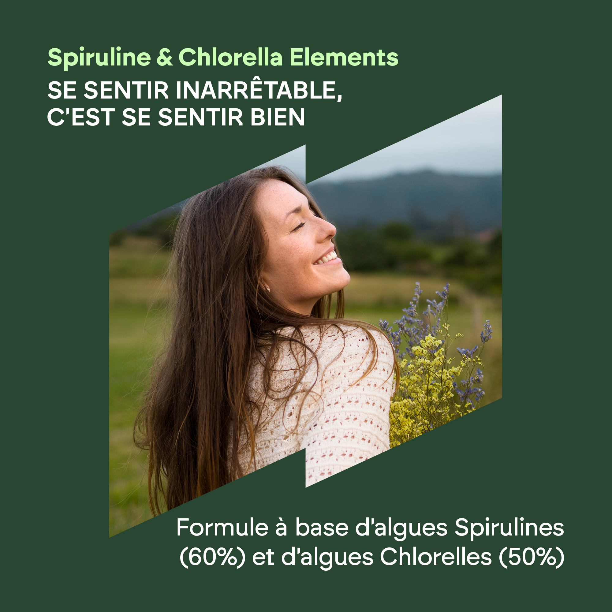 Spirulina & Chlorella Elements est un complément alimentaire à base d’algue spiruline (60 %) et d’algue chlorella (50 %).