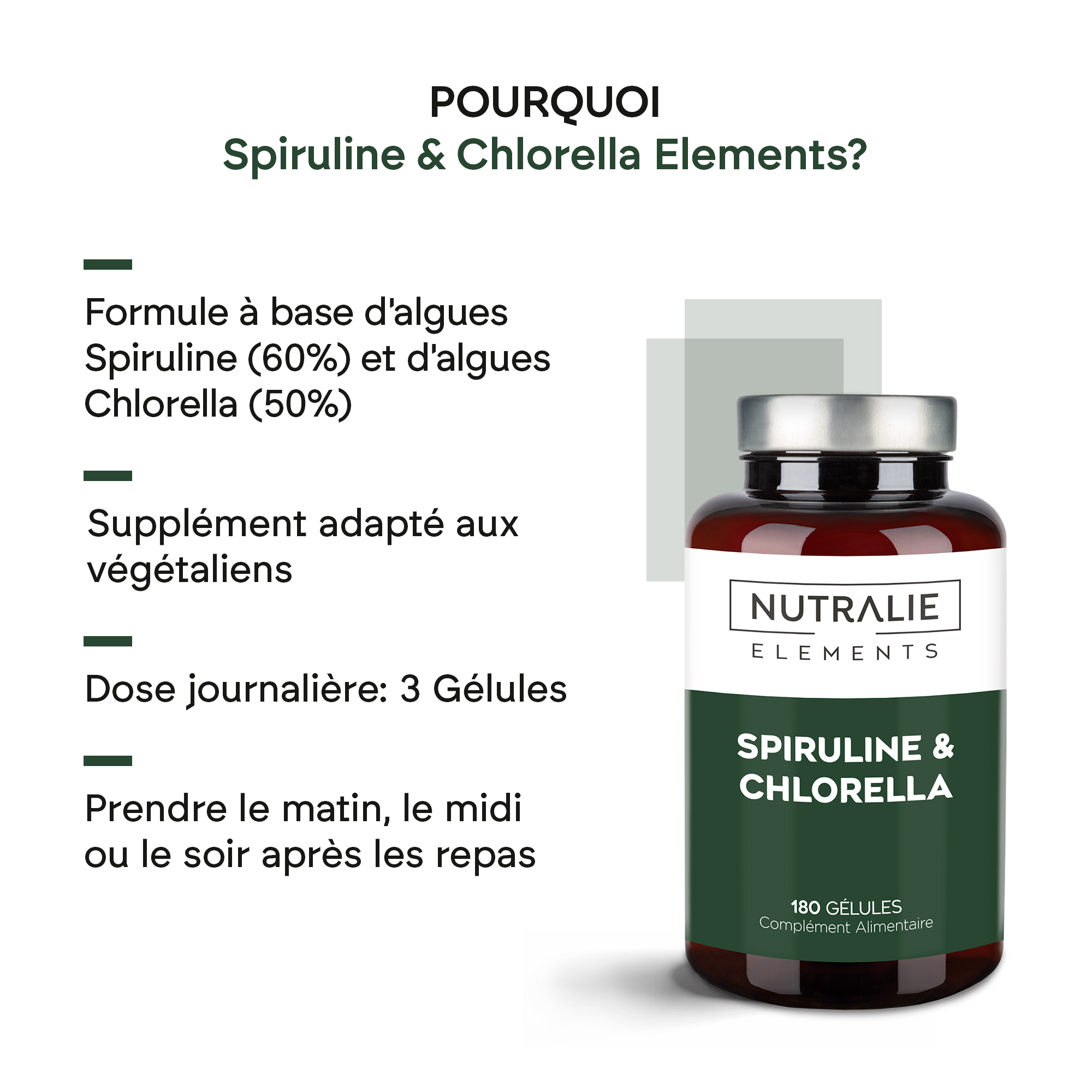 Spirulina & Chlorella Elements de Nutralie est présenté dans un flacon contenant 180 comprimés concentrés.