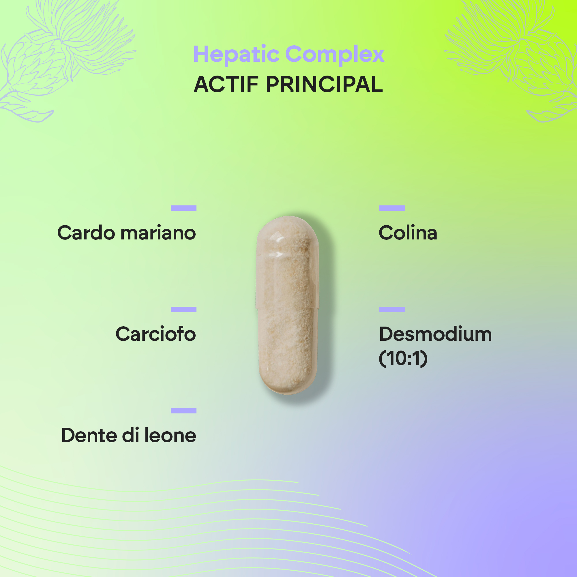 Le Complexe Hépatique Nutralie est élaboré à partir de chardon-Marie (silymarine et silbine), d’artichaut, de choline, de pissenlit et de desmodium. La choline présente dans sa formule contribue au maintien d’une fonction hépatique normale.
