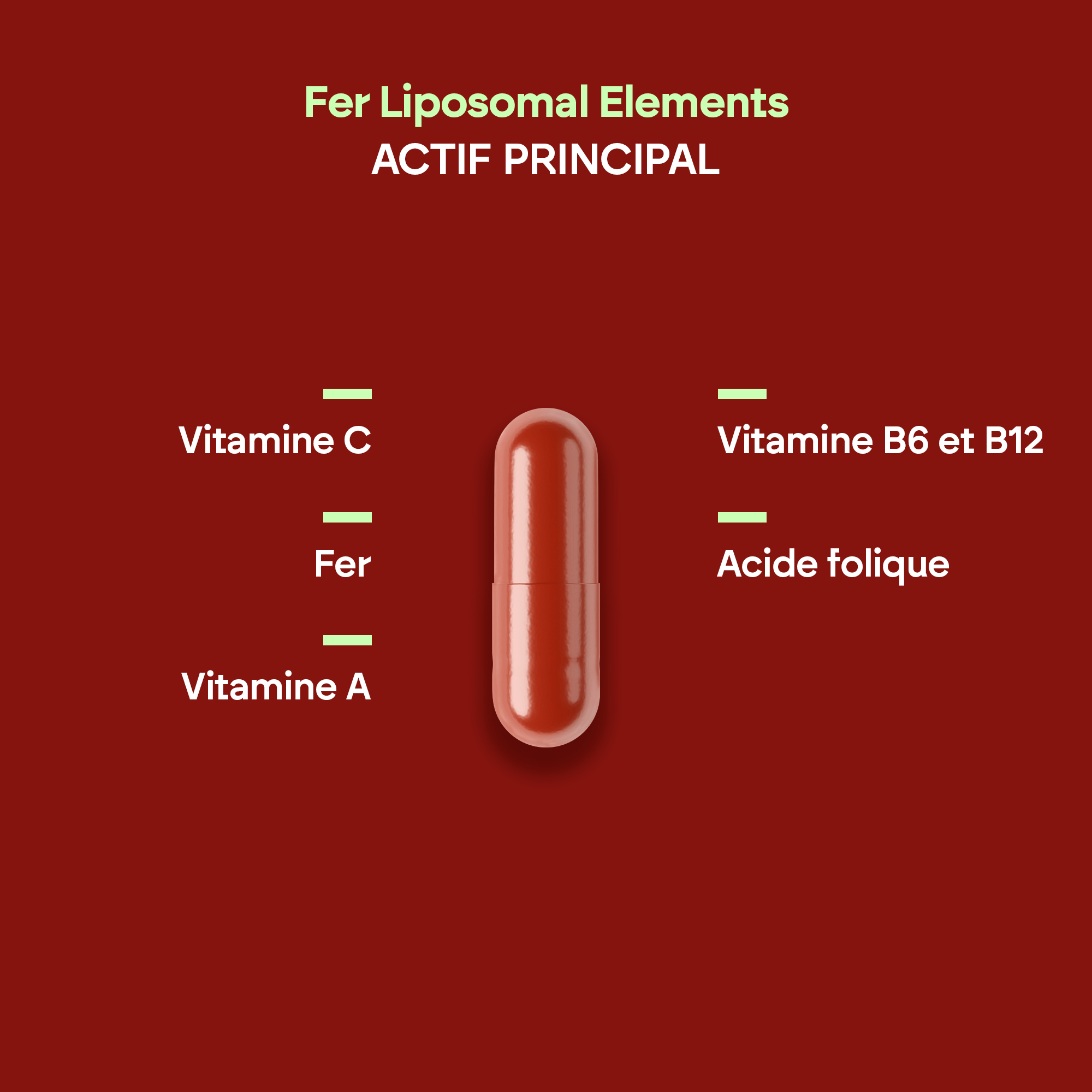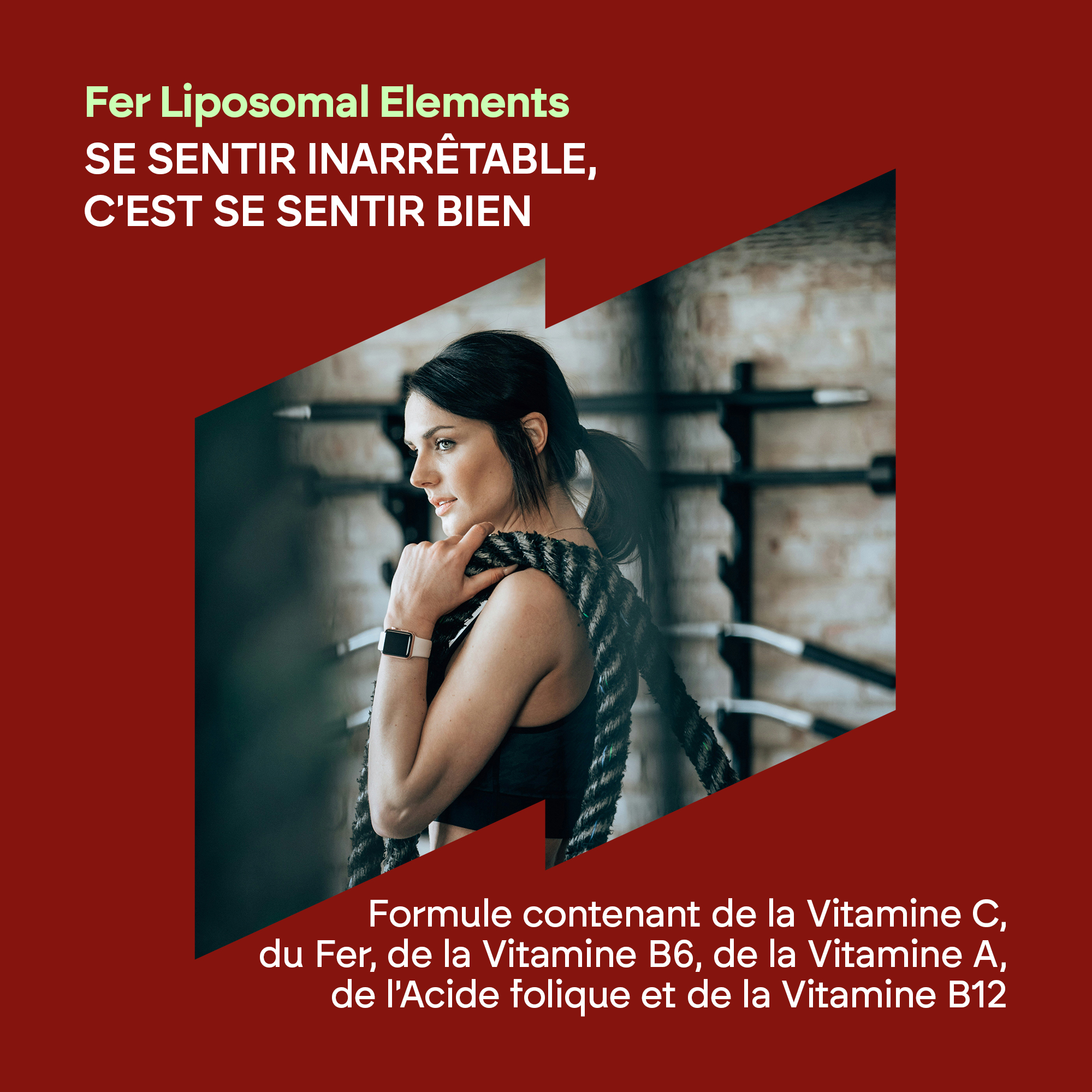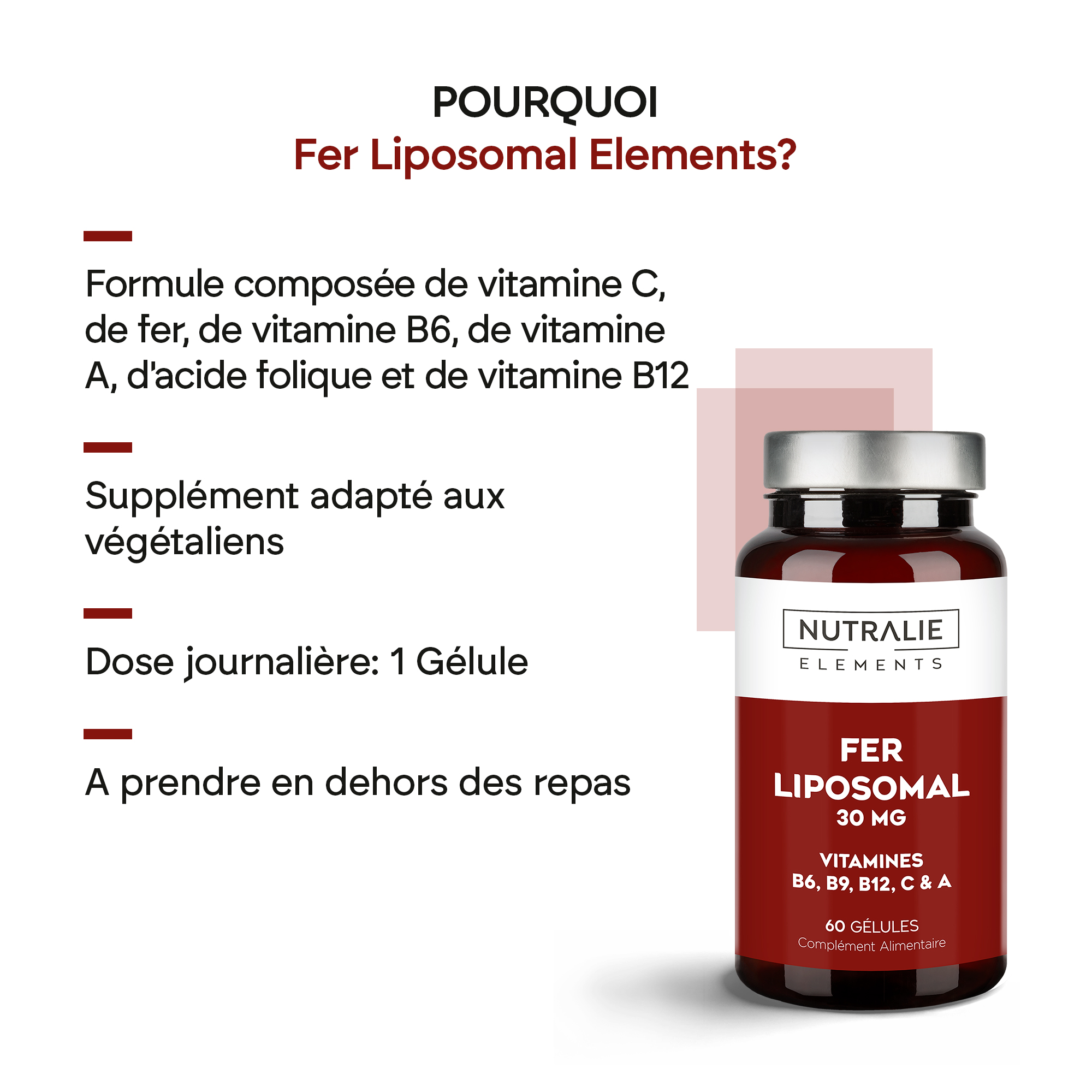 Nutralie Liposomal Iron Elements est un complément alimentaire à base de vitamine C, de fer, de vitamine B6, de vitamine A, d’acide folique et de vitamine B12.
