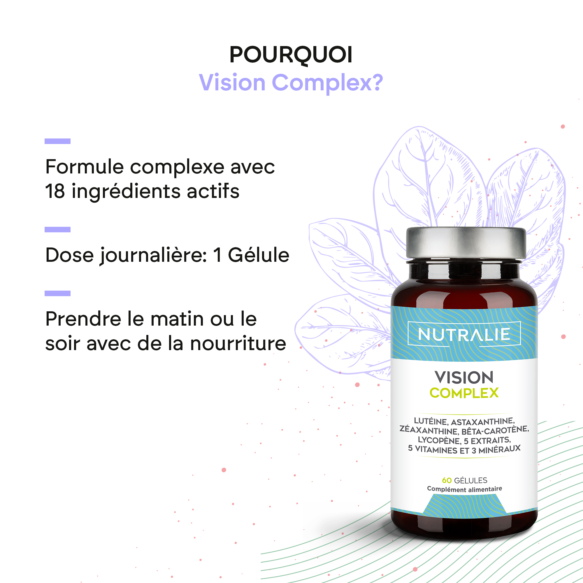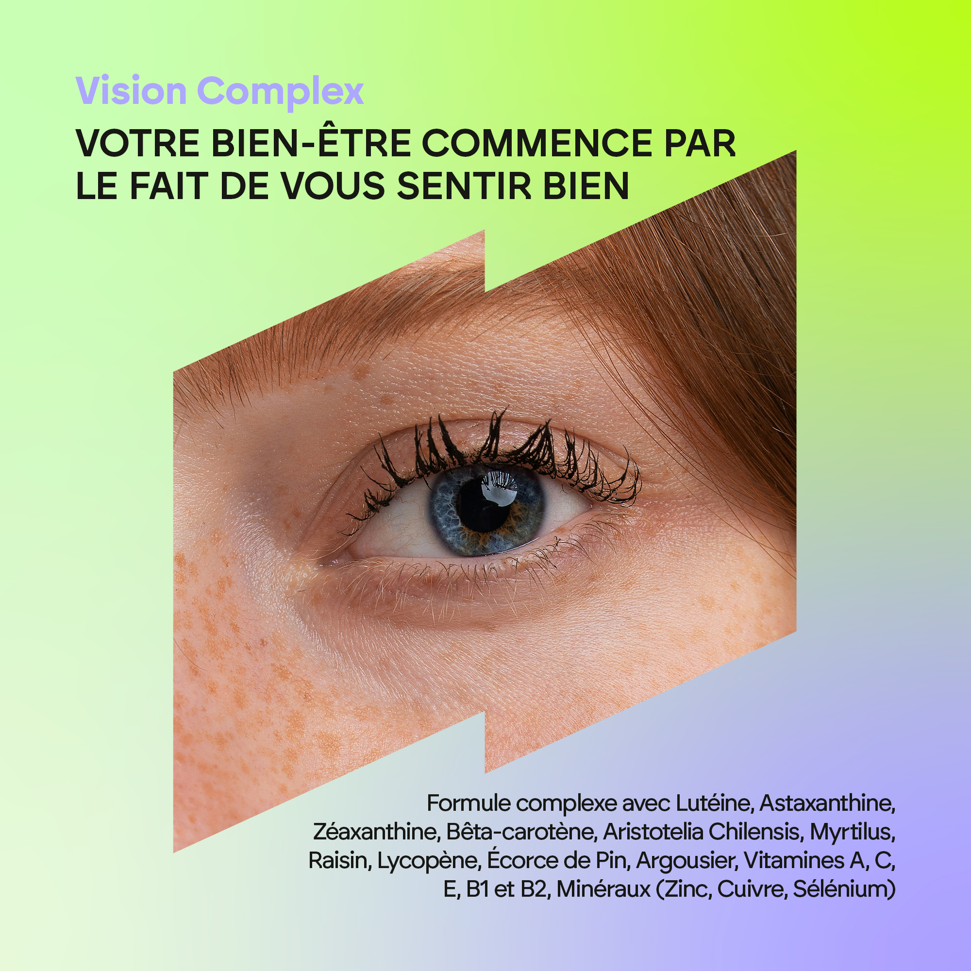 Vision Complex est un complément alimentaire à base de lutéine, d’astaxanthine, de zéaxanthine, de bêta-carotène, d’Aristotelia chilensis, de myrtille, de raisin, de lycopène, d’écorce de pin, d’argousier, de vitamines A, C, E, B1 et B2, et de minéraux (zinc, cuivre, sélénium).