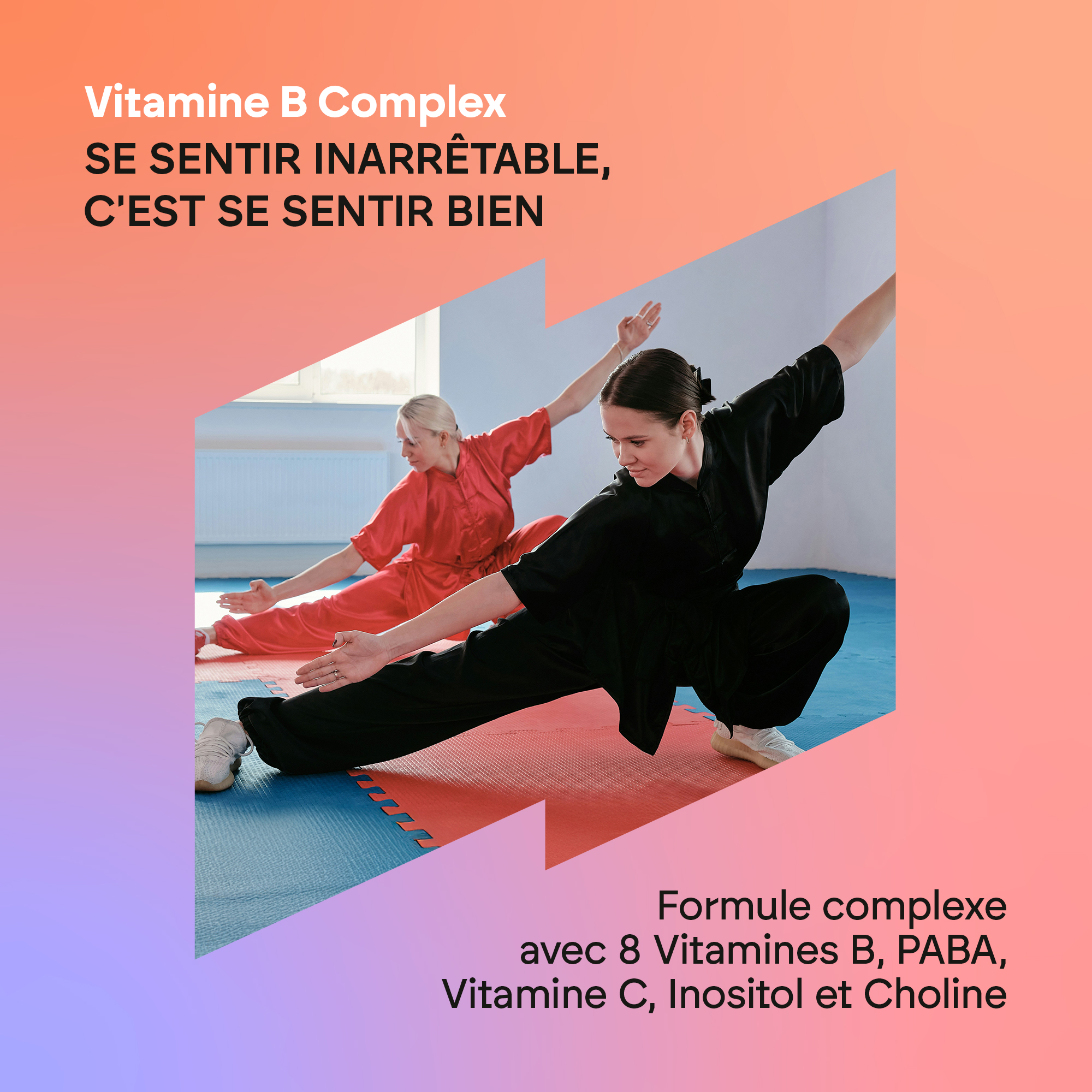 Bitartrate de choline, gélule [agent d'enrobage (hydroxypropylméthylcellulose)], agent de charge (cellulose microcristalline), vitamine C (acide L-ascorbique), inositol, PABA (acide para-aminobenzoïque), niacine (nicotinamide), thiamine (chlorhydrate de thiamine), riboflavine (riboflavine), acide pantothénique (D-pantothénate de calcium), vitamine B6 (chlorhydrate de pyridoxine), antiagglomérants (sels de magnésium d'acides gras et dioxyde de silicium), acide folique (acide ptéroylmonoglutamique), biotine (D-biotine), vitamine B12 (cyanocobalamine).