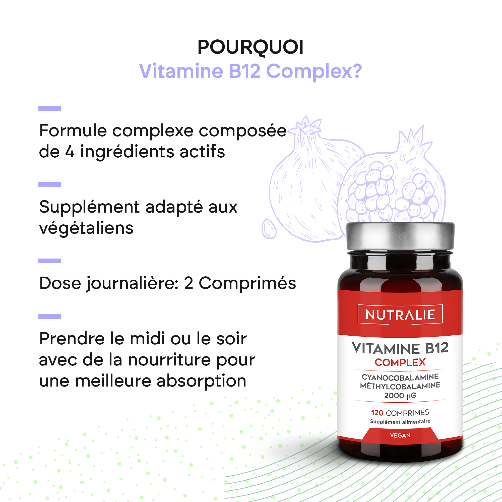 Le complexe Vitamine B12 de Nutralie contient de la vitamine B12 et de la vitamine B6, qui contribuent à la formation normale de globules rouges.