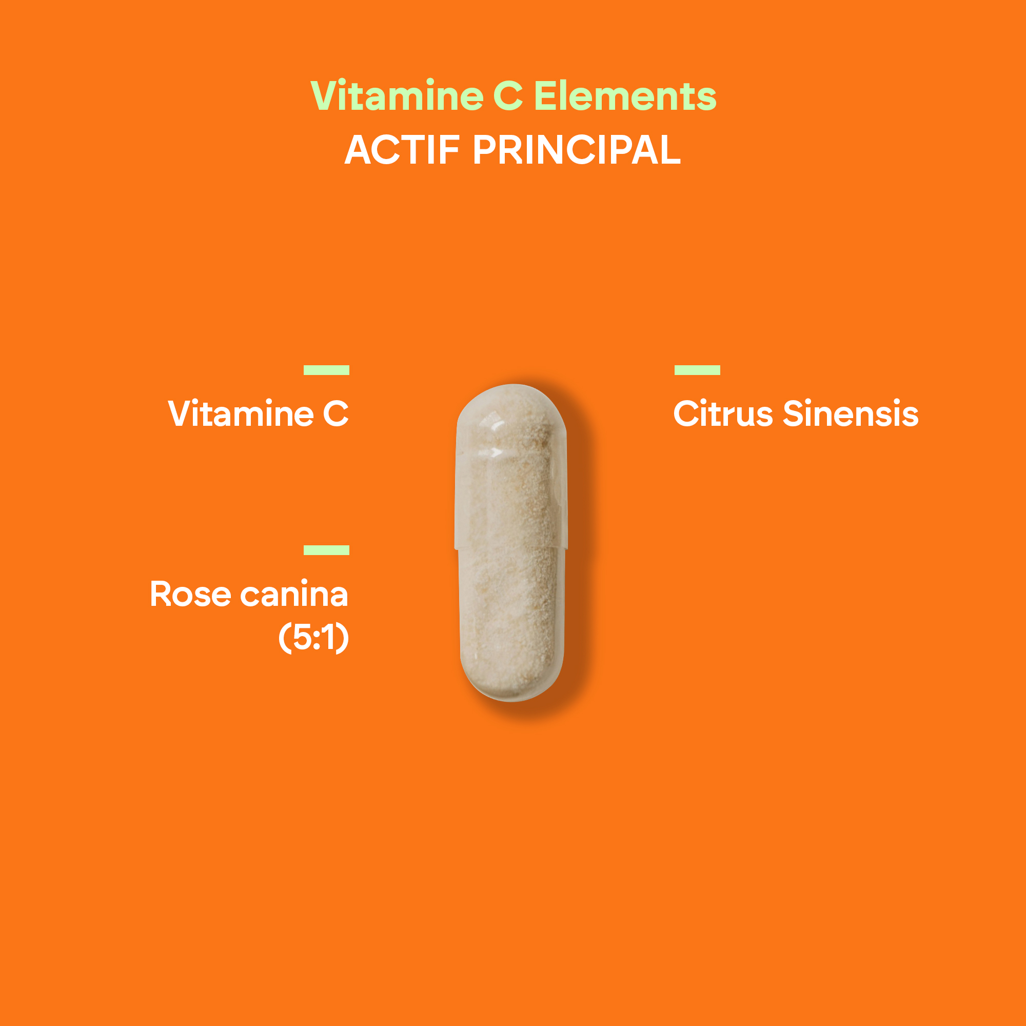 Acide L-ascorbique (vitamine C), extrait sec de Rosa canina L.(fruit), gélule (agent d'enrobage: hydroxypropylméthylcellulose),agent de charge (cellulose microcristalline), extrait sec de Citrus sinensis (L.) Osbeck, (fruit), antiagglomérants (sels de magnésium d'acides gras et dioxyde de silicium).