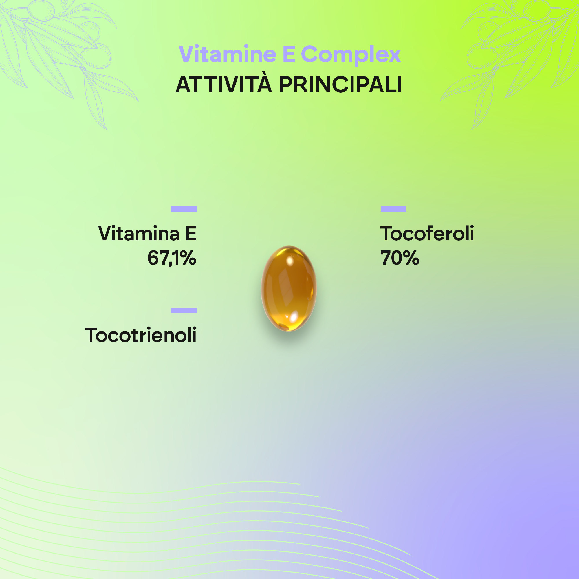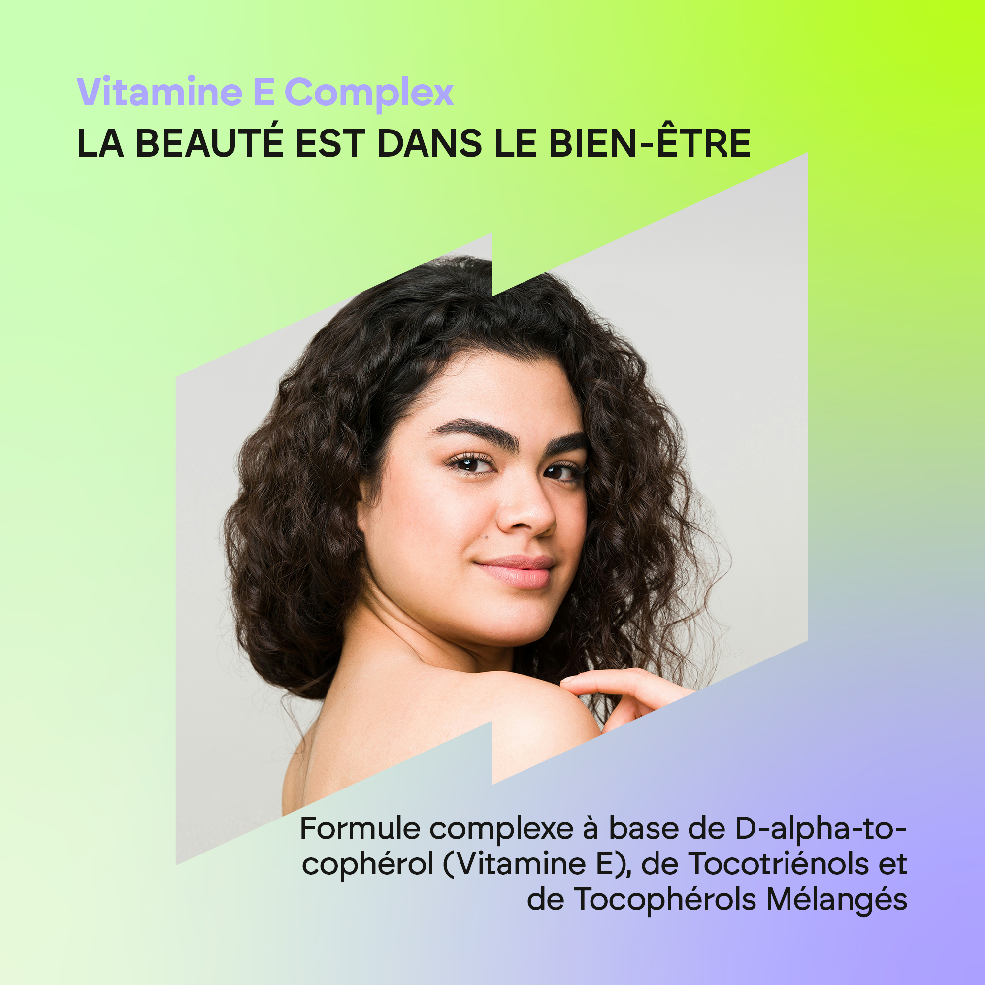 Vitamin E Complex est un complément alimentaire à base de D-alpha-tocophérol (vitamine E), de tocotriénols et d'un mélange de tocophérols.