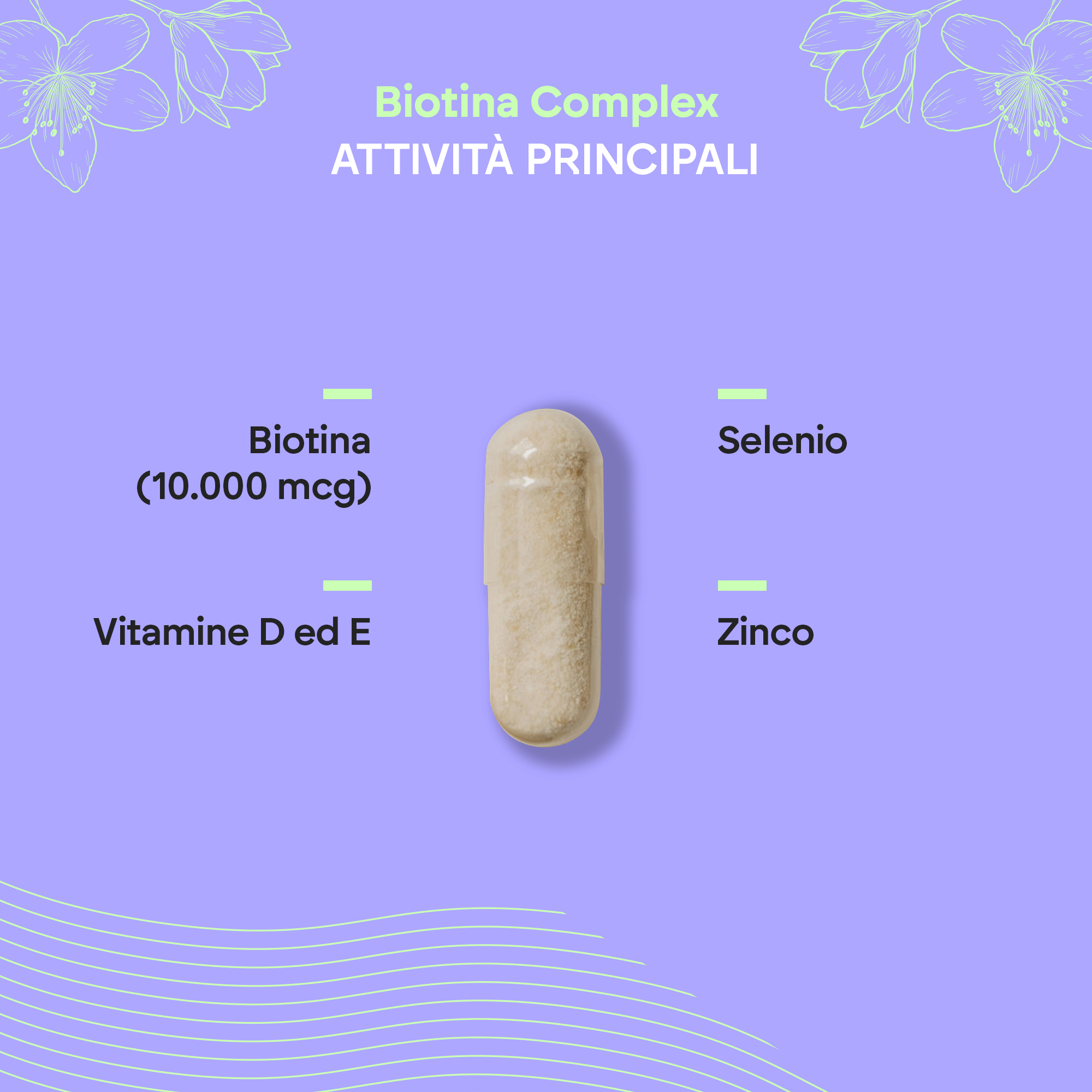 Biotin Complex di Nutralie contiene una dose di biotina pari a 10.000 mcg, insieme a zinco, selenio e vitamine D ed E. La biotina, lo zinco e il selenio contribuiscono al mantenimento dei capelli in condizioni normali.