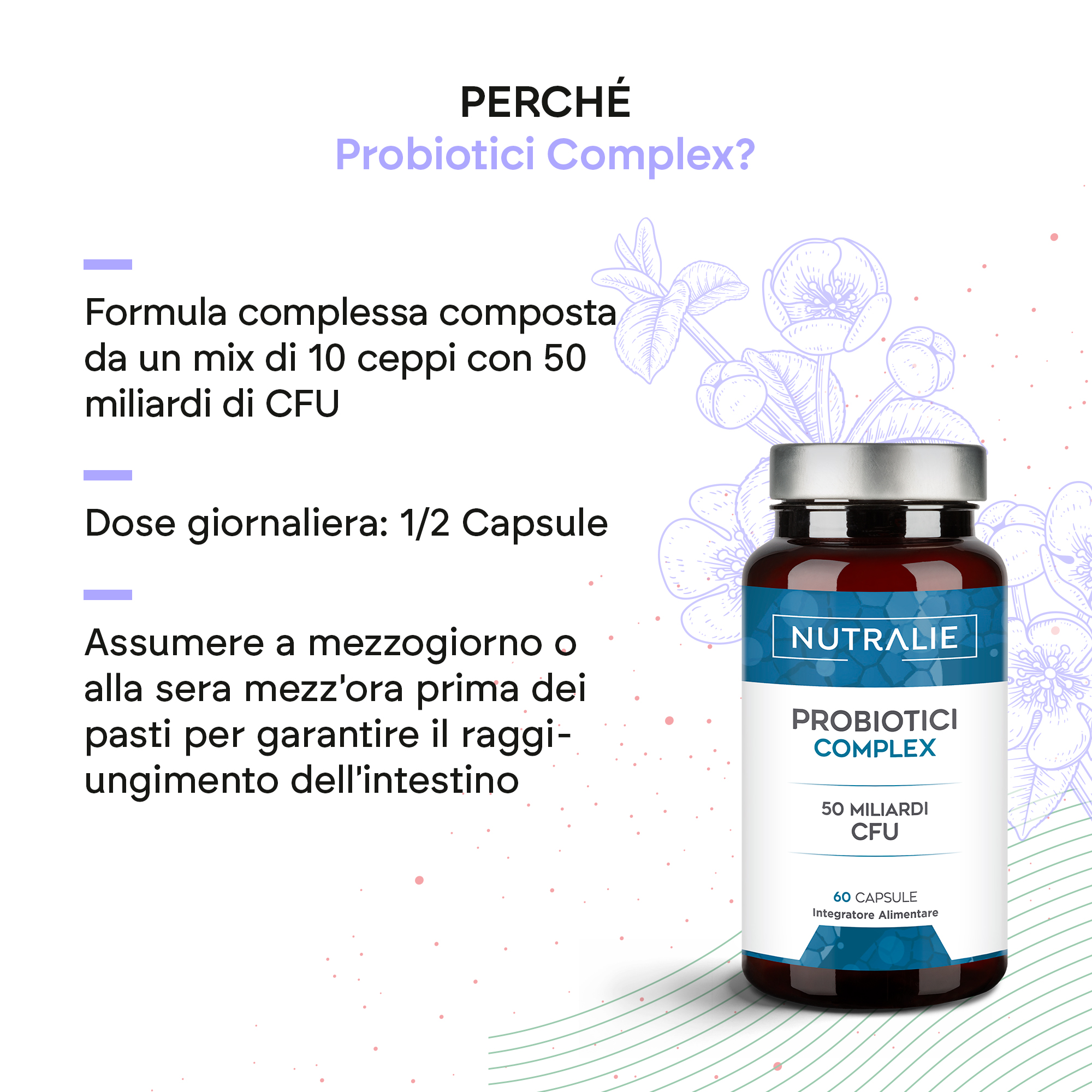 Biprotics Complex di Nutralie è un integratore alimentare naturale con una combinazione di 10 ceppi. Questa combinazione fornisce 50 miliardi di UFC garantiti per tutta la durata di conservazione del prodotto. Biprotics Complex contiene ceppi appartenenti al gruppo dei lattobacilli e dei bifidobatteri.