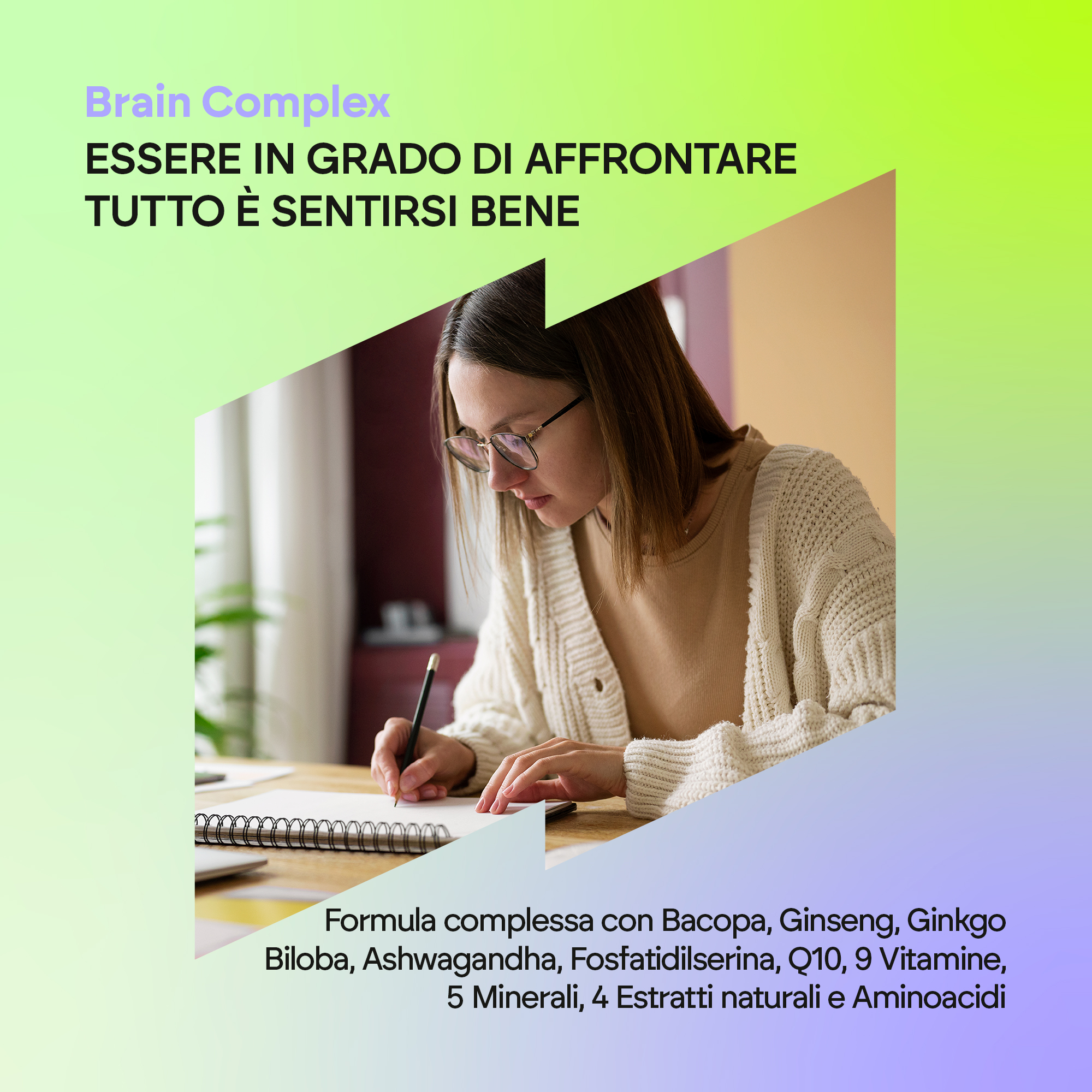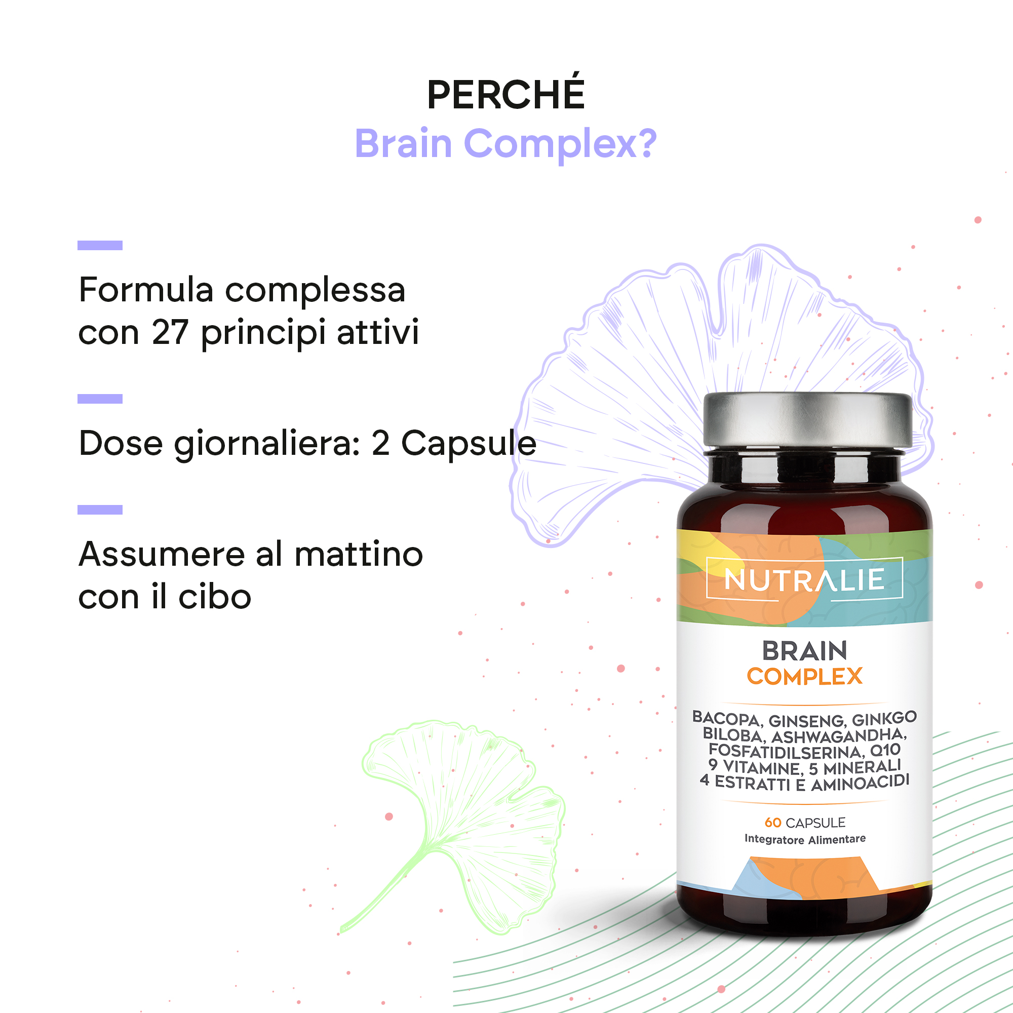 Brain Complex di Nutralie è stato sviluppato con 24 principi attivi, tra cui estratti di Bacopa Monnieri, Ginseng, Ginkgo Biloba, Ashwagandha, Fosfatidilserina, Coenzima Q10, 9 vitamine, 5 minerali e aminoacidi.