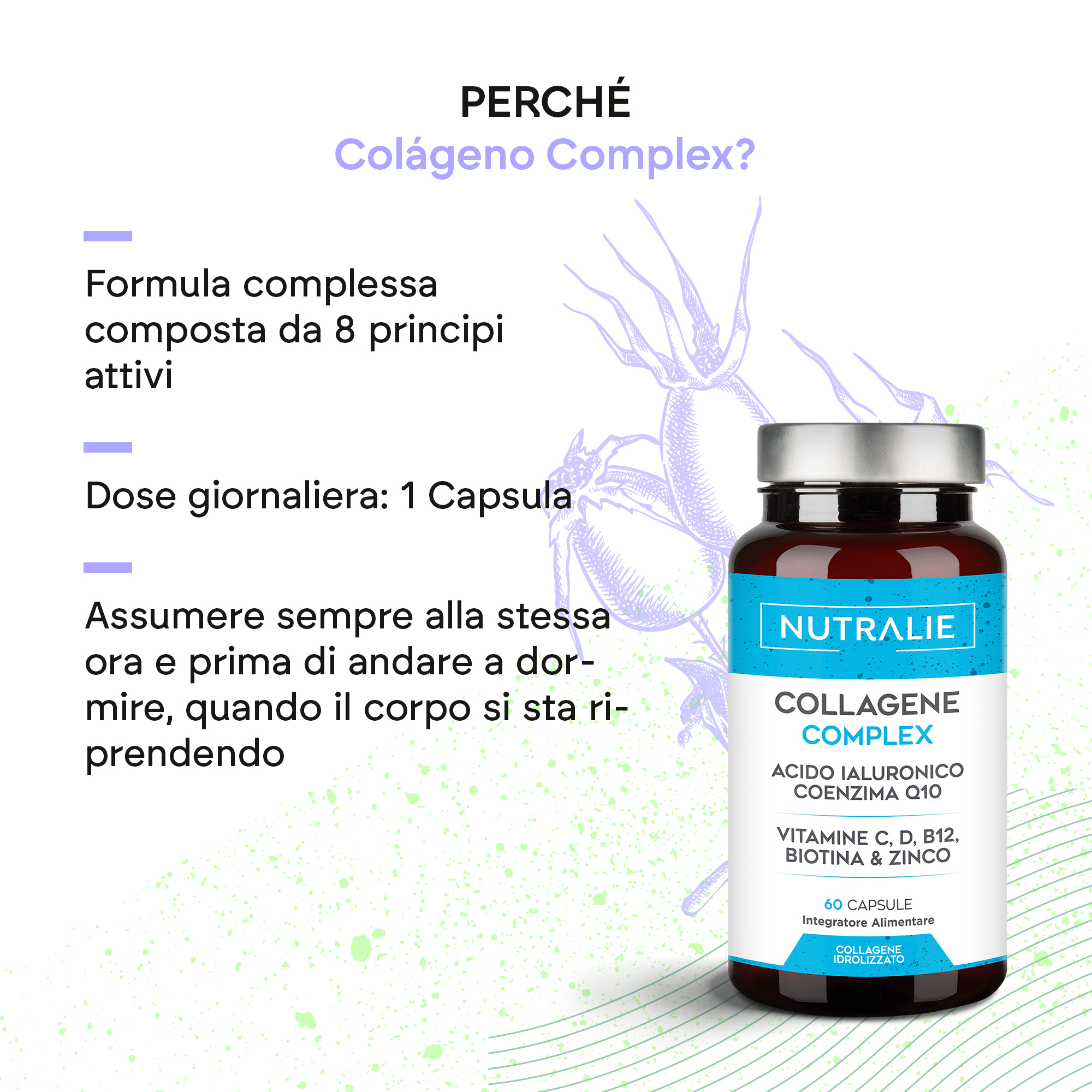 Nutralie Collagen Complex contiene 370 mg di collagene idrolizzato per capsula. Il prodotto contiene anche vitamine C, D e B12, biotina, zinco, coenzima Q10 e acido ialuronico.