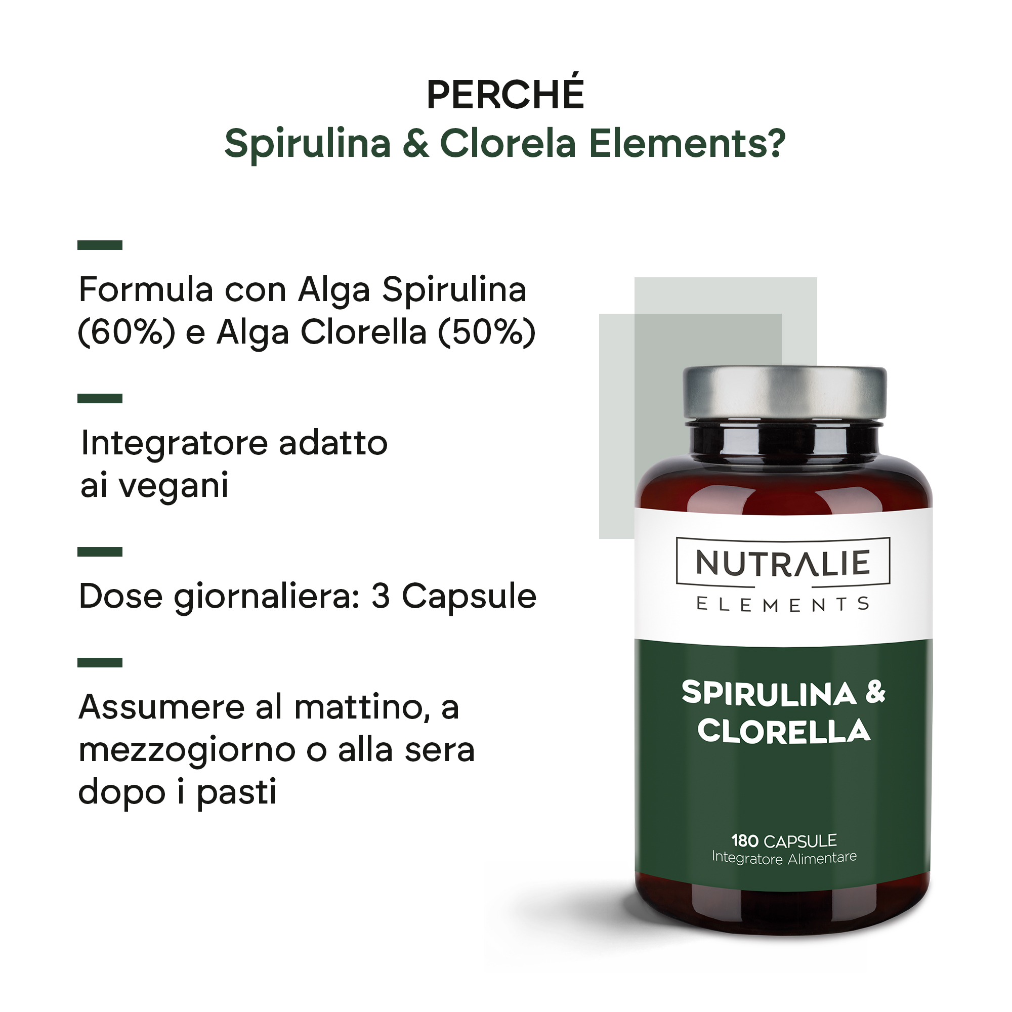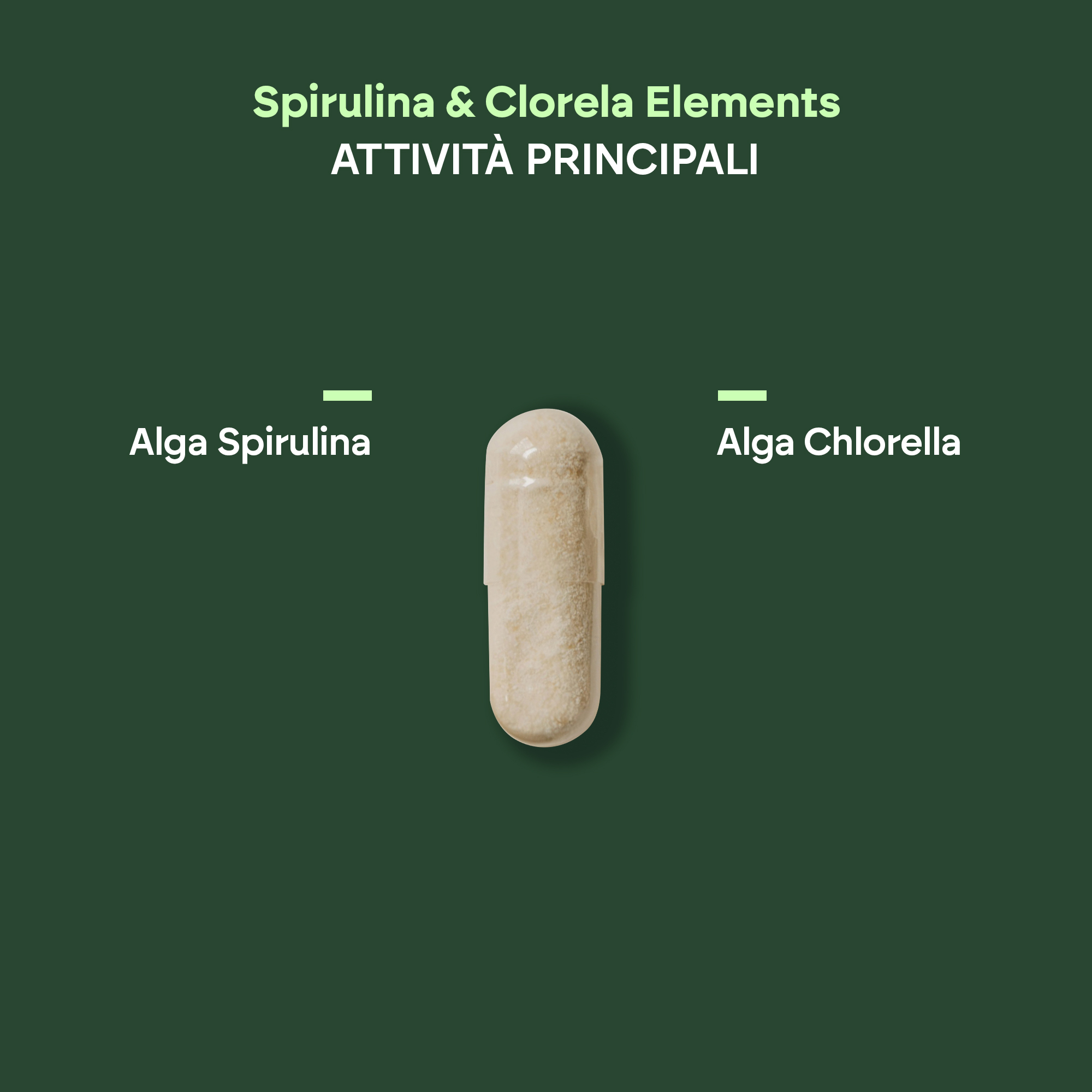 polvere di alga spirulina (Spirulina platensis (Gomont) Geitler, alga unicellulare), polvere di alga clorella (Chlorella pyrenoidosa H. Chick, alga unicellulare), capsula: agenti di rivestimento (idrossipropilmetilcellulosa), agenti di carica (fosfati di calcio), agenti antiagglomeranti (biossido di silicio e sali di magnesio degli acidi grassi).