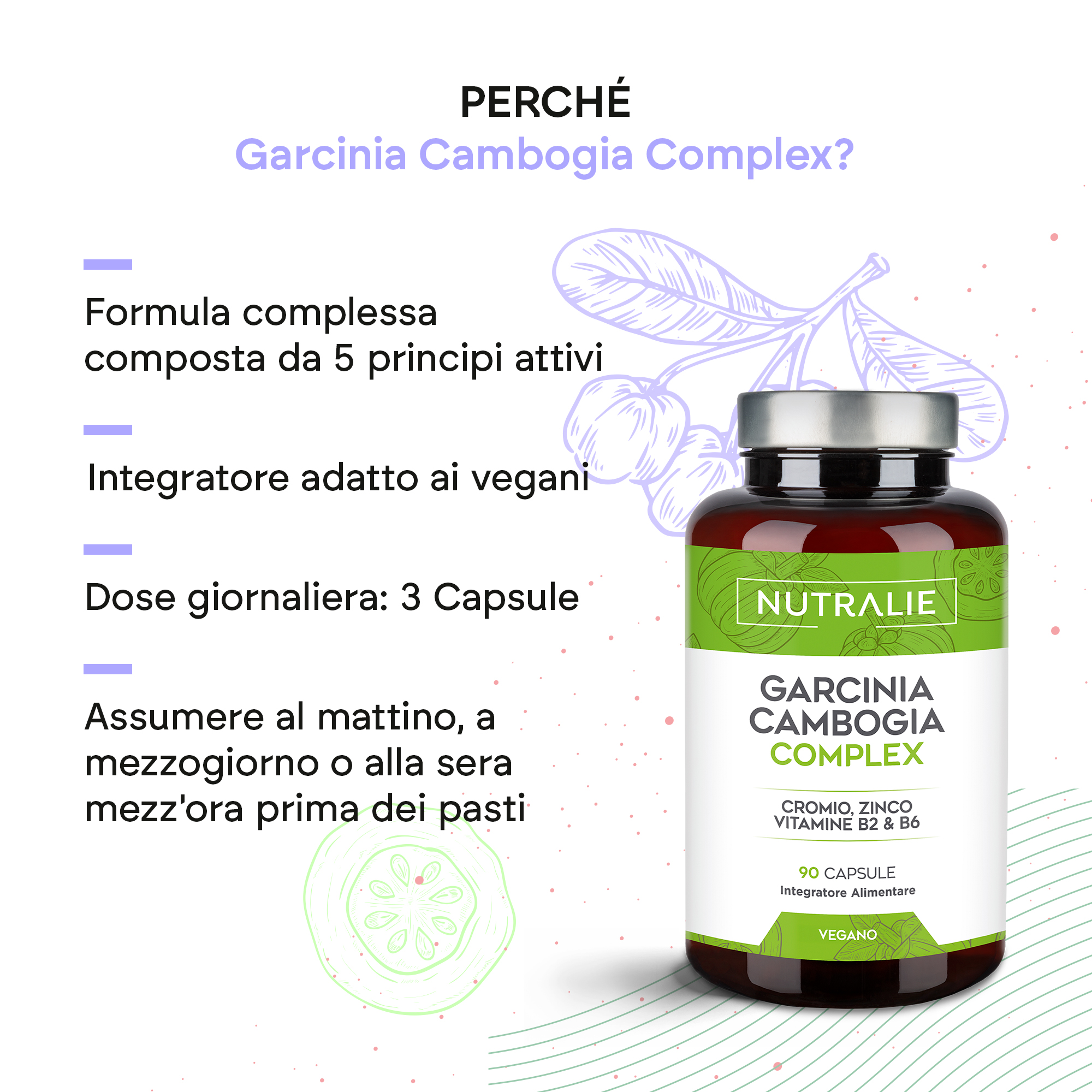 L’integratore Garcinia Cambogia Complex è ricavato da un frutto originario delle foreste pluviali del Sud-Est asiatico. Il nostro Garcinia Cambogia Complex contiene anche zinco, che contribuisce al normale metabolismo dei carboidrati, e vitamine B2 e B6, che contribuiscono al normale metabolismo energetico.