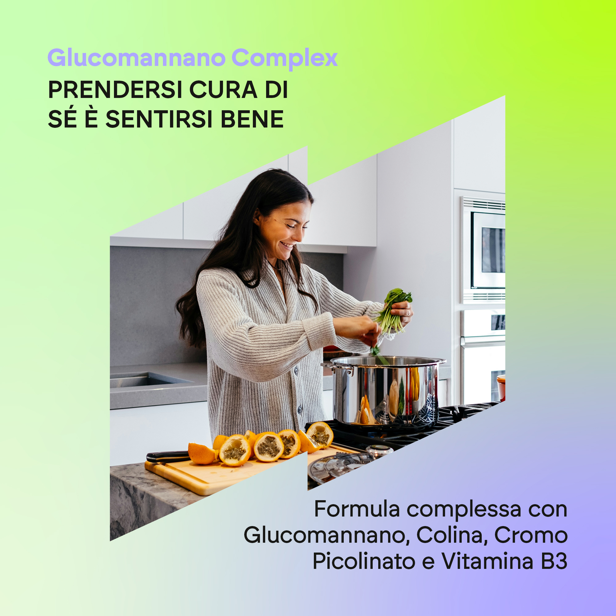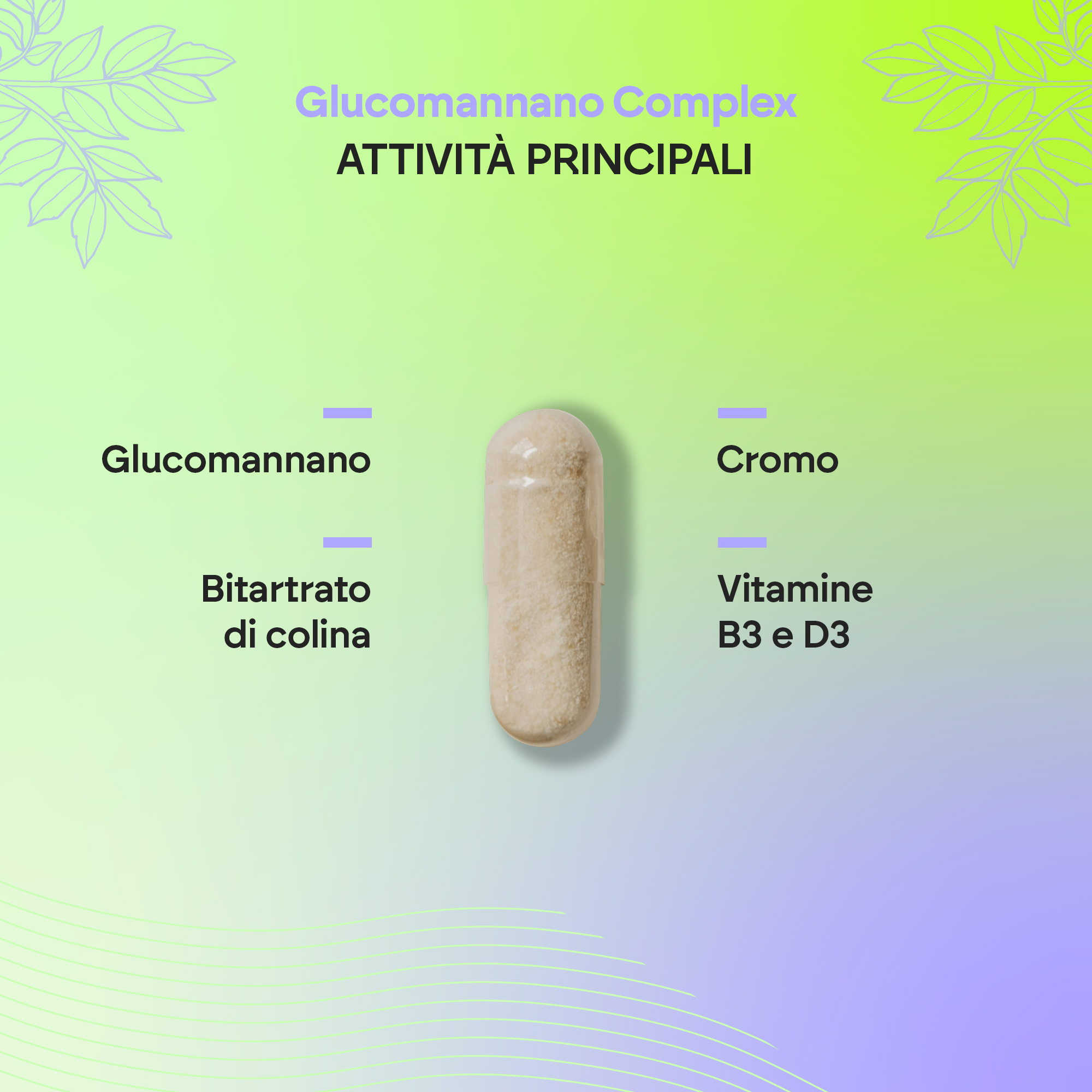 Glucomannano, capsula: agente di rivestimento (idrossipropilmetilcellulosa), bitartrato di colina, agente di carica (cellulosa microcristallina), aroma naturale, agenti antiagglomeranti (biossido di silicio e stearato di magnesio), nicotinamide (niacina), picolinato di cromo, colecalciferolo (vitamina D).