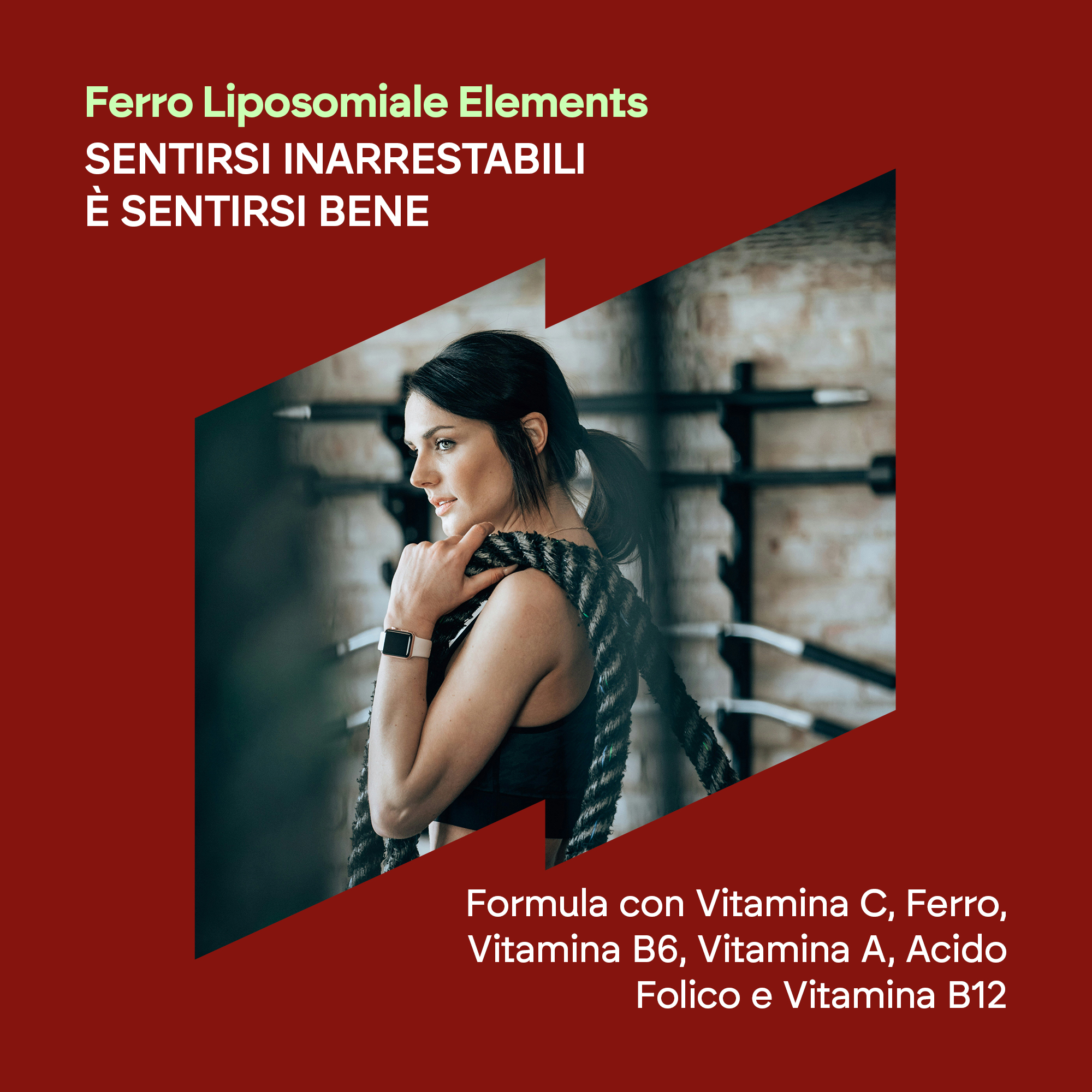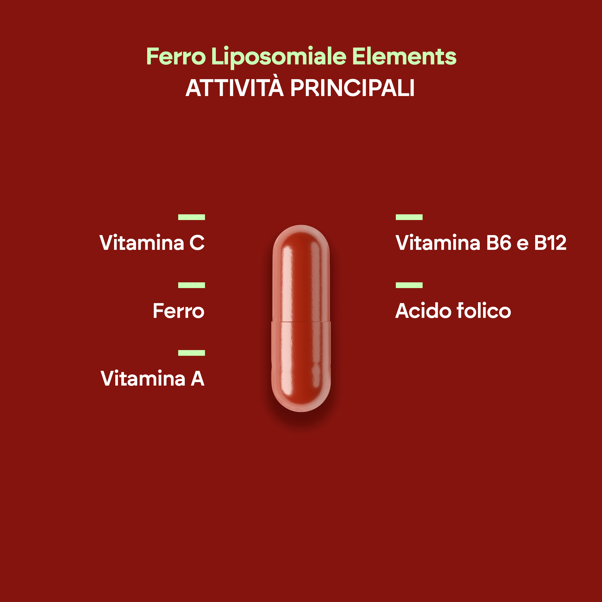 Ferro liposomizzato (pirofosfato ferrico), capsula [agente di rivestimento (idrossipropilmetilcellulosa), colorante (ossidi di ferro)], agente di carica (cellulosa microcristallina), vitamina C (acido L-ascorbico), vitamina A (acetato di retinile), agenti antiagglomeranti ( sali di magnesio degli acidi grassi, biossido di silicio), vitamina B6 (cloridrato di piridossina), acido folico (acido pteroilmonoglutammico), vitamina B12 (cianocobalamina).